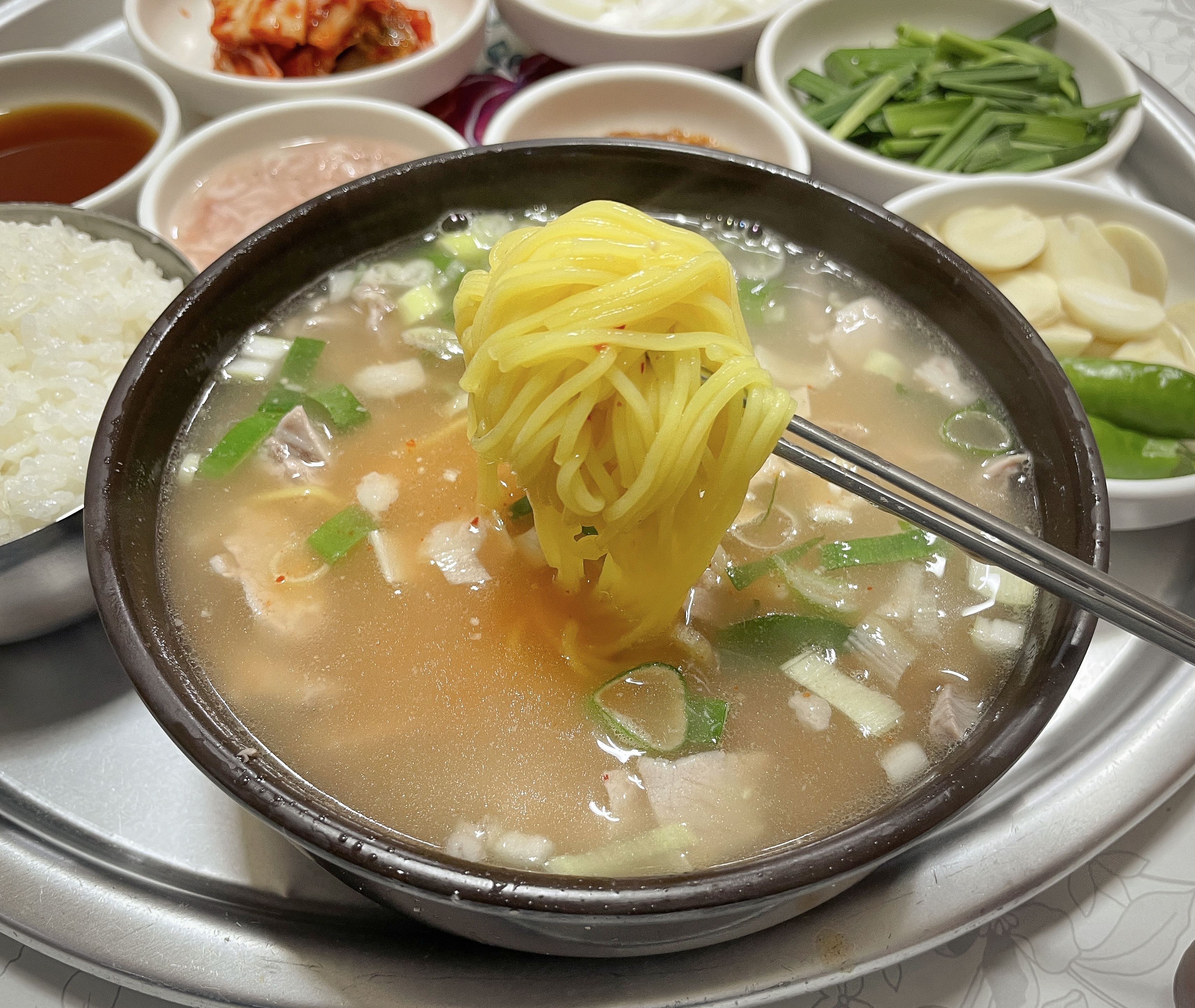 먼저 국물 위의 양념장을 풀어준 다음 소면을 건져먹었습니다. 그다음에 부추를 얹은 다음 국밥을 먹었는데, 돼지고기도 부드러운 편이었고, 군위식당의 국물은 고기 국밥인데 무겁지 않은 깔끔한 느낌이었습니다.