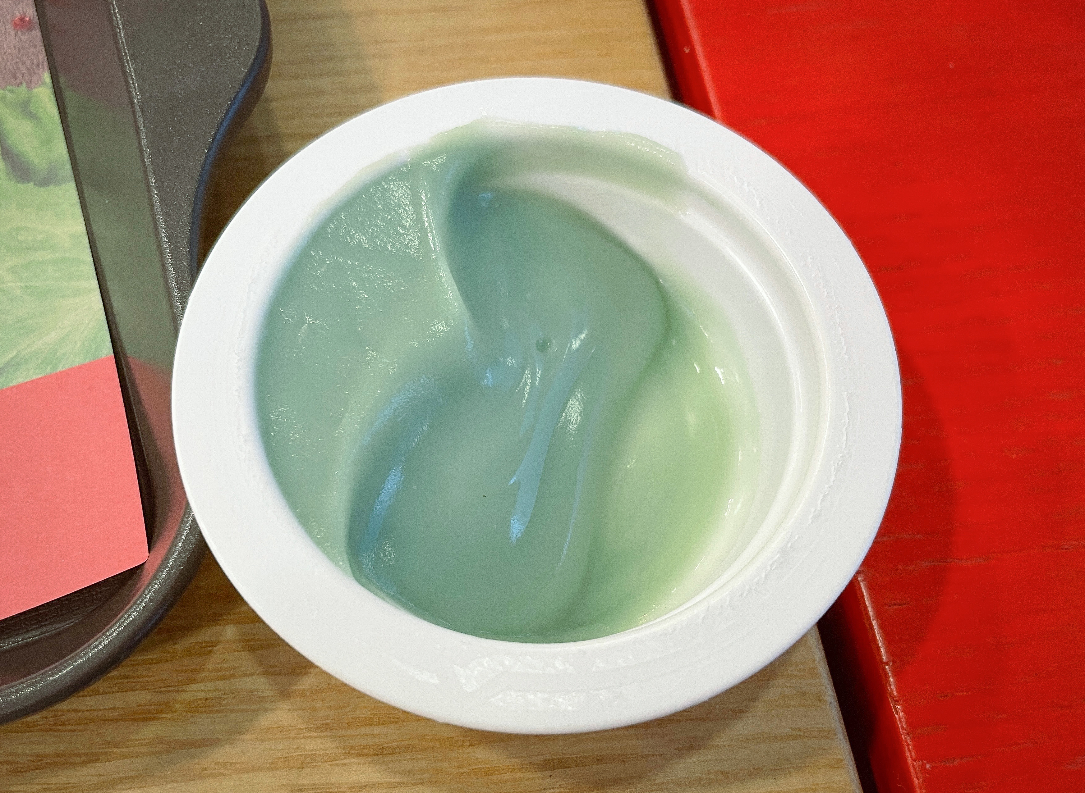 색깔은 마치 네모바지 스펀지밥의 징징이를 녹여서 만든 것 같은 옅은 민트색을 띠고 있었습니다. 맛이야 앞서 설명드린 것처럼 민트초코 아이스크림 먹는 맛이었고, 민트초코 아이스크림의 경우 초콜릿 알갱이가 씹히는 반면 민트초코 디핑소스는 부드러운 크림형태의 소스라 찍어먹기에 더 좋았습니다.