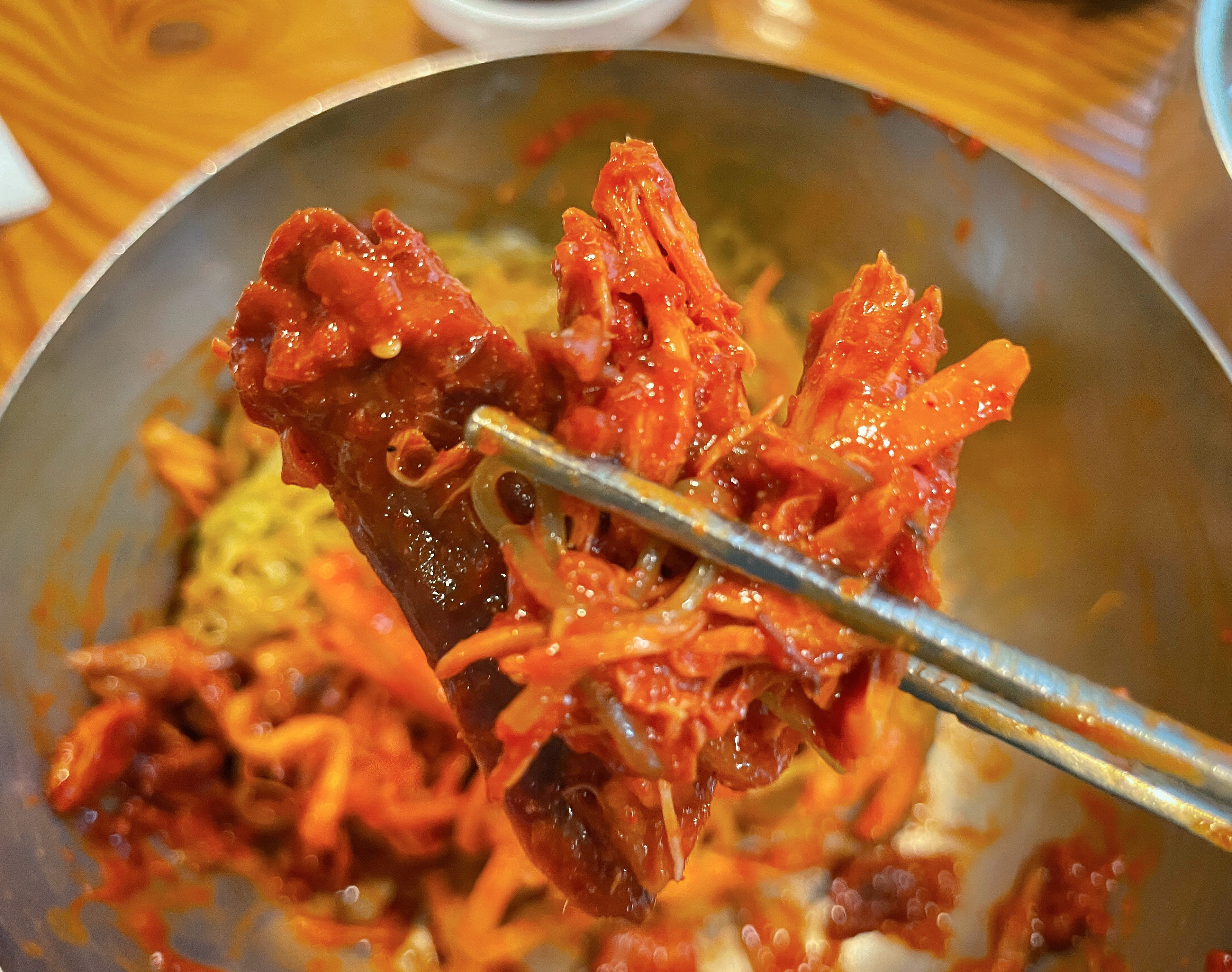꿩냉면의 꿩고기도 제법 많이 들어있었습니다. 꿩고기의 식감부터 설명하자면 통조림 참치, 닭가슴살을 먹는 것처럼 약간 뻑뻑한 게 특징입니다. 약간 닭 육포 같은(?) 느낌도 들었습니다. 꿩고기 자체의 약간 시큼한 맛이 있지만 가게 사장님의 노하우로 시큼한 맛을 잡았다고 합니다.