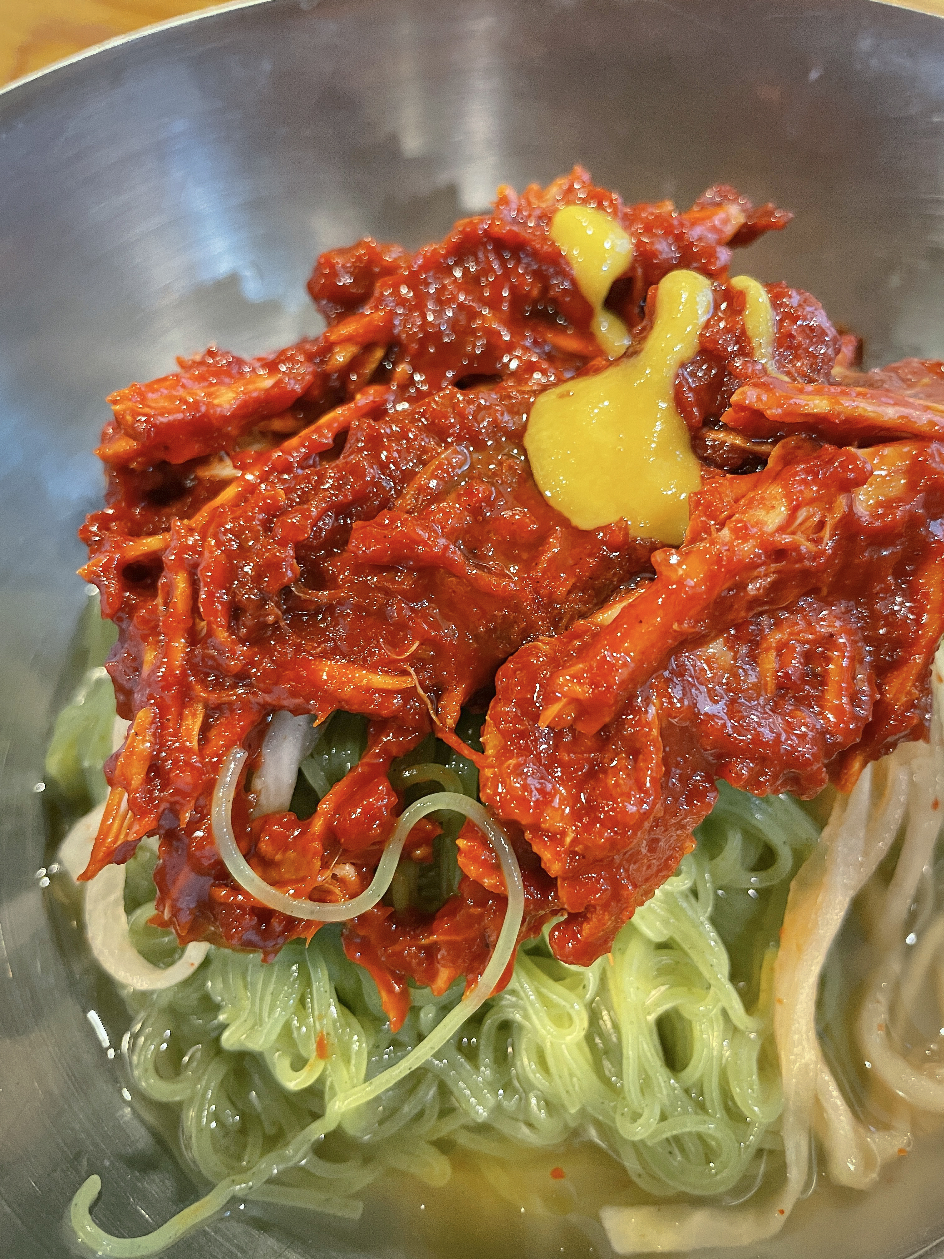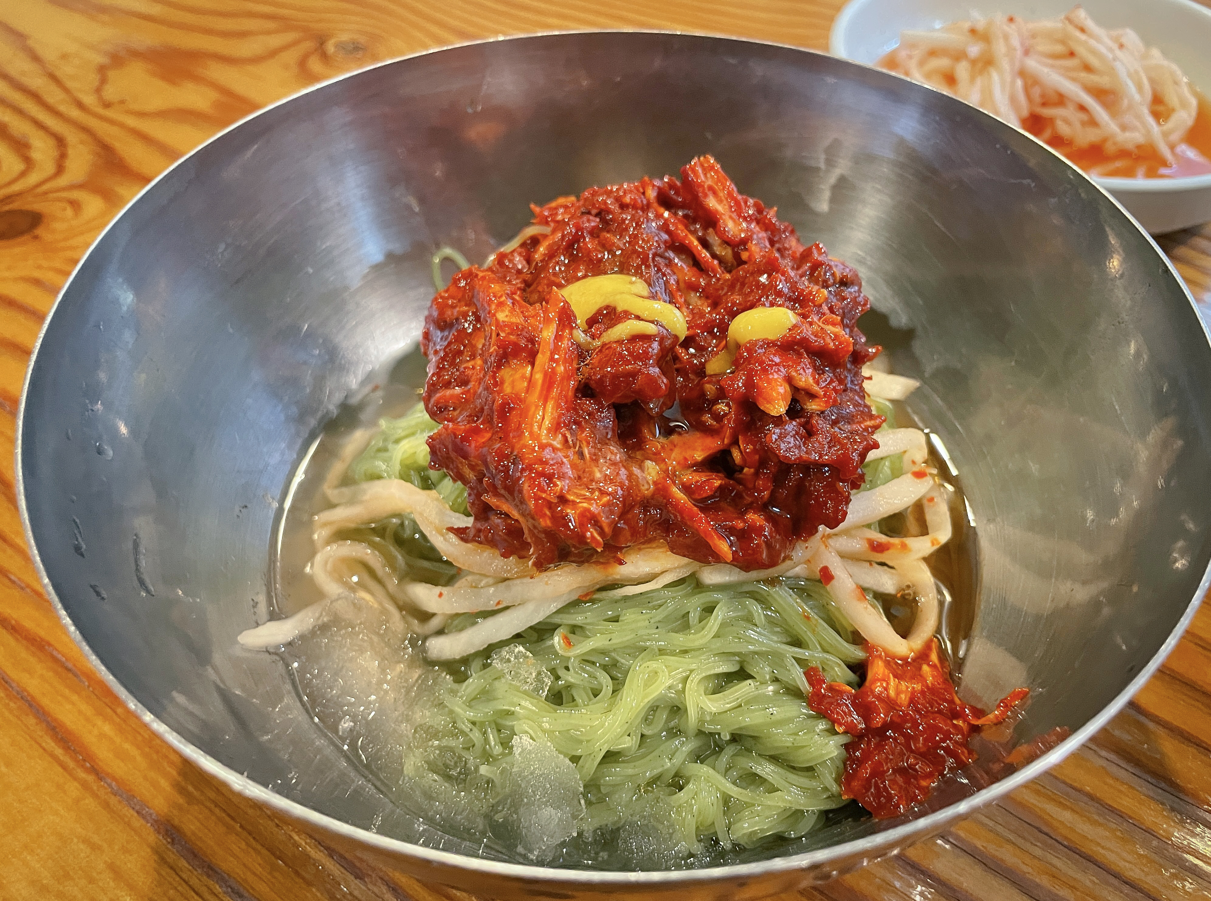왕십리 꿩칼국수 가게의 면 종류는 야콘을 이용해 만든 냉면으로 쫄깃하면서도 퍼지지 않는 면발이 특징이었습니다. 새초롬하게 무쳐낸 꿩고기와 비빔장은 겨자를 살짝 첨가해서 먹으면 더 좋았습니다. 기호에 따라서 따로 가져다준 냉육수를 부어서 먹어도 되었습니다.