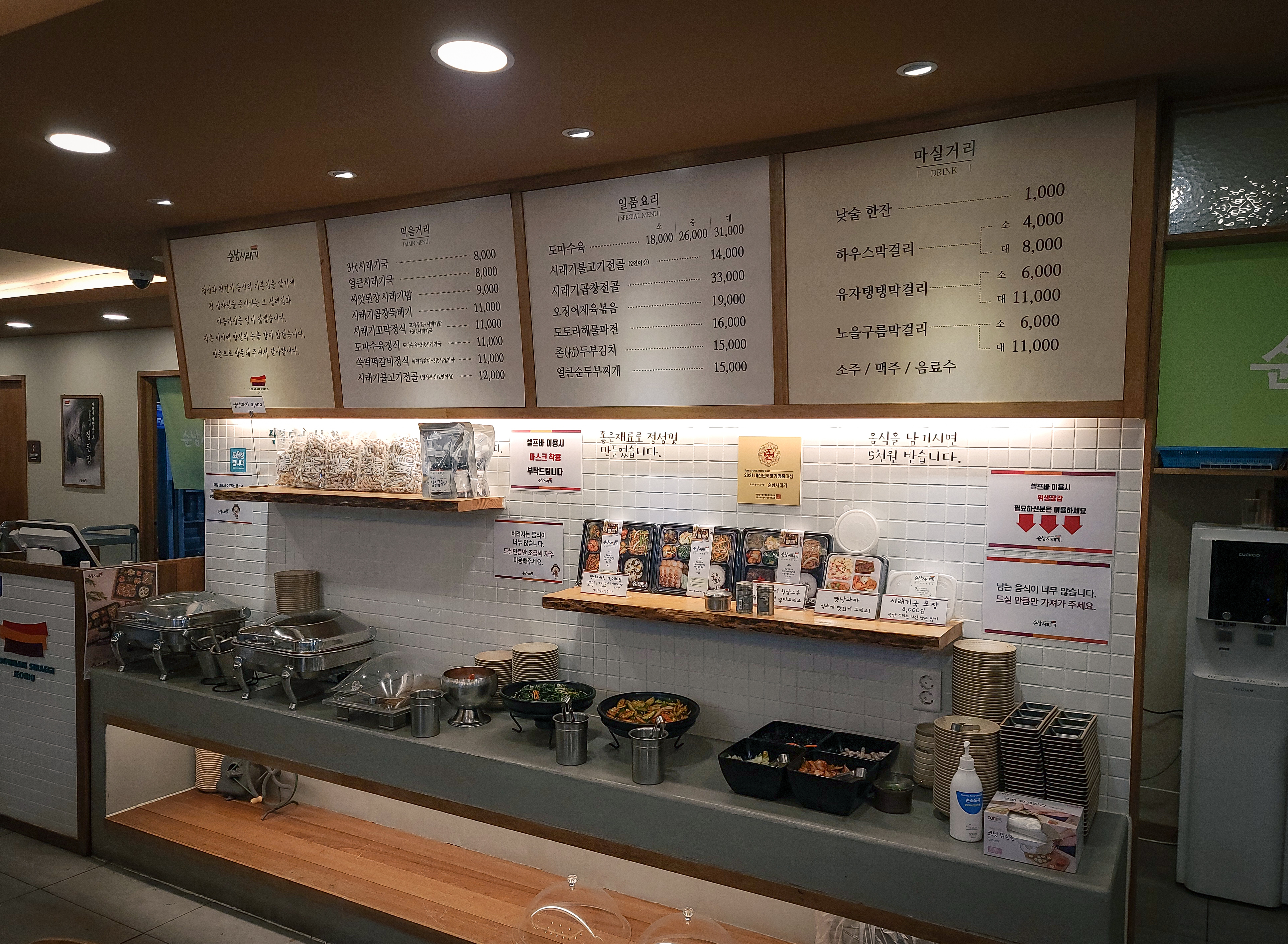 순남시래기의 메뉴는 시래기꼬막정식, 3代시래기국, 얼큰시래기국, 씨앗된장시래기밥, 시래기곱창뚝배기, 시래기불고기전골, 도마수육정식, 쑥떡갈비정식, 도마수육, 오징어제육볶음, 얼큰순두부찌개, 시래기곱창전골, 도토리해물파전, 촌두부김치, 쑥떡떡갈비, 메밀전병 등이 있었습니다. 저희는 시래기곱창뚝배기 2인분을 주문하였습니다.