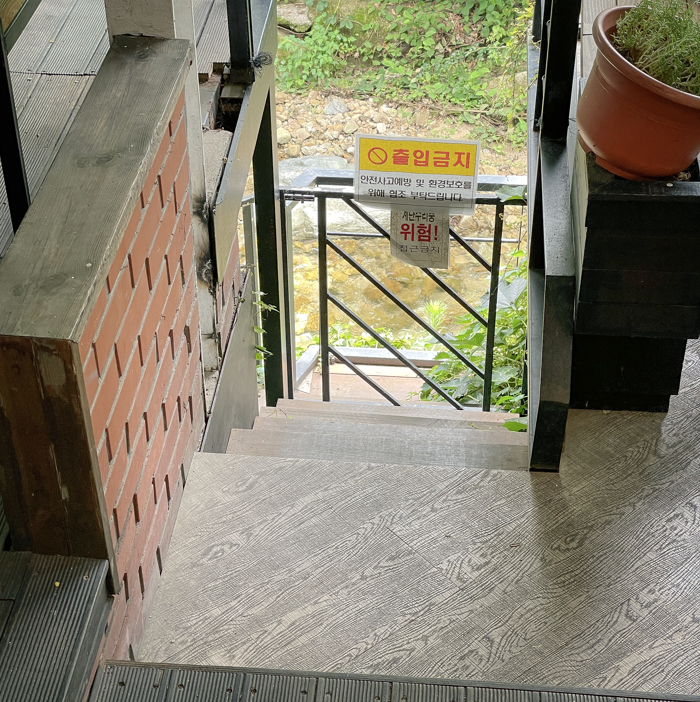 식사를 마치고 나오는데 계곡 쪽으로 난 계단은 안전사고와 환경보호를 이유로 출입이 금지되어 있었습니다. 그래도 오랜만에 계곡을 바라보며 식사하니 기분도 전환되고 무엇보다도 12,000원이라는 저렴한 가격에 경치 좋은 곳에서 식사했다는 것에 만족스러운 하루였습니다.