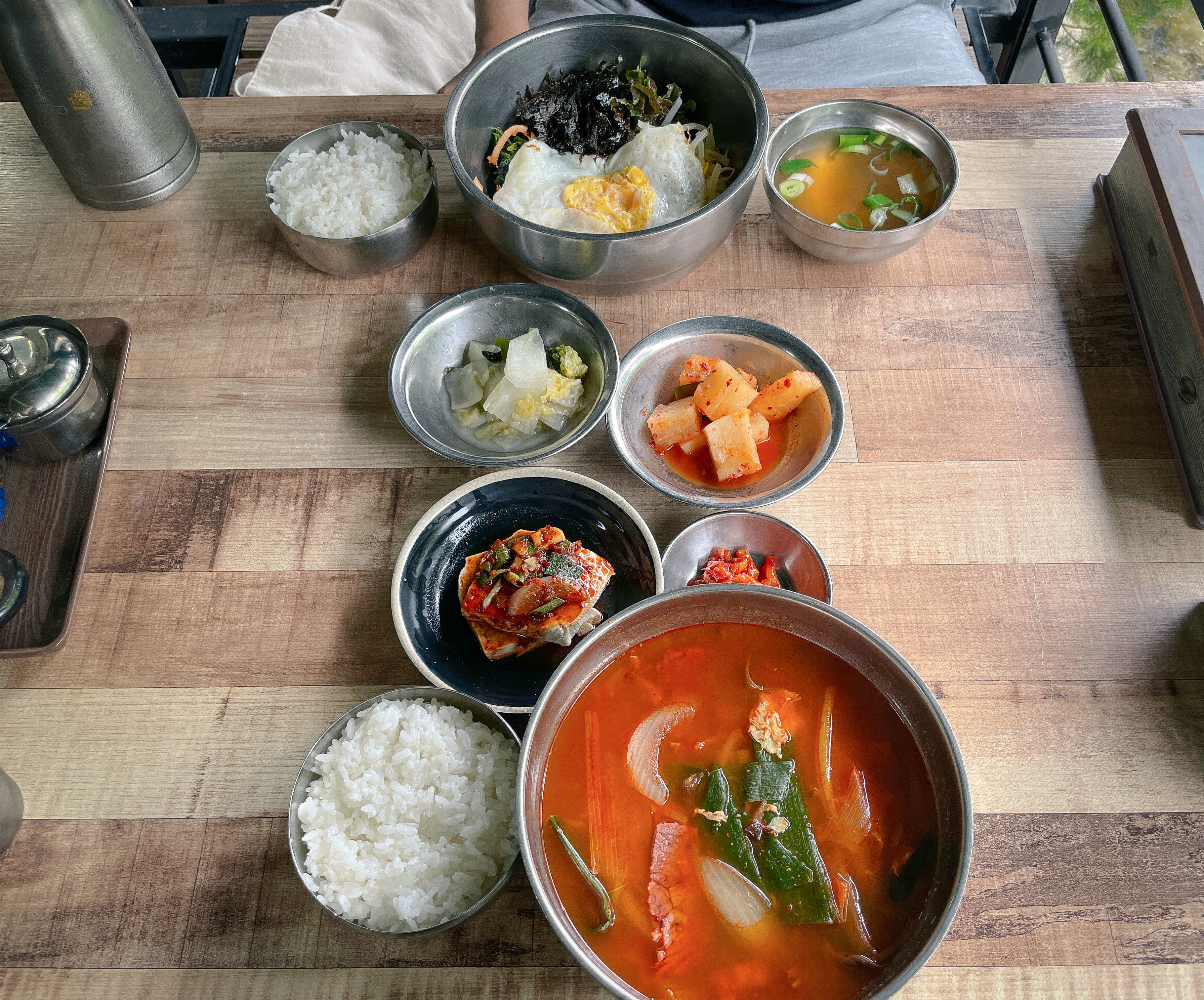 주문한 육개장과 비빔밥의 모습입니다. 반찬들은 백김치, 무김치, 오징어젓갈, 두부조림이 나왔고, 비빔밥에는 별도로 국물이 나왔습니다. 전체적으로 메뉴들도 깔끔했지만 가장 좋은 것은 바로 옆의 계곡을 바라보며 식사하는 것이었습니다.