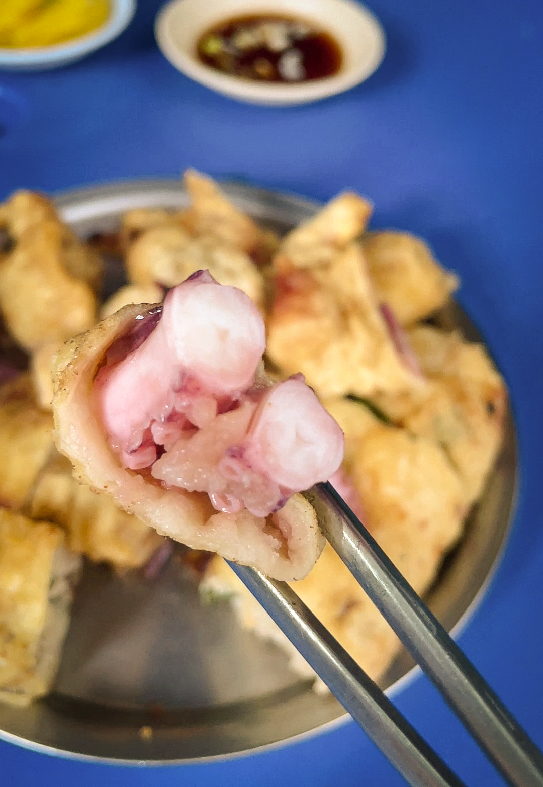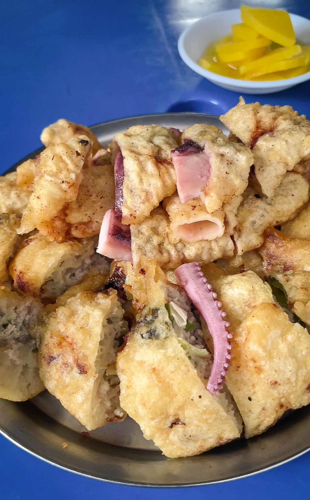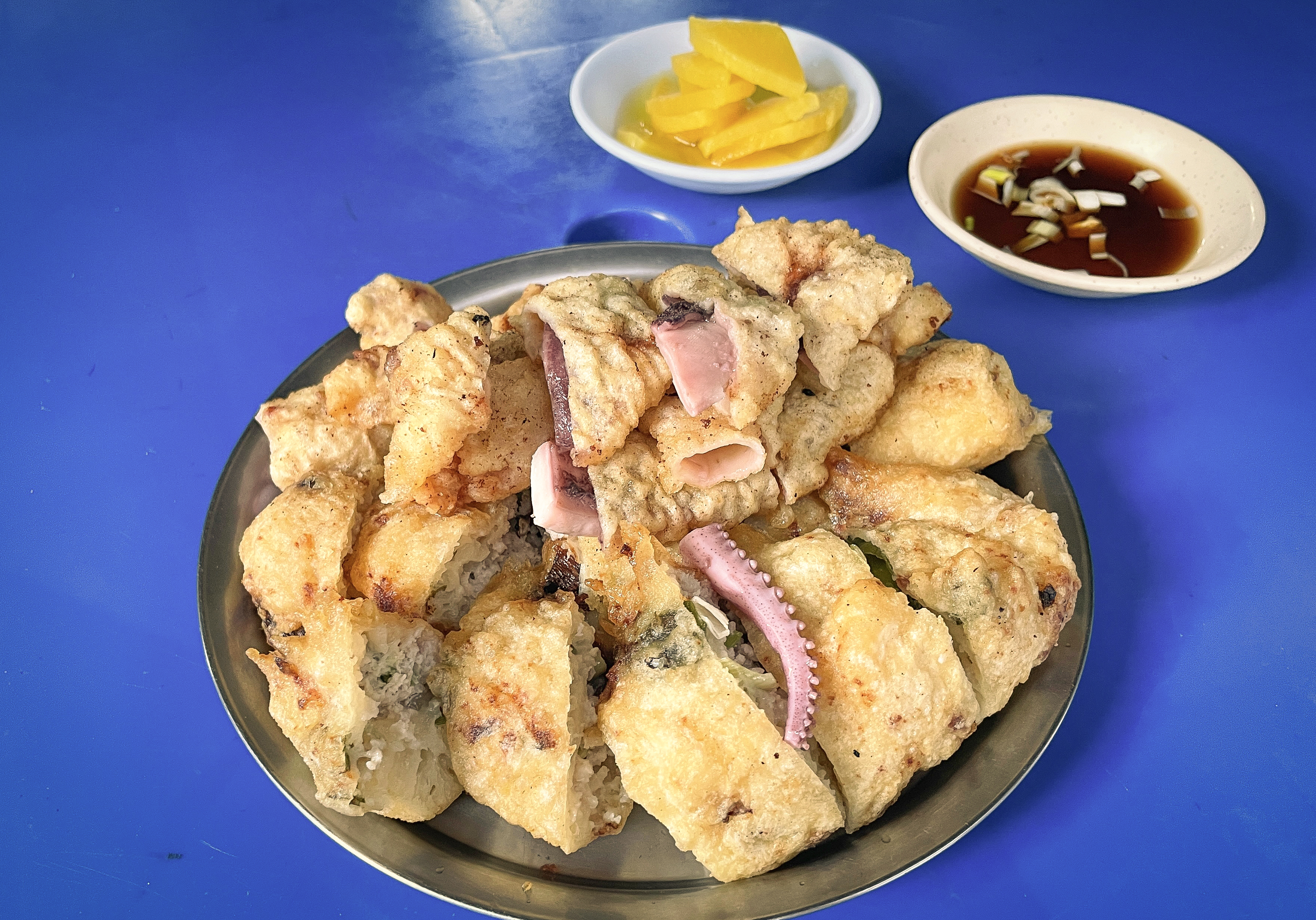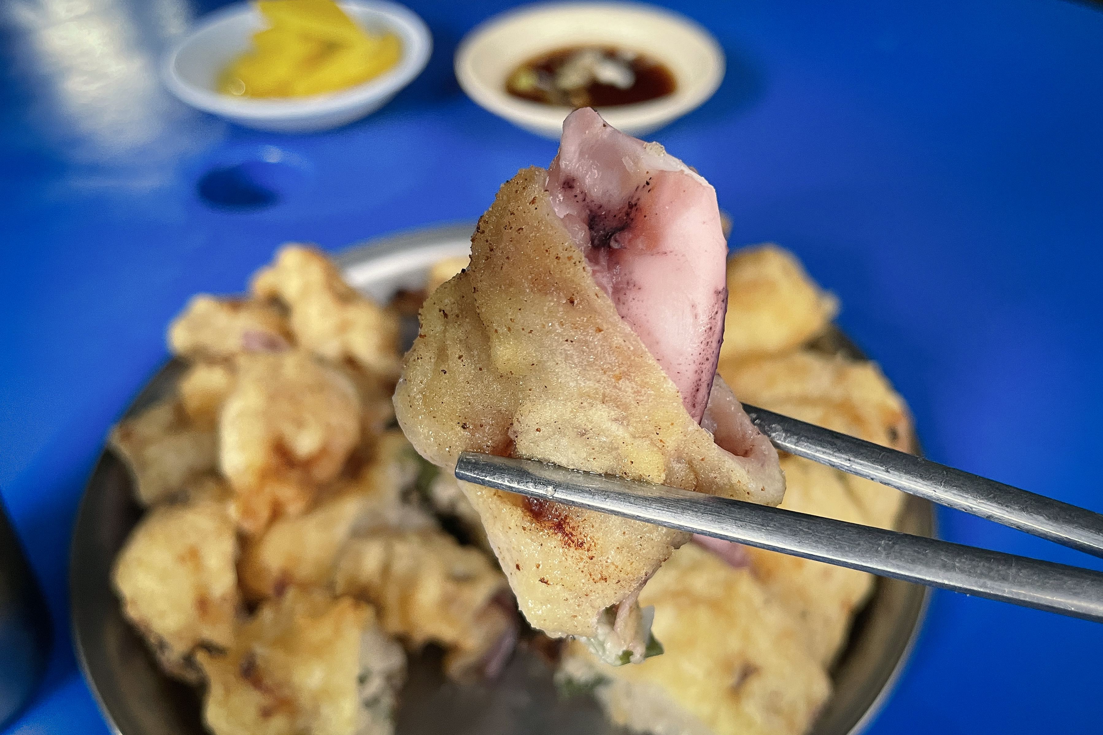 재미있는 메뉴 이름에 편안한 가게 분위기도 좋았지만, 가장 중요한 것은 아무래도 맛이겠죠. 오징어튀김과 고기튀김을 주문했는데, 양도 푸짐했지만 그 자리에서 즉석에서 튀겨내는 모습을 보니 믿음이 가더라고요.