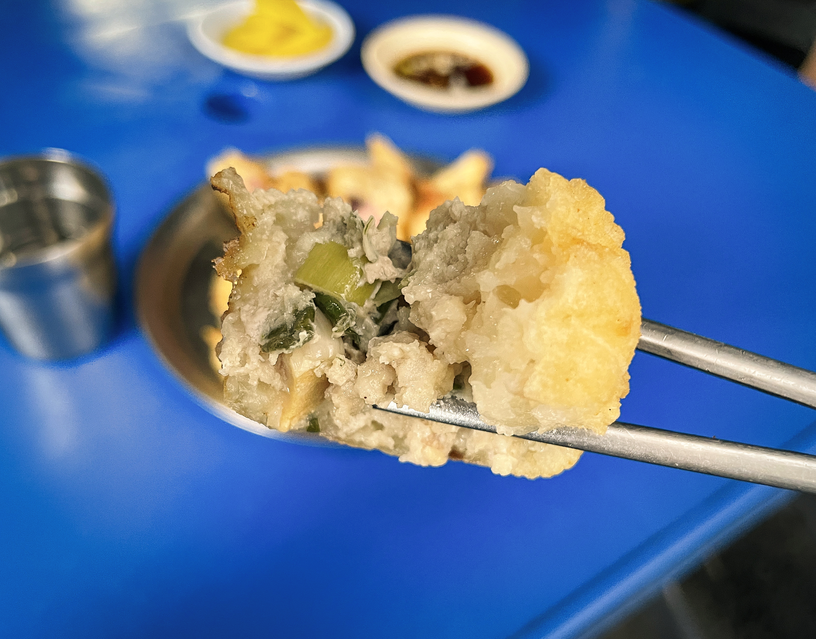 근데 제가 받은 튀김은 미리 만들어두었던 것인지 조금 눅눅하더라고요. 그래도 오징어튀김의 경우 오징어 숙회를 넣었는지 탱글탱글한 식감이 좋았고, 고기튀김은 코스트코의 베이크 작은 버전 같은 느낌이 들었습니다. 할머니께서 가위로 먹기 좋게 잘라주셔서, 먹기에도 편했습니다.