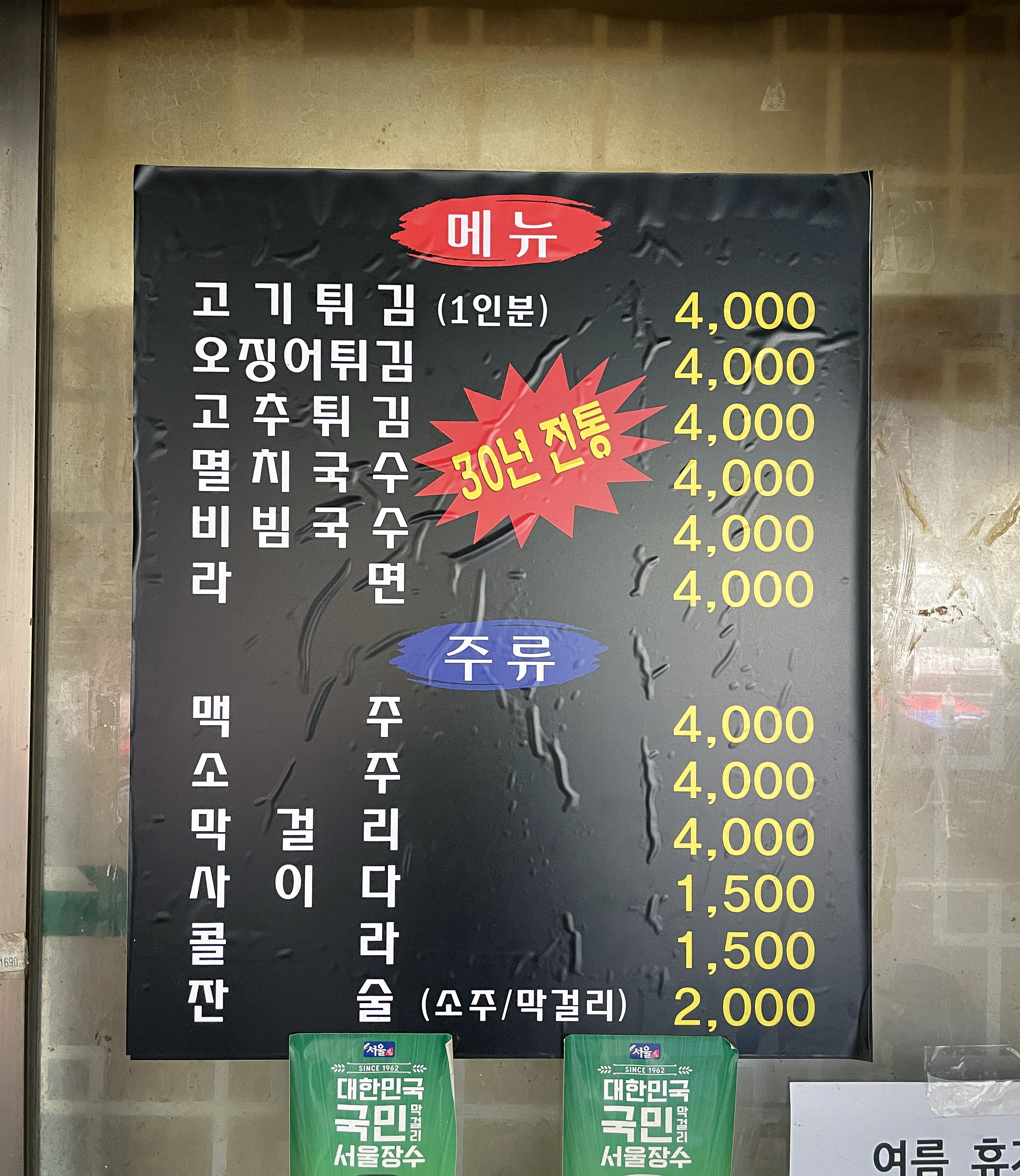 주 메뉴는 고기튀김, 오징어튀김, 고추튀김, 멸치국수, 비빔국수, 라면 등이 있었고, 모든 메뉴는 4,000원으로 부담스럽지 않은 가격에 형성되어 있었습니다. 시장이라 그런지 가격 대비 양이 푸짐하게 나온다는 것이 이 가게의 매력이었습니다. 특히 성동고등학교 학생들이 별명으로 지어준 "말 거시기 튀김(고기튀김)"은 말의 그것과 비슷하게 생겼다고 해서 지어주었다고 하시더라고요.