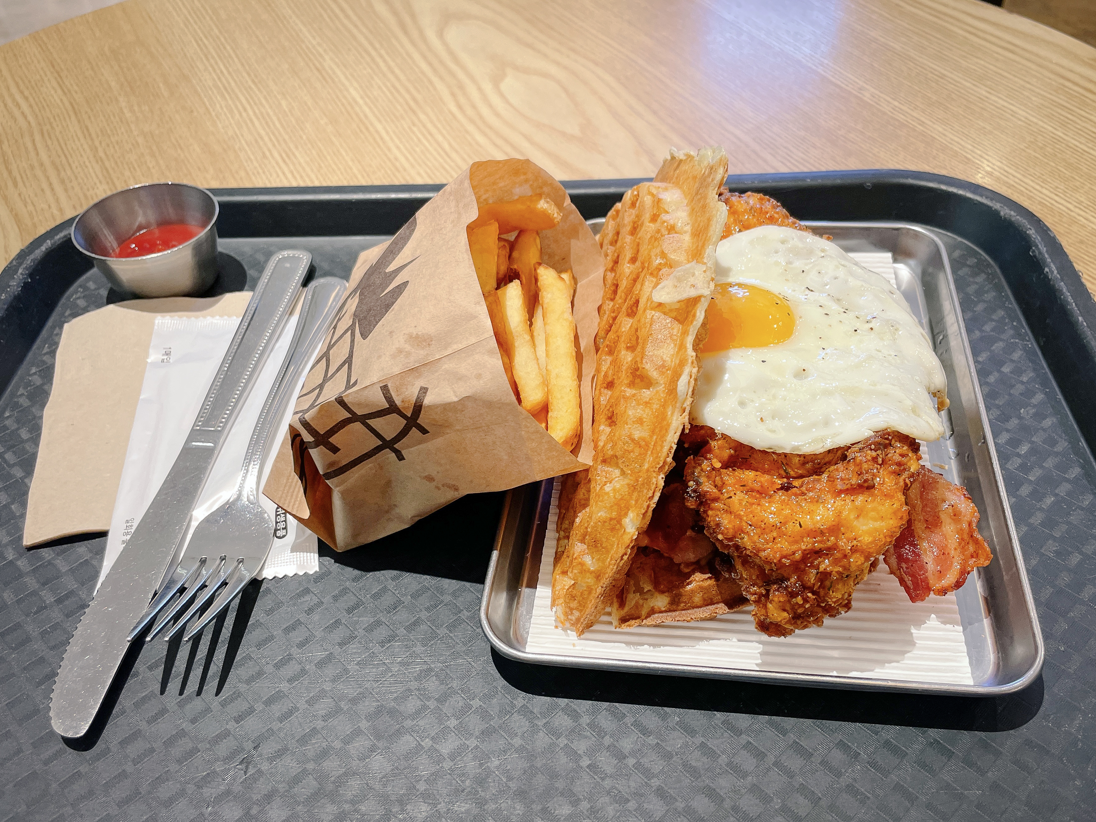 제가 주문한 홀리치킨은 와플을 샌드위치나 햄버거처럼 손으로 들고 먹으려 했지만, 생각보다 내용물이 크고, 달걀의 경우 반숙이어서 흘러내리다 보니 먹기 좋은 크기로 조각 내 먹는 것이 더 편하더라고요.