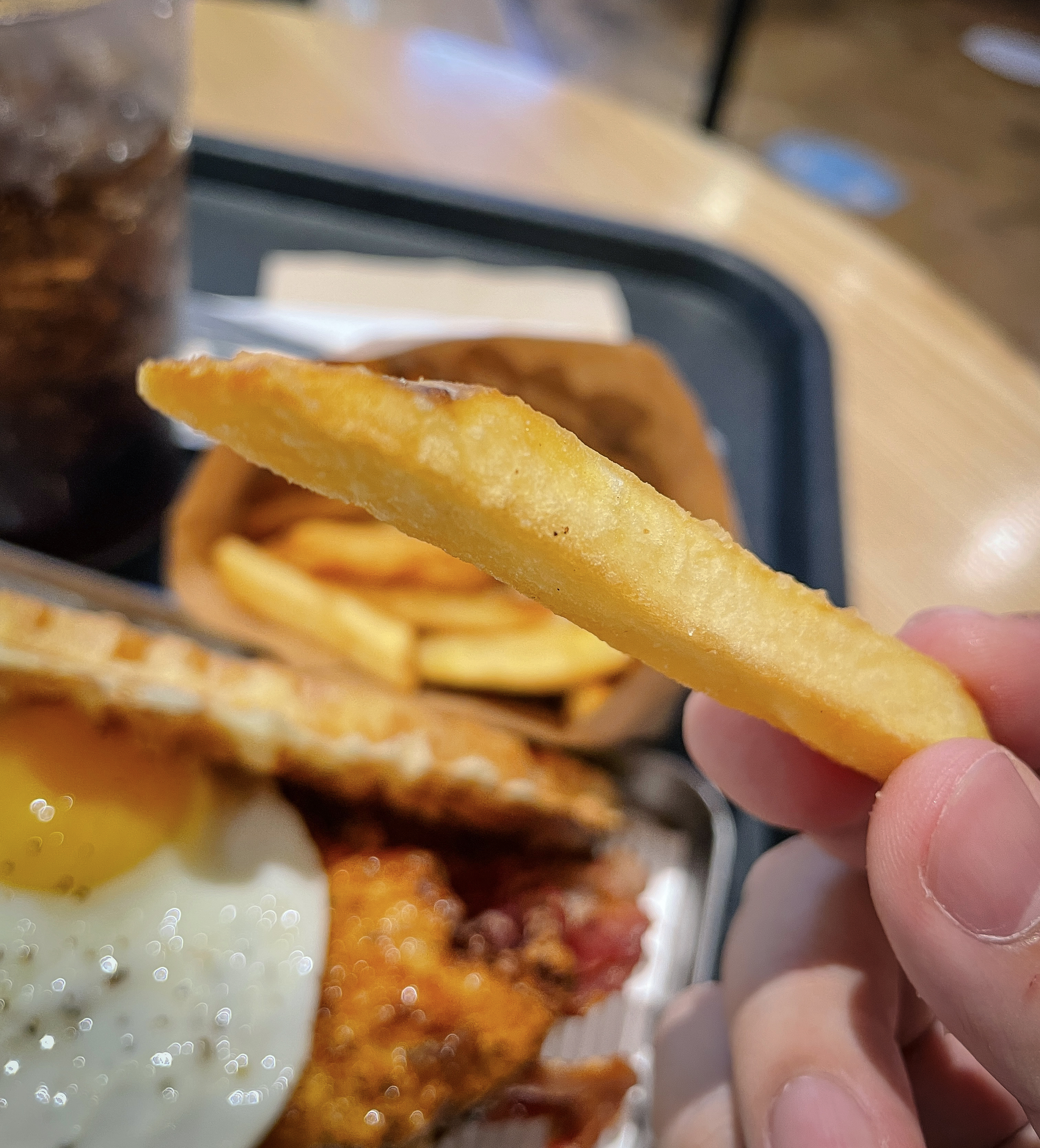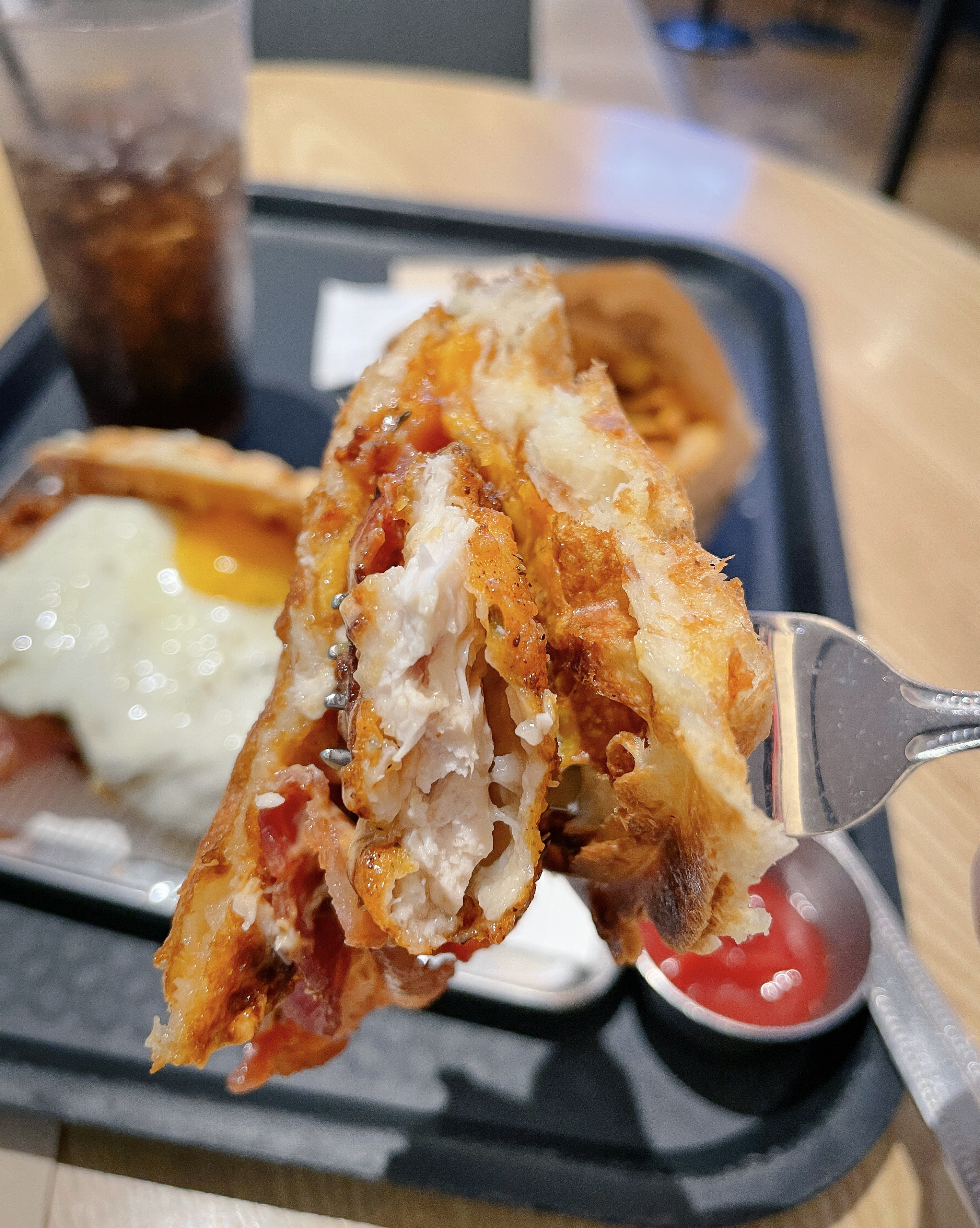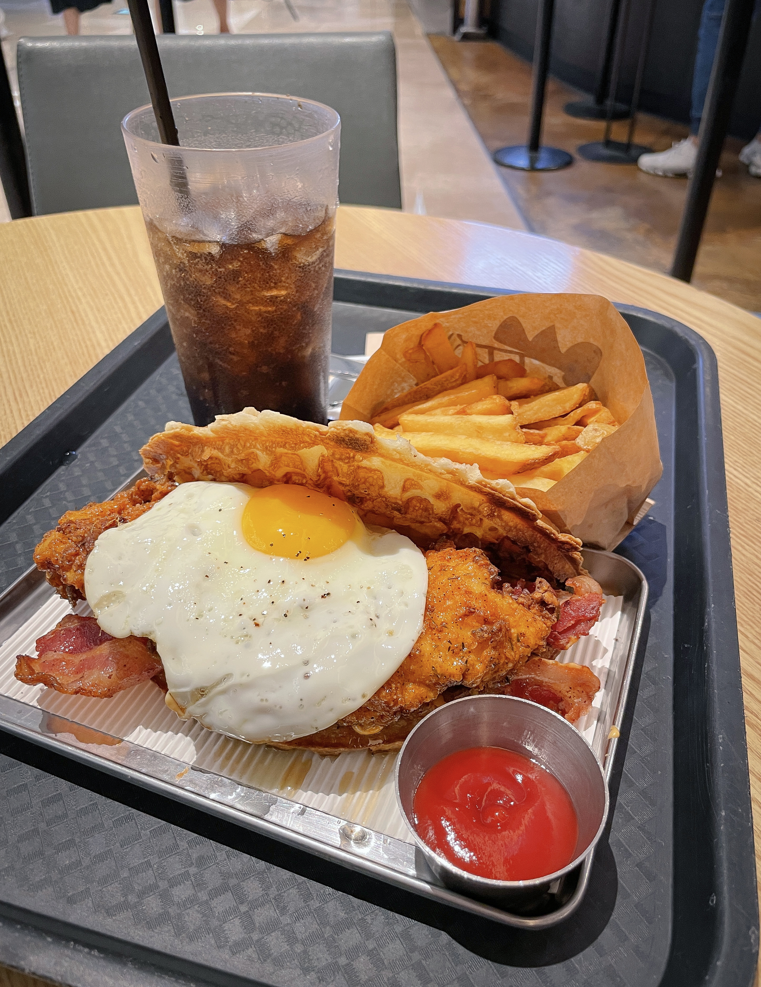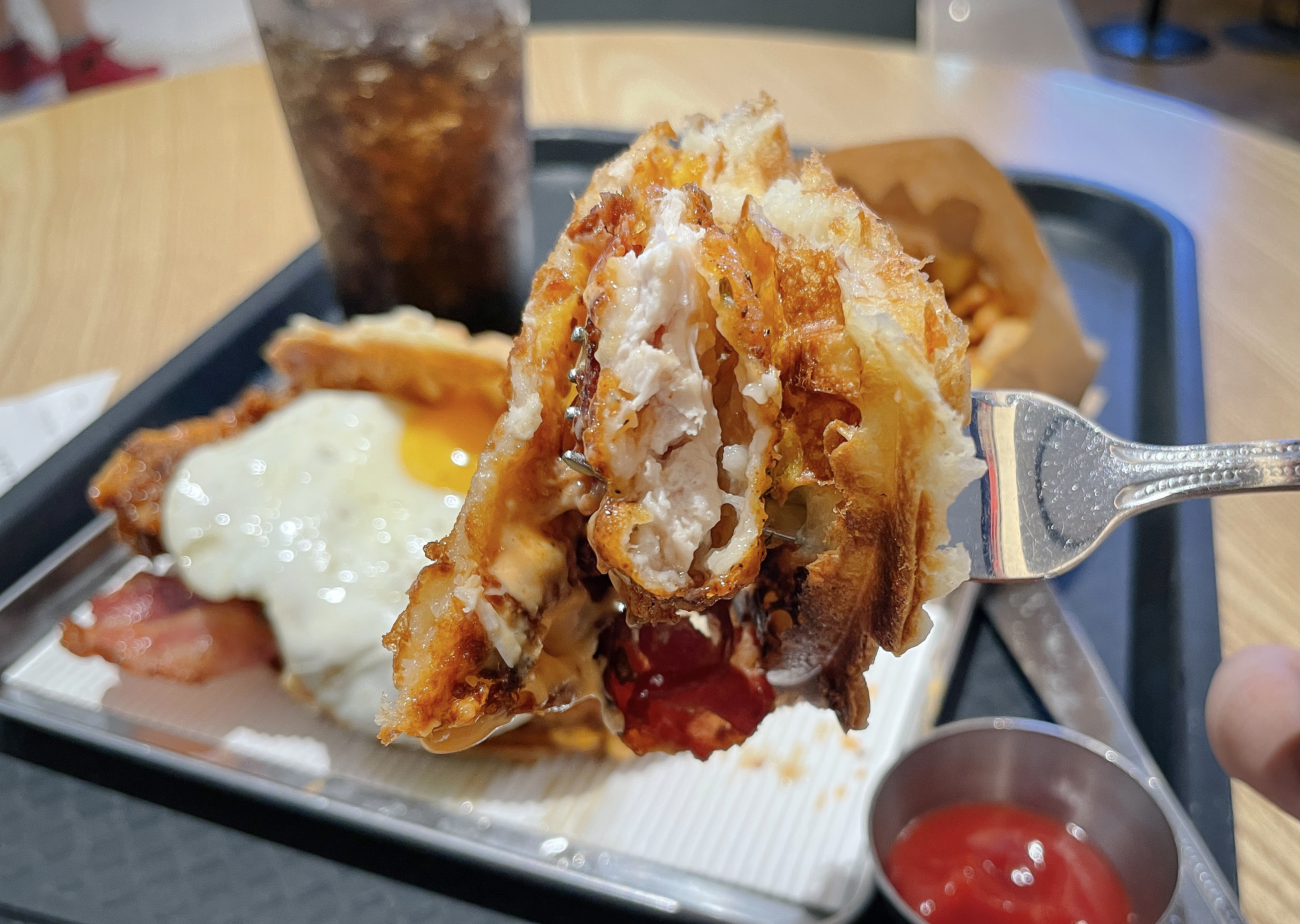 치킨와플은 어떻게 생겼을까 궁금했는데, 실제로 보니 와플은 두께가 적당히 얇은 편이었고, 큼직한 치킨과 달걀프라이, 베이컨이 들어가 있었습니다. 음료는 직접 디스펜서를 이용해 뽑아서 마실 수 있었고, 여러 차례 원하는 만큼 음료를 가져다 먹어도 되는 것 같았습니다.