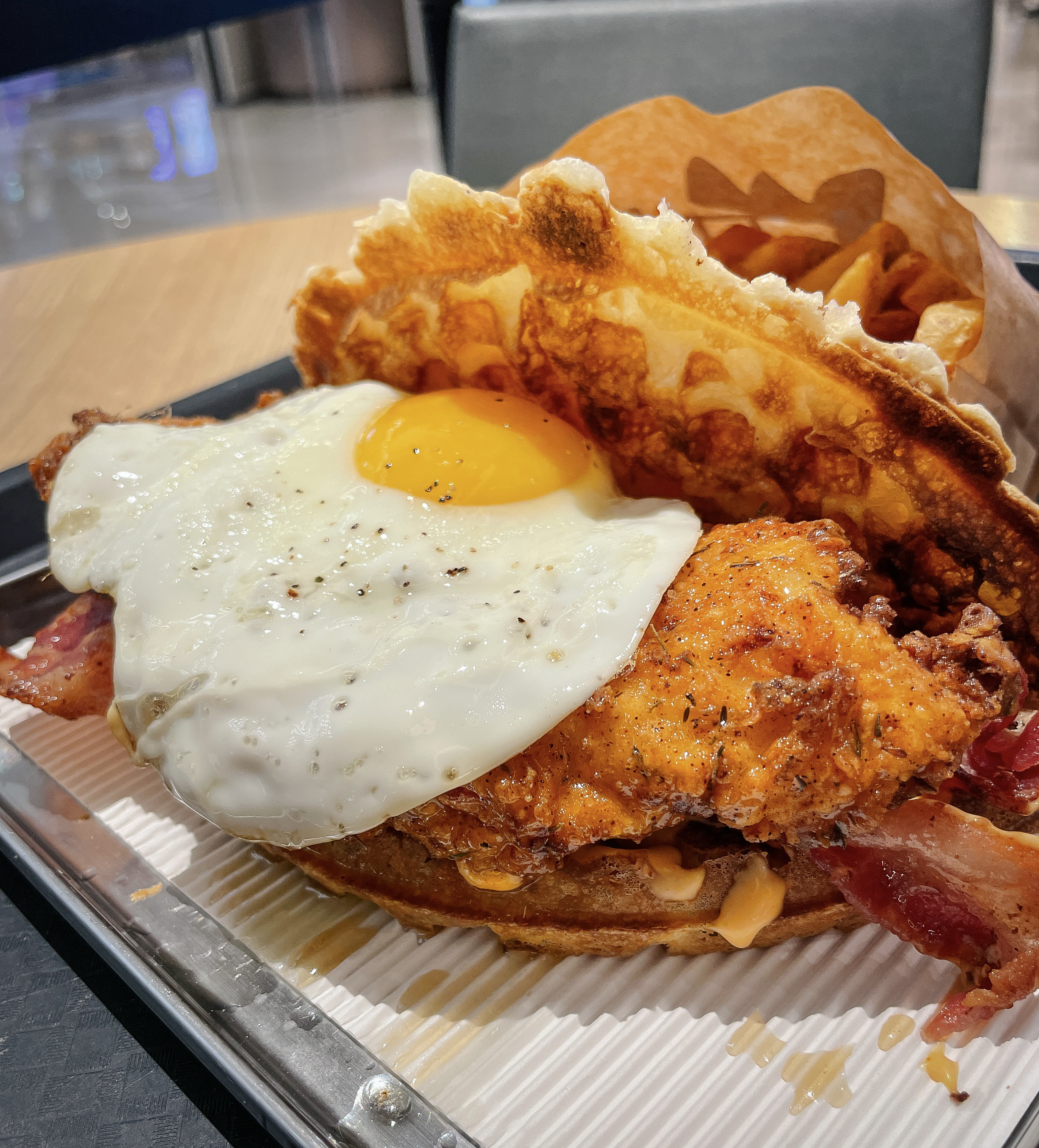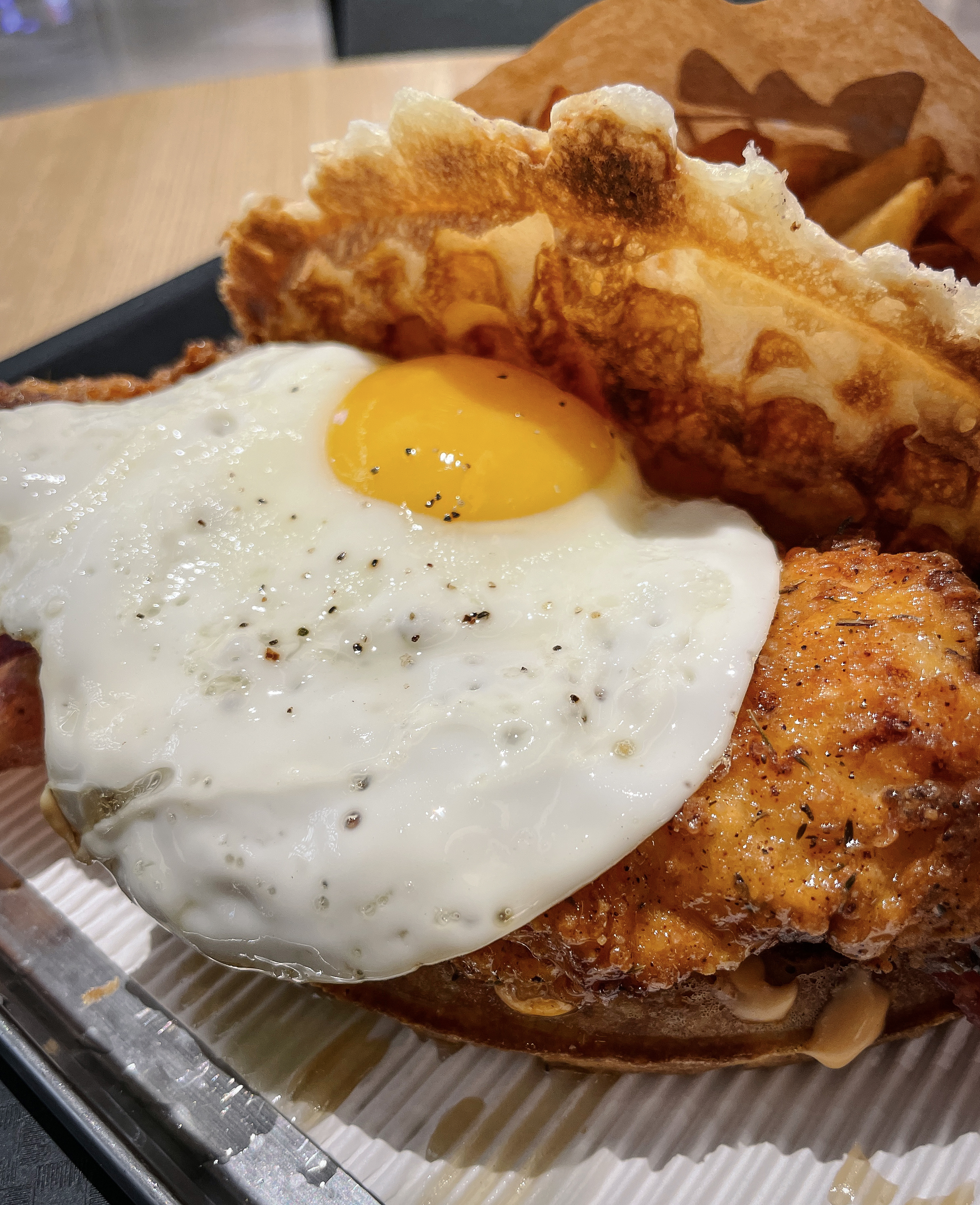 브럭시의 치킨 와플은 와플의 두께가 얇아서 퍽퍽하지 않았고, 제가 주문한 홀리치킨의 경우 메이플시럽이 올라가 단짠단짠 한 맛이 있었습니다. 감자튀김은 도톰한 편이었는데, 바삭바삭한 게 맛있더라고요.