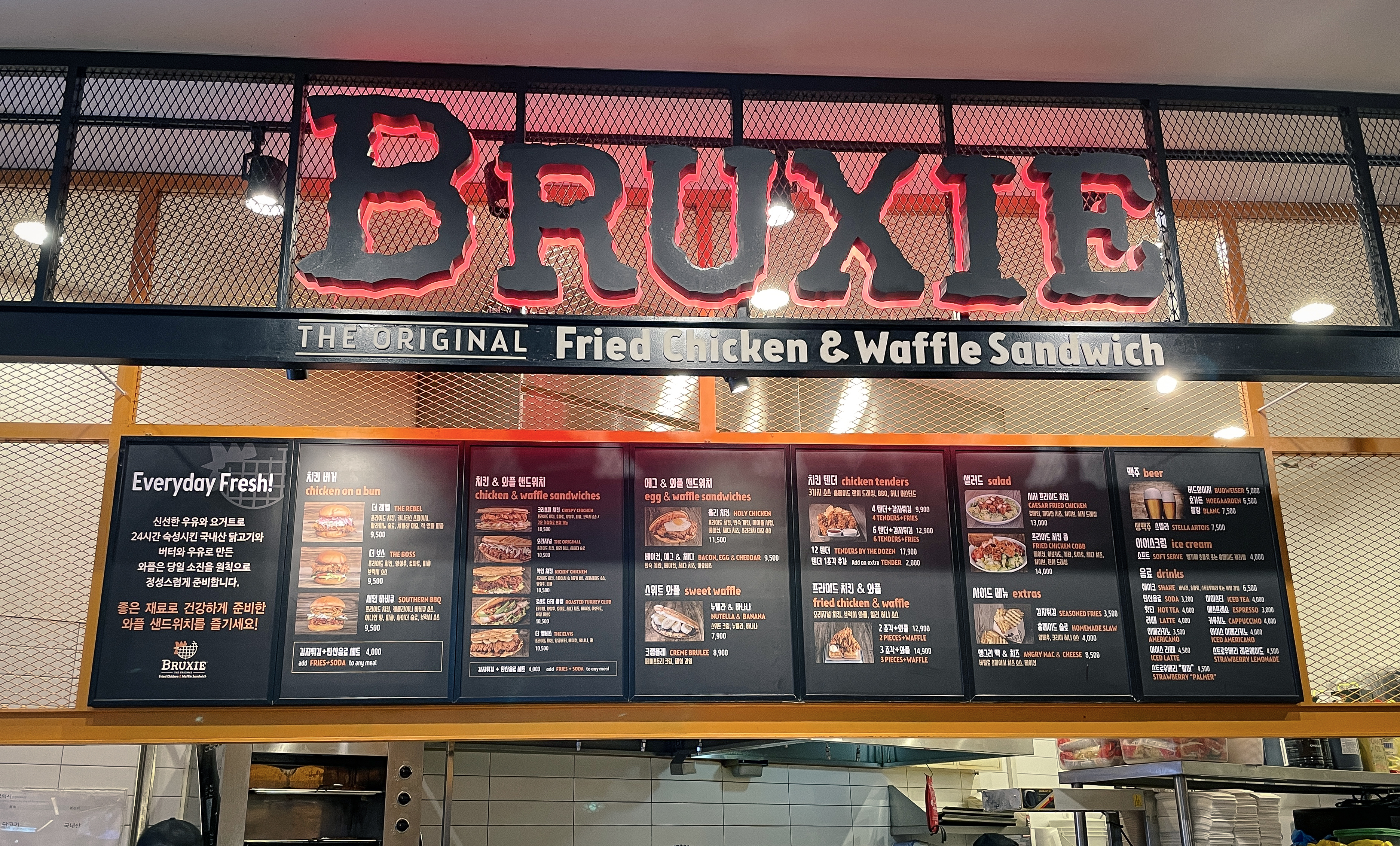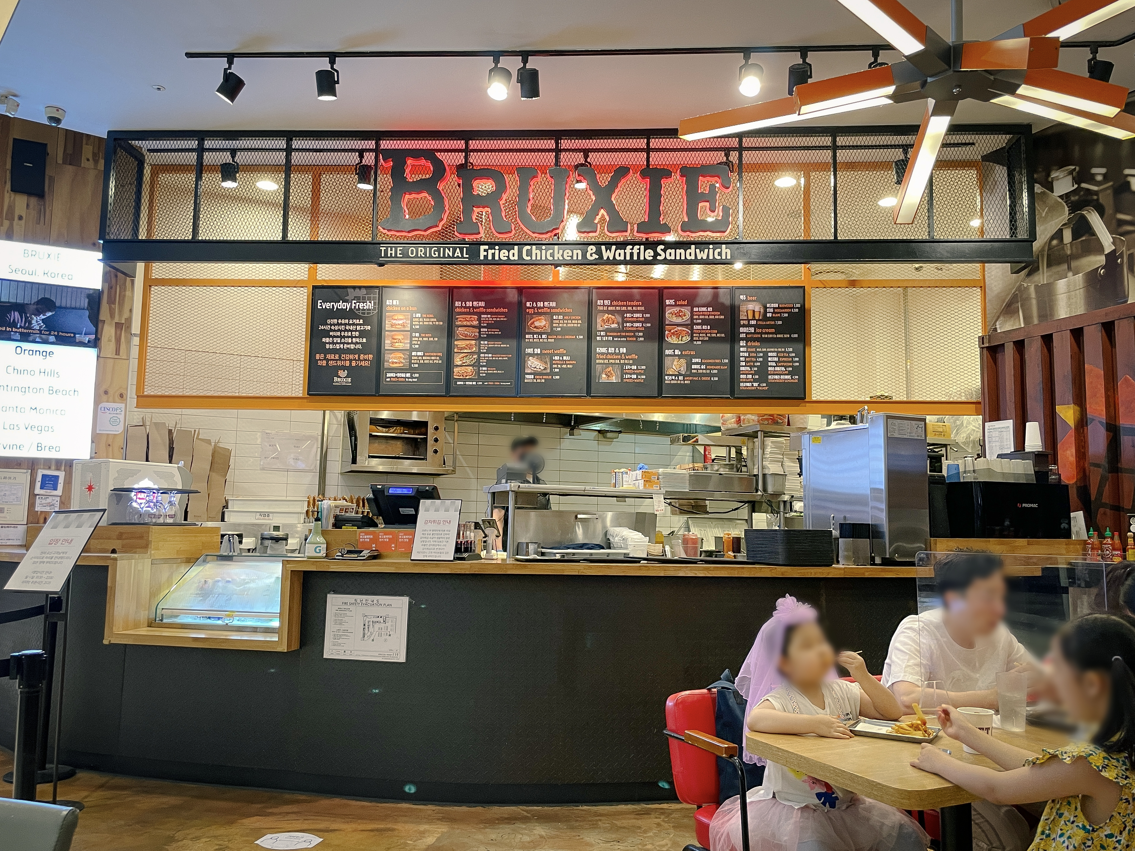 브럭시는 잠실 롯데월드몰 지하1층 아쿠아리움 근처에 위치한 가게입니다. 치킨과 와플의 이색적인 조합으로 많은 손님들이 찾고 있었습니다. '브럭시(BRUXIE)' 는 2010년 미국 캘리포니아 남부에서 설립된 캐주얼 레스토랑으로 미국 전통방식 와플 믹스를 이용해 미국 본토의 맛을 느낄 수 있는 가게였습니다.