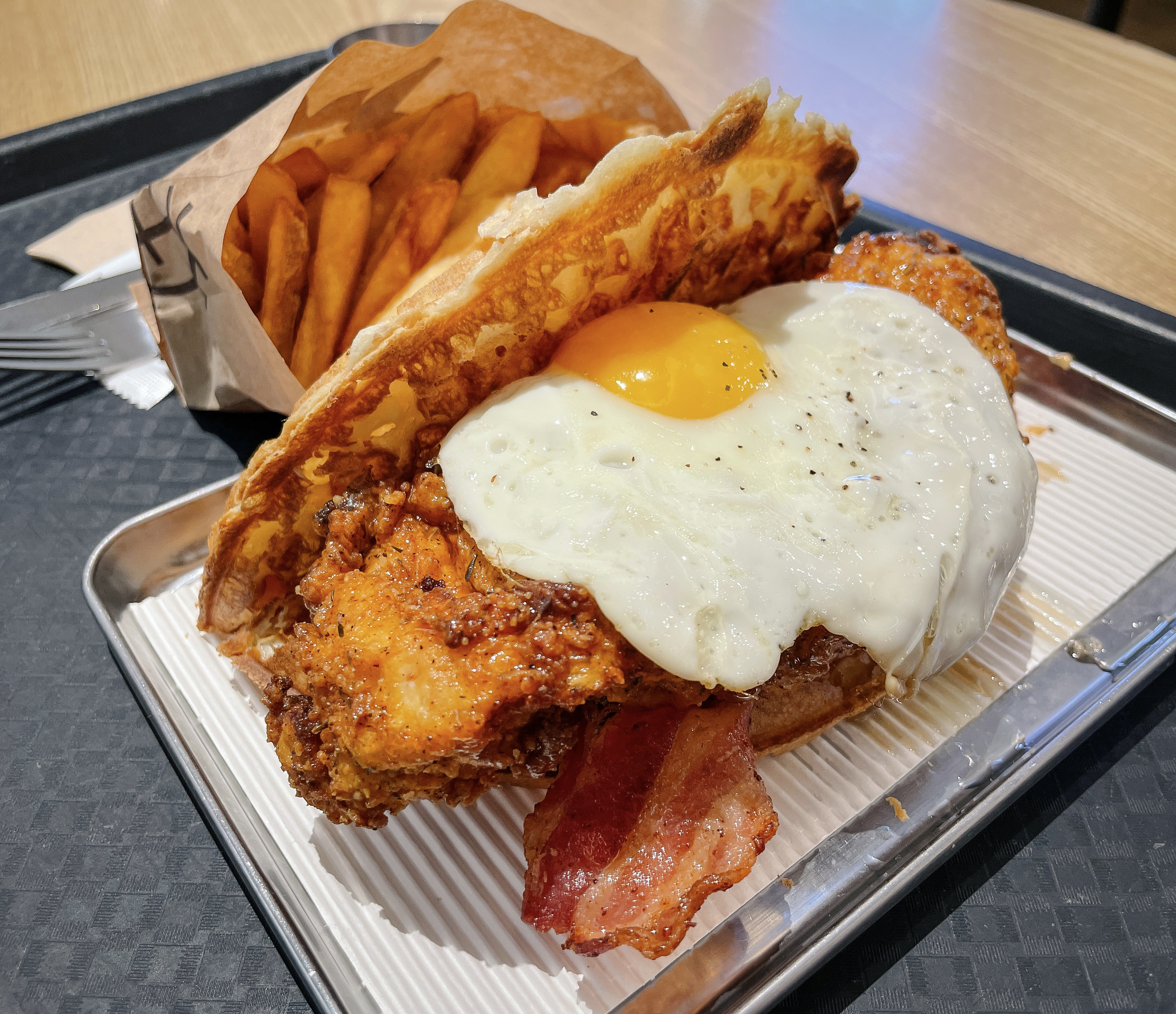 저는 프라이드치킨, 반숙계란, 메이플시럽, 베이컨, 체다치즈, 스리라차마요소스가 올라가는 홀리치킨과 감자튀김, 탄산음료 세트를 주문했습니다. 메뉴의 가격은 15,500원 입니다.