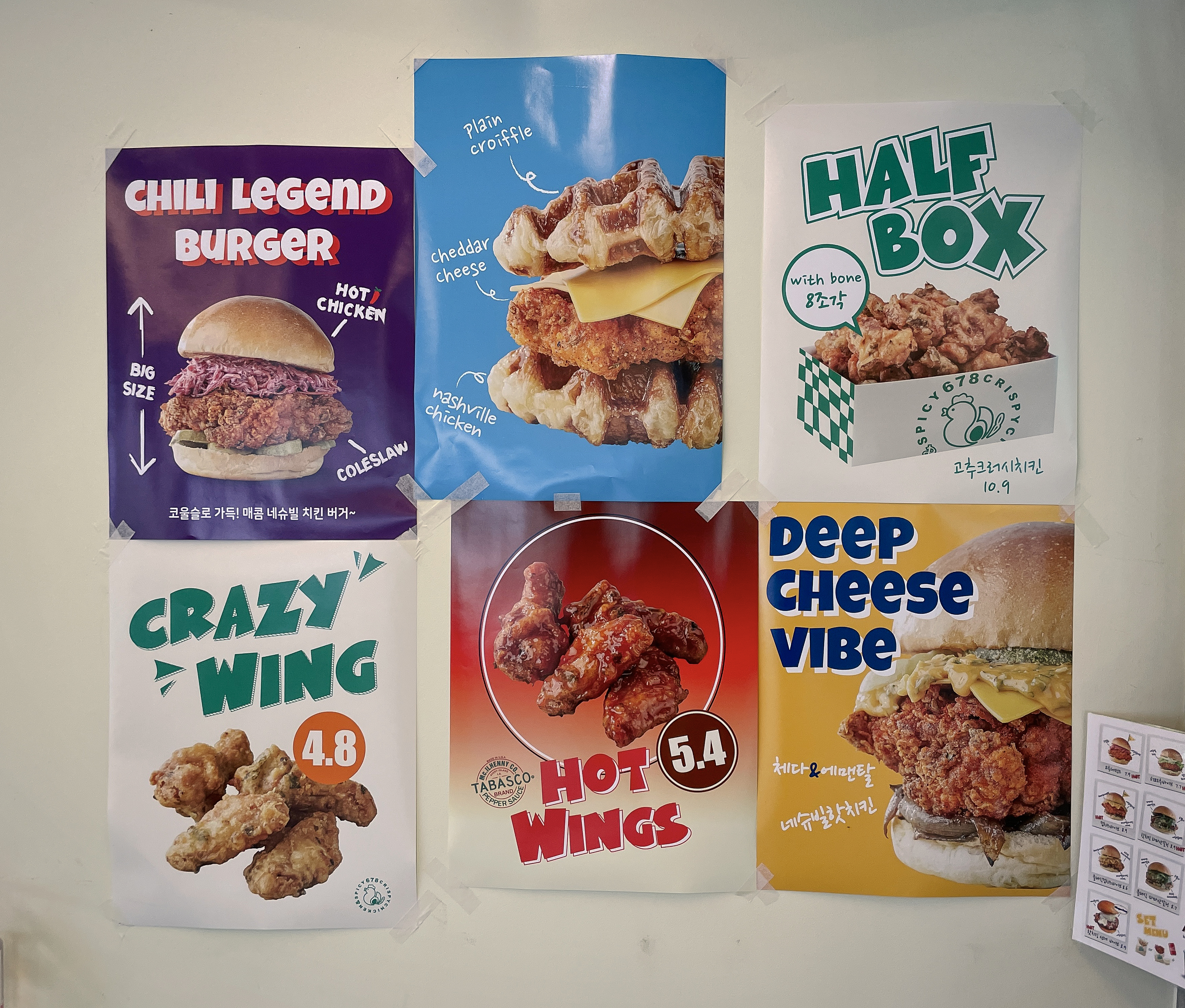 메뉴는 고추레전드버거, 678고추바이브, 678바이브, 딥치즈바이브, 핫치킨파마산갈릭, 핫치킹바이브, 클래식딥치즈바이브, 클래식파마산갈릭, 치킹바이브, 핫치킹선데바이브, 고추크러시치킨, 골든빠삭킹치킨, 어마마요치킨, 시그니쳐양념치킨, 소이갈릭고추크러시치킨, 크레이지윙, 핫윙, 오지치즈프라이, 갈릭버터프라이, 후렌치프라이, 고구마프라이&갈릭마요, 국물떡볶이, 치즈볼, 소떡소떡, 코울슬로 등이 있었습니다.