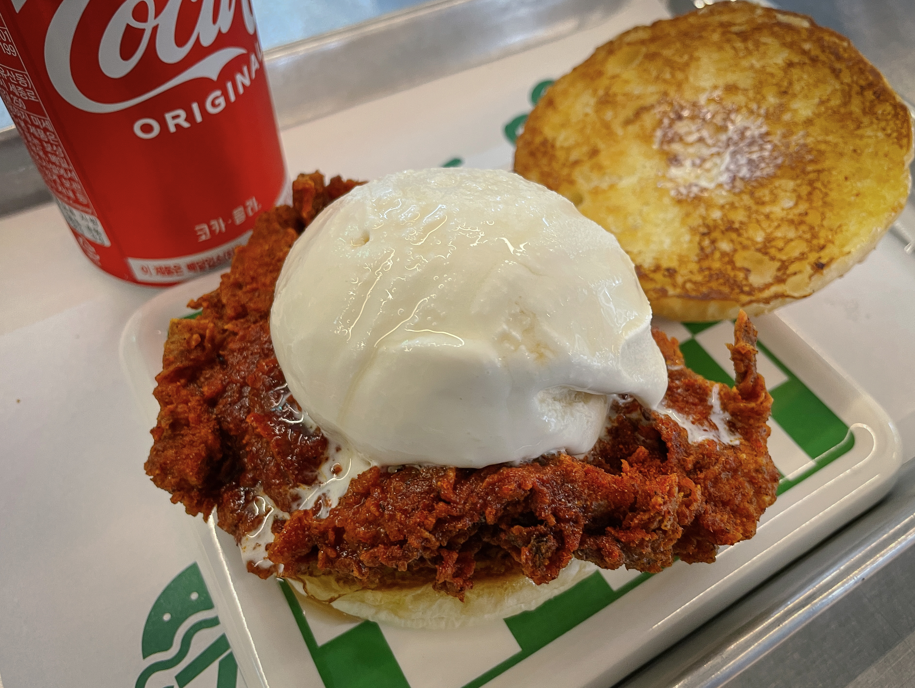 저는 치킨의 맵기를 3단계 중 2단계를 선택했는데, 매콤한 치킨을 아이스크림이 중화시켜줘 맛이 적당하고 좋았습니다. 다만 뜨겁고 차가운 재료가 동시에 있다 보니, 이가 더 시린 느낌이 있었고, 앞서 말씀드린 것처럼 아이스크림이 자꾸 녹아내리다 보니 손으로 집어먹기는 거의 불가능했습니다. 여러분이 알고 계신 독특한 햄버거가 있다면 댓글로 알려주세요.