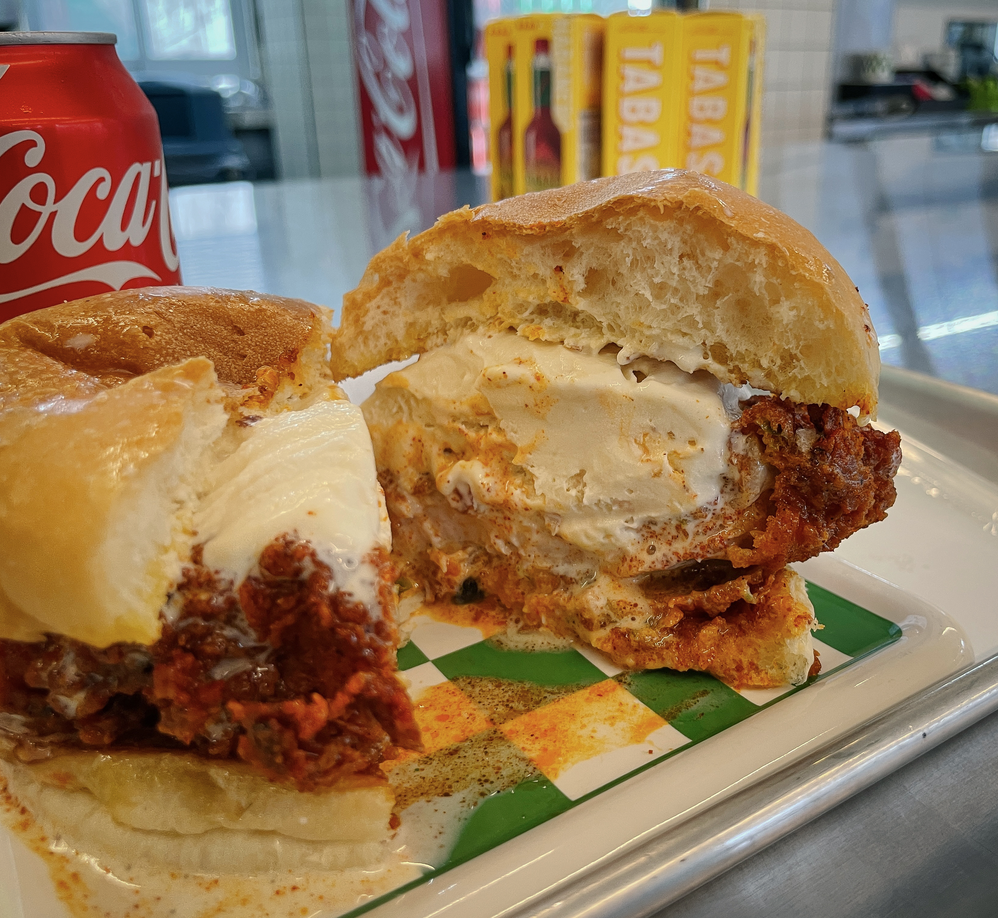 곧 주문했던 핫치킹 선데 바이브가 나왔고, 설마 했던 아이스크림이 실제로 올라가 있었습니다. 가게에 에어컨을 틀었지만 더운 날씨는 어찌하지 못하는지 아이스크림이 나오기 무섭게 녹아내리기 시작했습니다. 아이스크림은 하겐다즈 바닐라 아이스크림이었는데, 매콤한 내슈빌 치킨에 메이플 시럽까지 더해서 단짠 맵싸한 맛이 있었습니다.