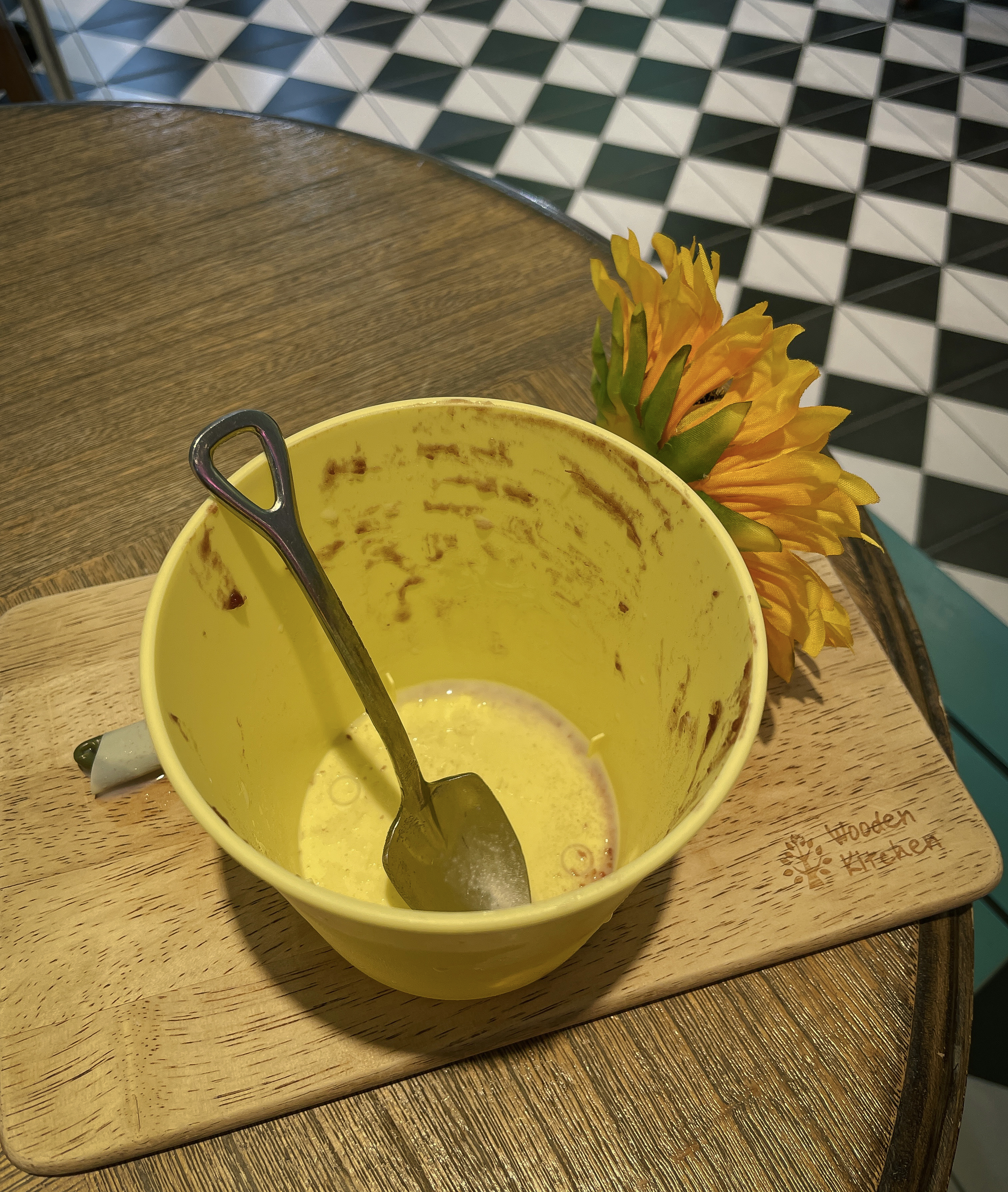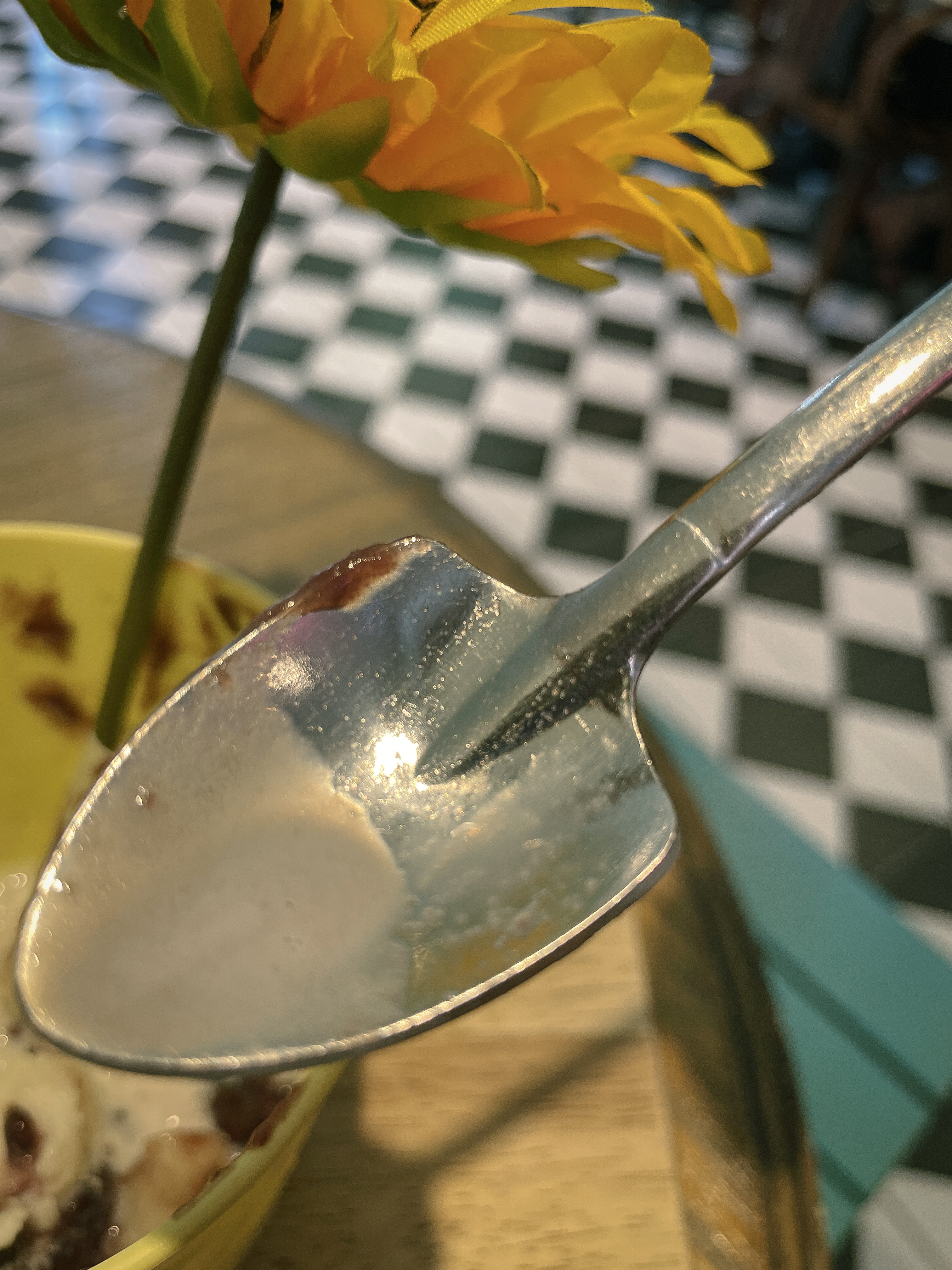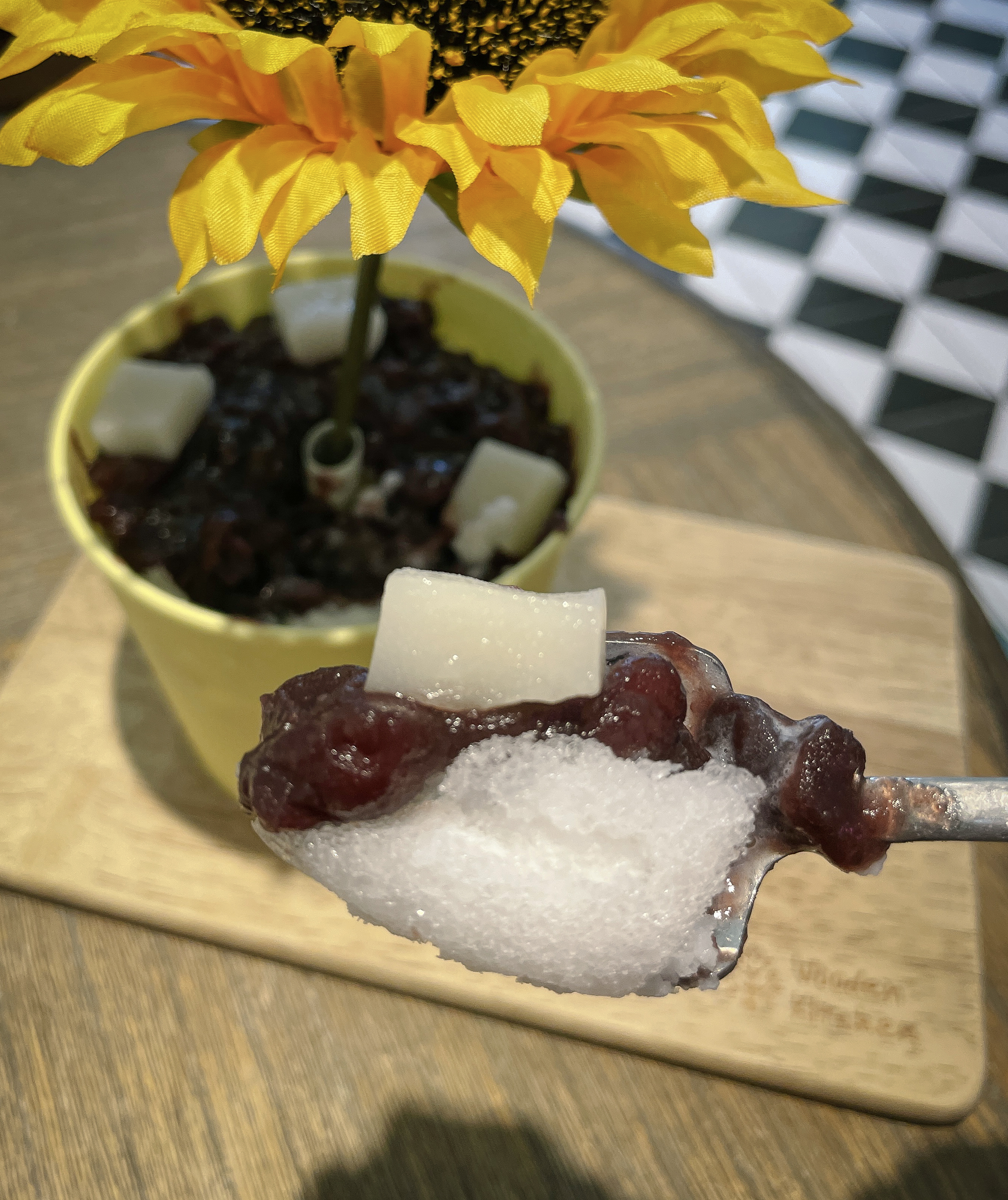 팥빙수는 화분이라는 컨셉에 맞춰서 삽 모양의 숟가락과 함께 제공되었습니다. 팥빙수는 간 얼음에 연유를 얹고, 그 위에 팥으로 덮어 마무리하였고, 떡을 고명으로 얹어서 주었었습니다. 모양이 신기해서 사 먹었는데, 막상 먹으려니 화분의 꽃이 커서 그런지 먹기에 불편하더라고요.