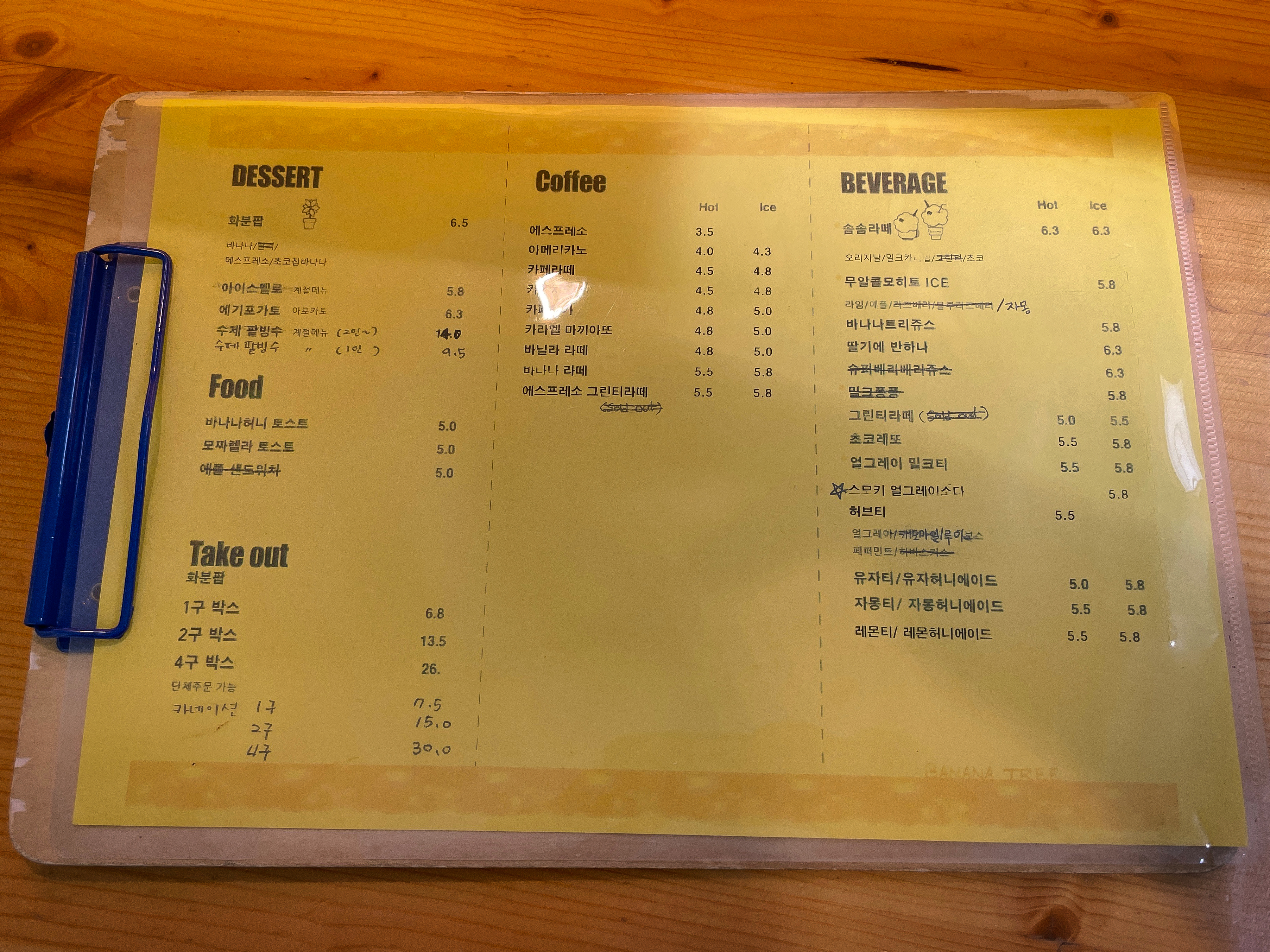 성수동 바나나트리는 사장님이 꽃을 좋아하시는지, 가게 안팎으로 화분이 놓인 모습을 볼 수 있었습니다. 메뉴는 디저트, 음식, 커피, 음료가 있었는데, 화분 팥빙수는 '수제 팥빙수'라는 이름으로 1인, 2인 메뉴로 판매하고 있었습니다. 2인 팥빙수의 양이 꽤 많아 보여서 저는 1인 팥빙수를 주문했습니다.