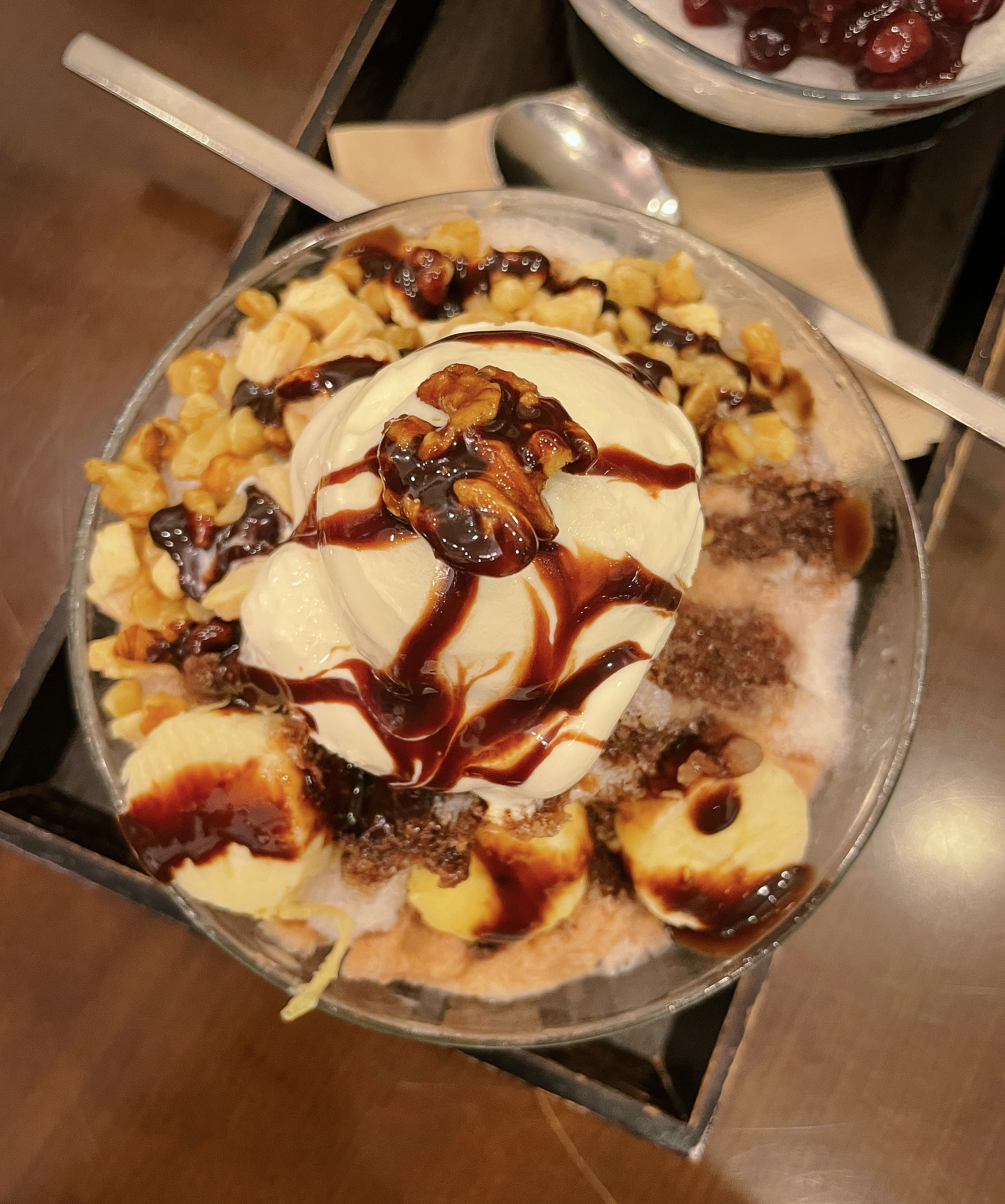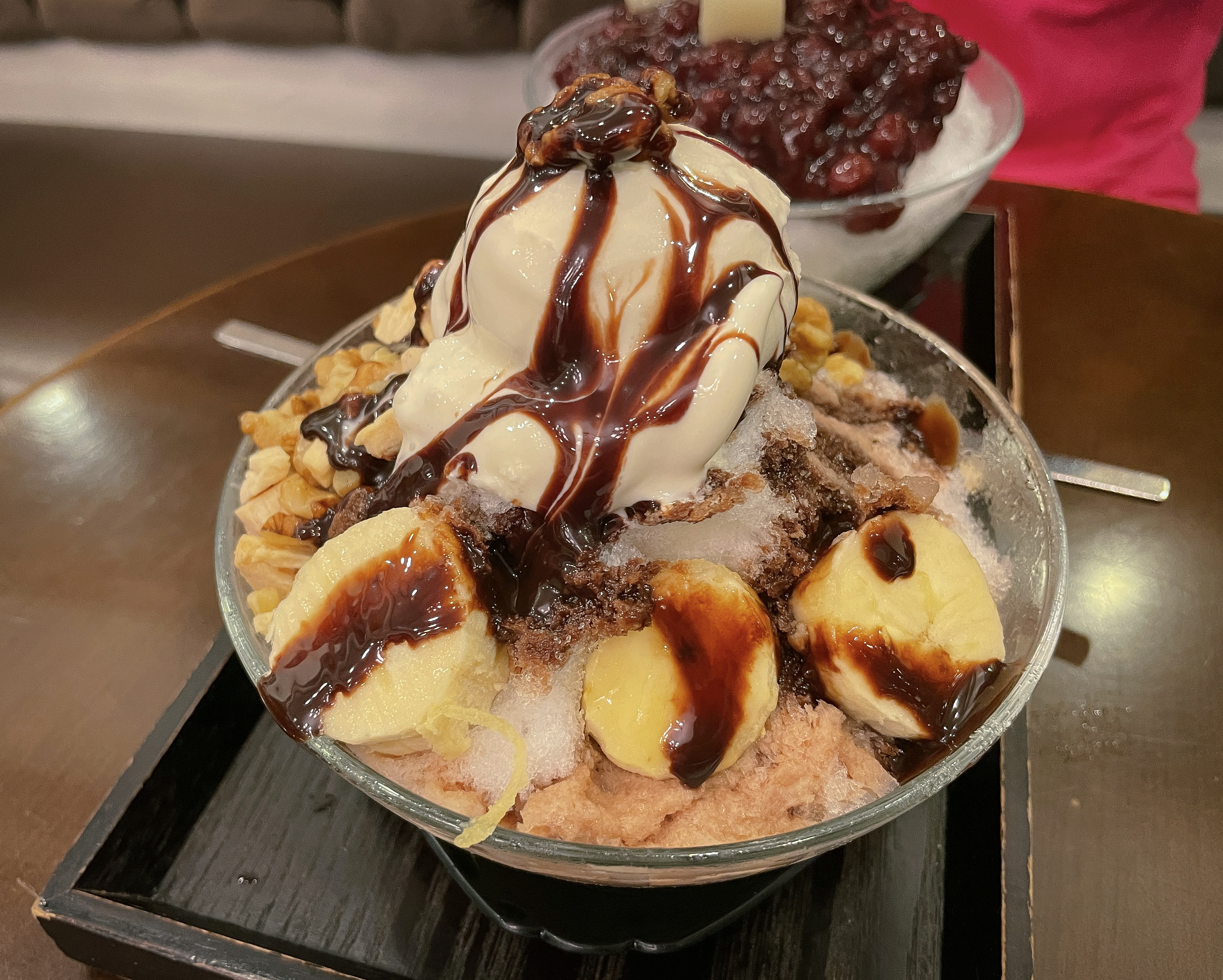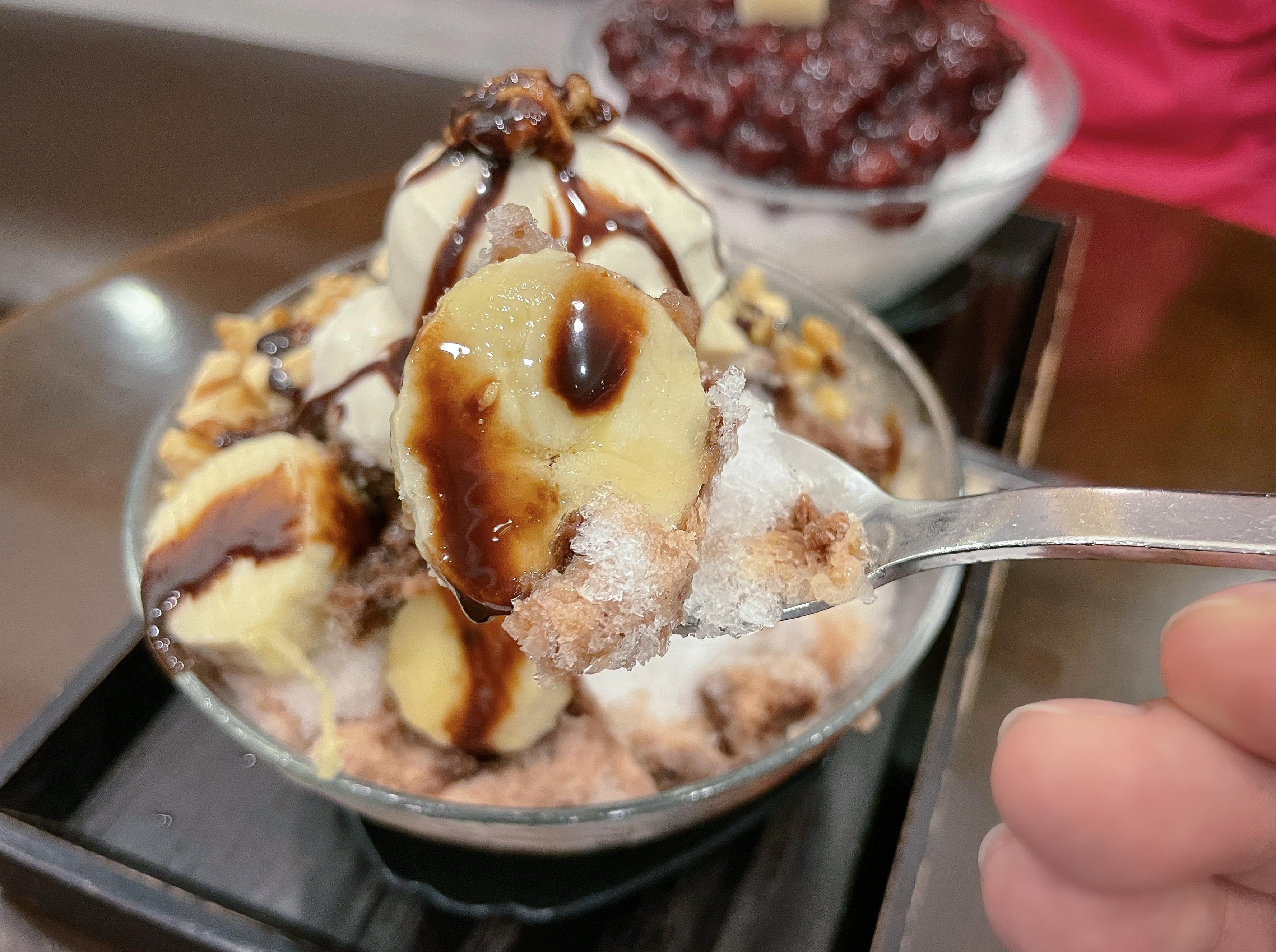 곧 로얄밀크티빙수와 팥빙수가 나왔습니다. 로얄밀크티빙수는 아이스크림에 견과류, 바나나, 시리얼 등이 들어간 빙수였고, 팥빙수는 얼음 위 단팥과 떡을 올려주었습니다. 팥빙수는 그냥 평범한 팥빙수였고, 로얄밀크티 빙수는 바삭한 식감의 다양한 견과류가 들어있어 씹는 맛이 좋았고, 단 맛이 강한 아이스크림과 향긋한 홍차가 어우러져 맛이 좋았습니다.
