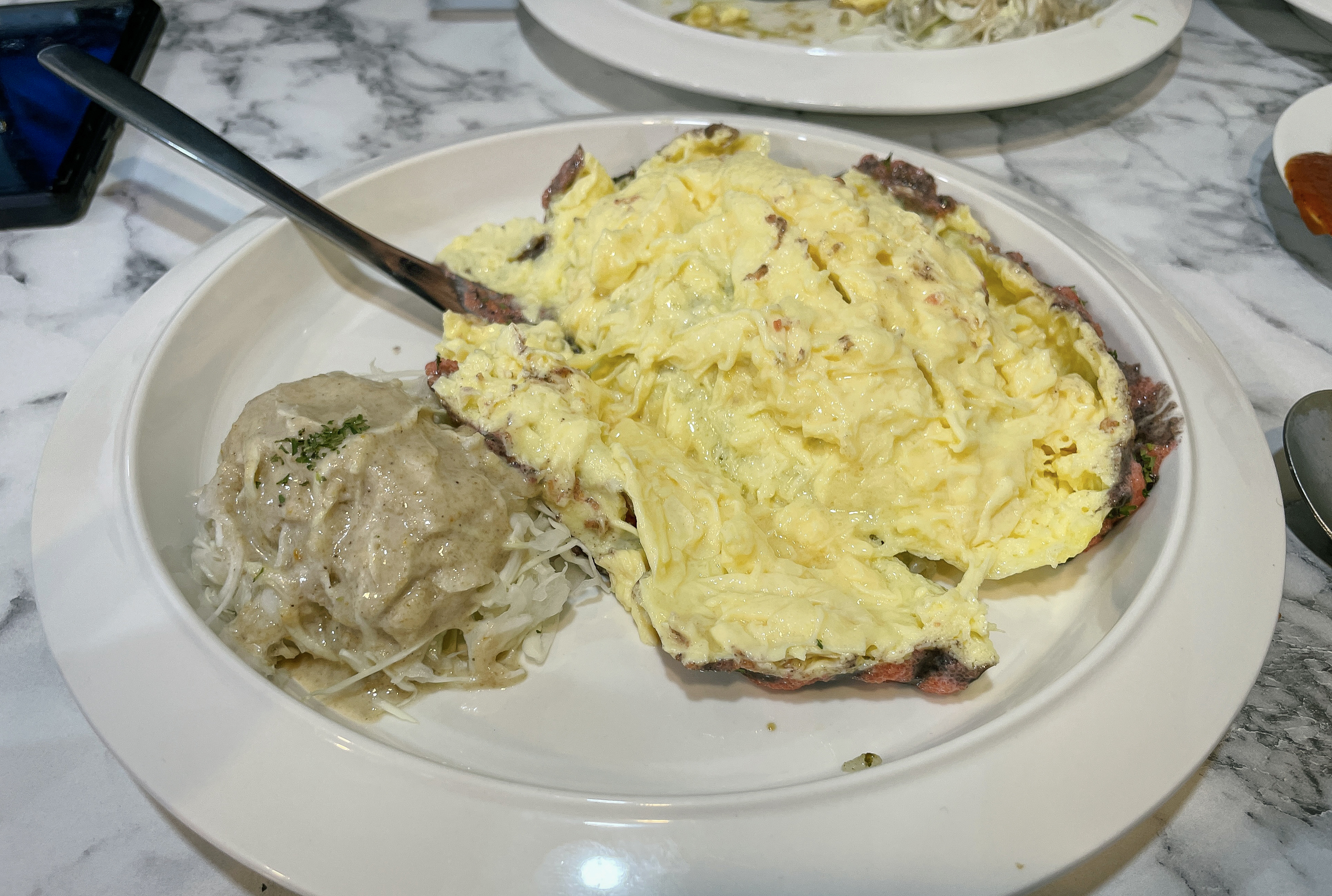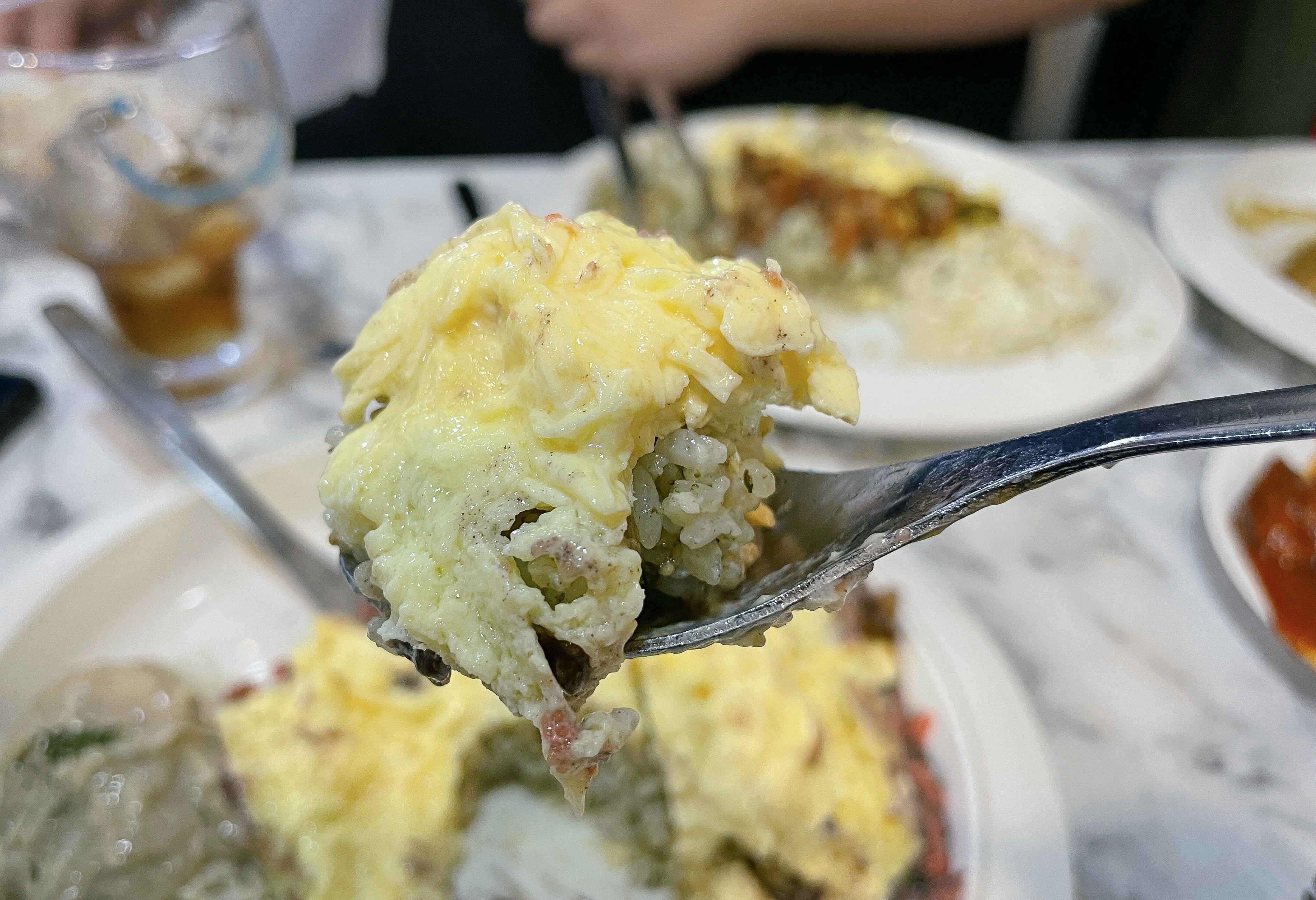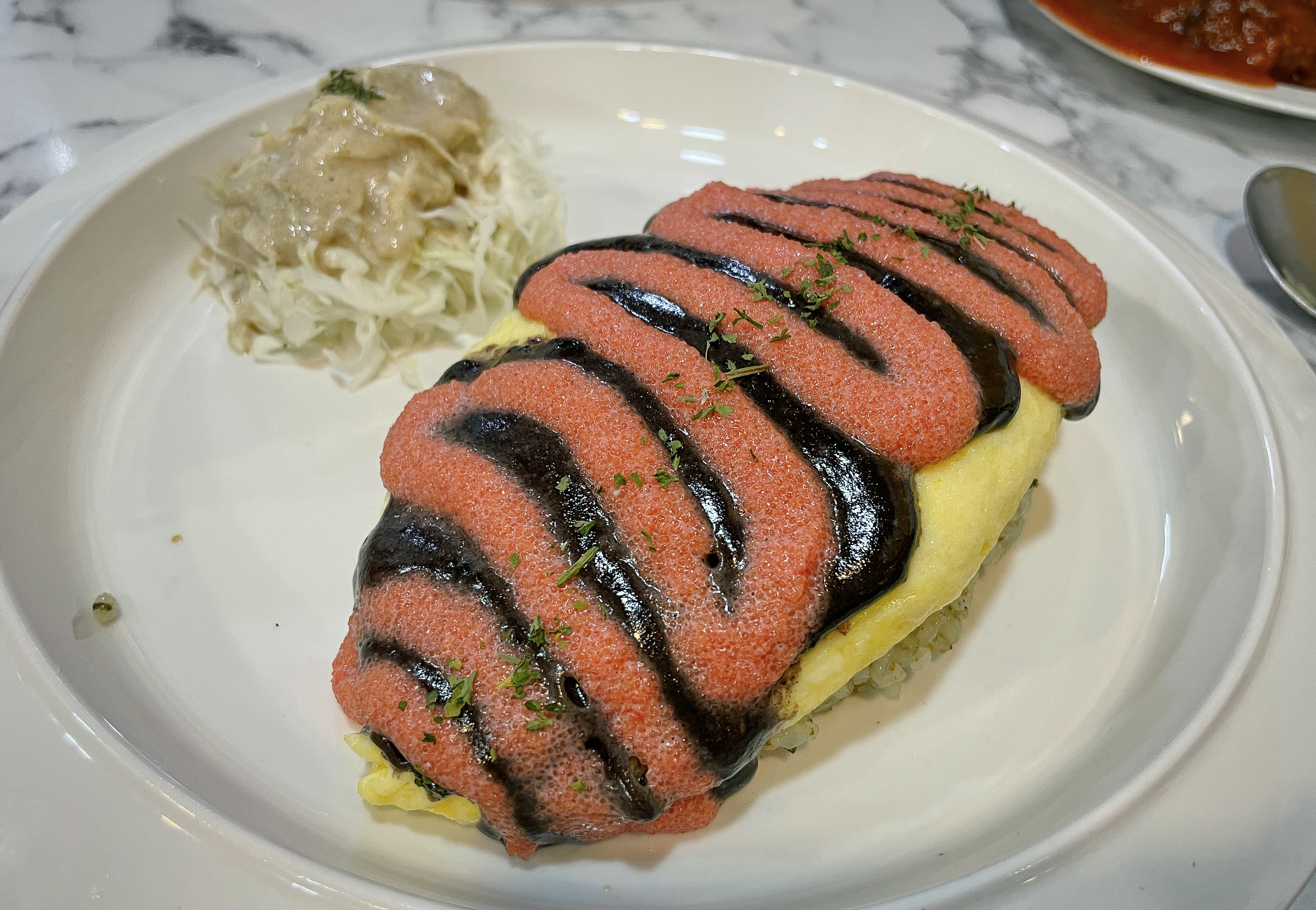 제가 먹은 오믈렛은 명란소스와 김소스로 만든 오믈렛이었습니다. 원래는 오믈렛의 갈라지는 모습을 잘 찍고 싶었는데, 사진을 촬영하느라 그 새 계란이 익어서 깔끔하게 안 벌어지더라고요. 그래도 부드럽고 폭신한 계란과 고슬한 밥이 잘 어울렸고, 와사비마요나 갈릭, 소시지 등 소스가 다 개성있고 맛이 좋았습니다.