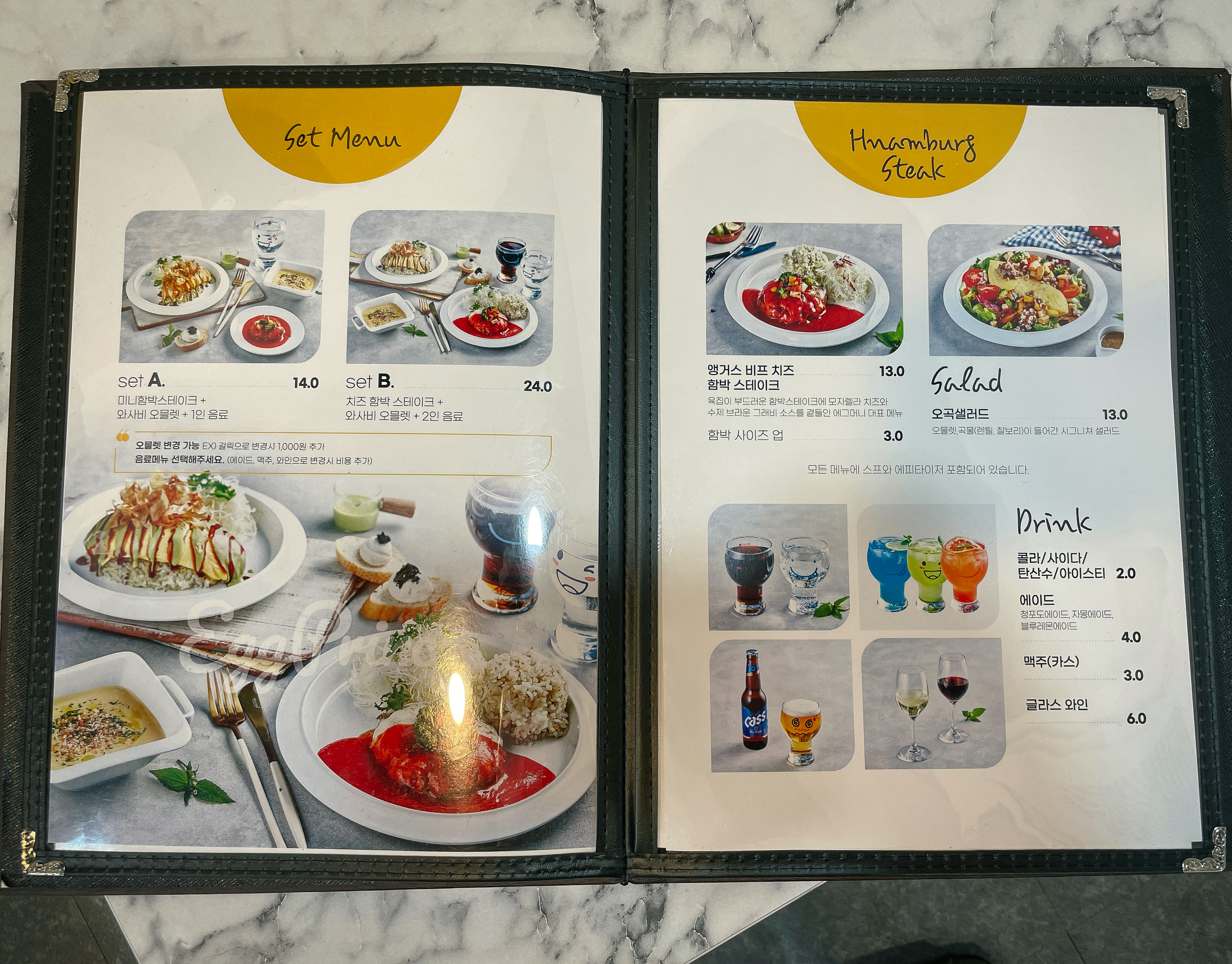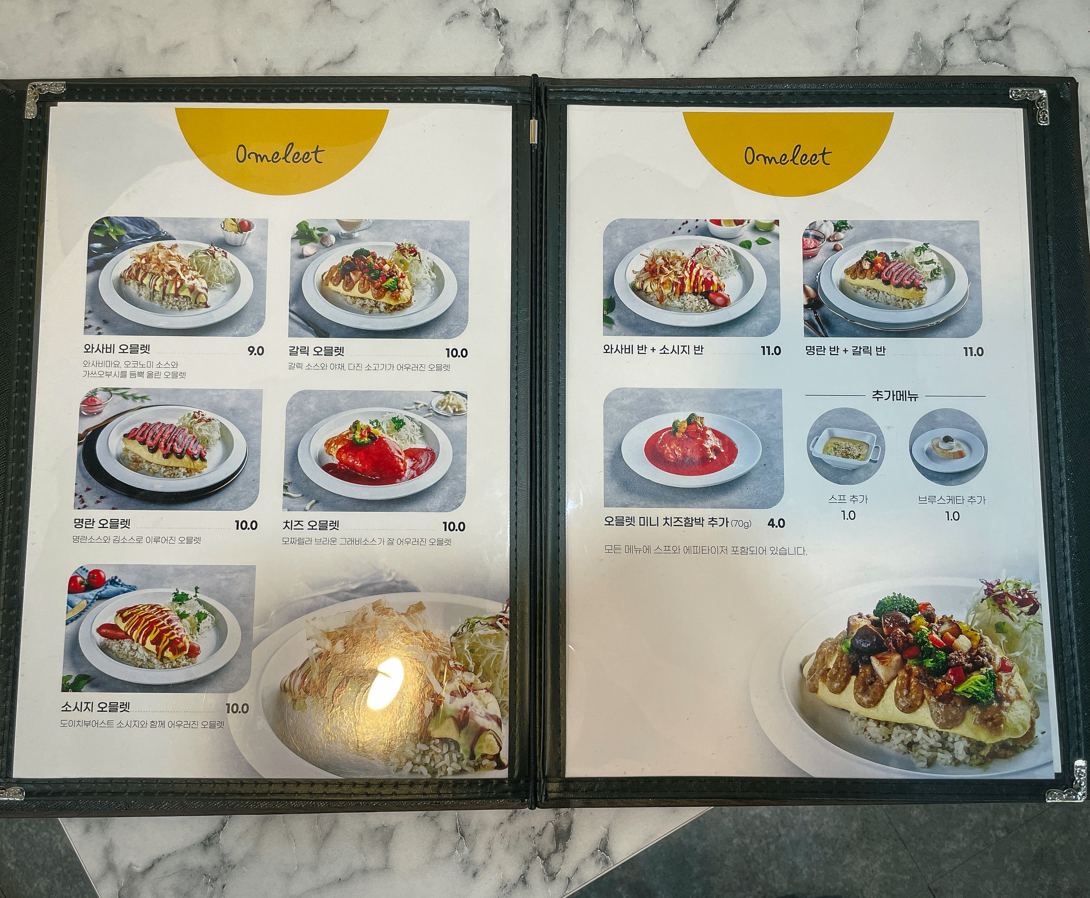 에그프린스의 메뉴는 와사비오믈렛, 갈릭오믈렛, 명란오믈렛, 치즈오믈렛, 소시지오믈렛, 반반메뉴, 앵거스비프치즈함박스테이크, 오곡샐러드, 미니치즈함박, 스프, 브루스케타가 있었고, 모든 메뉴를 주문하면 스프와 함께 브루스케타가 기본적으로 제공되고 있었습니다. 메인 메뉴인 오믈렛의 경우 9,000원~10,000원 사이로 부담없는 금액에 판매하고 있었습니다.