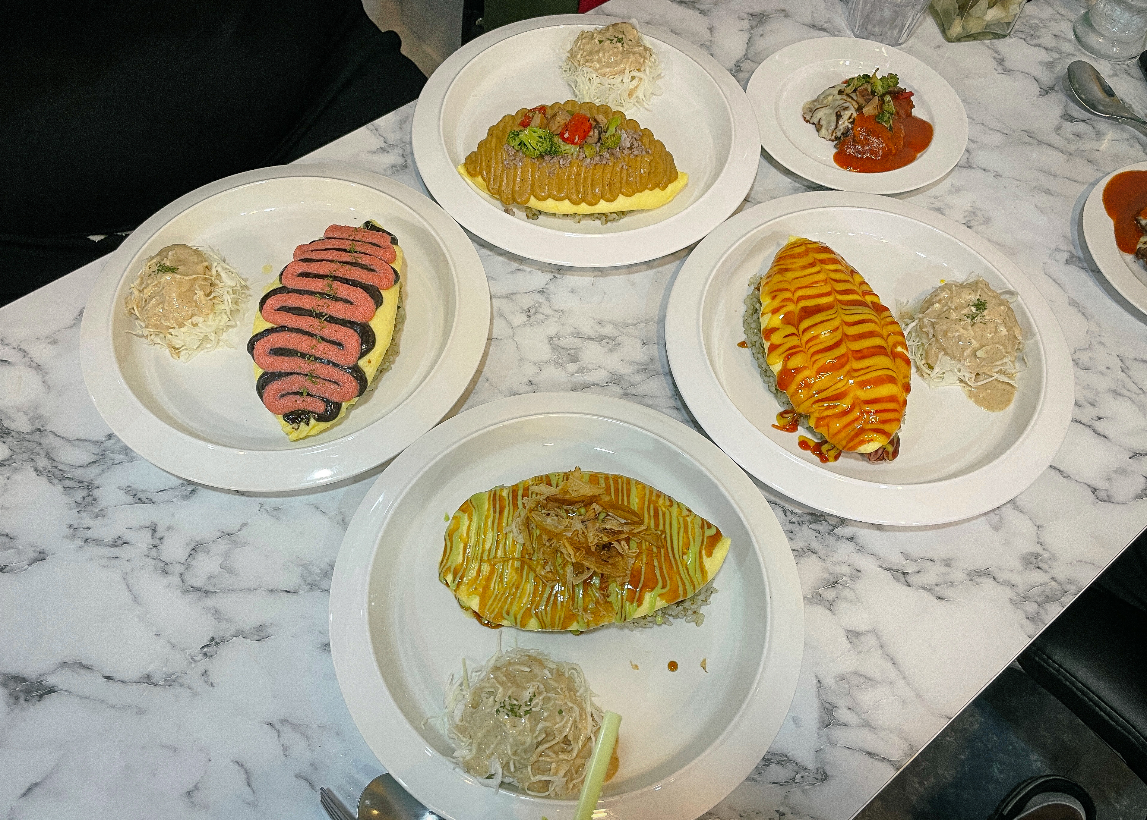에피타이저로 제공된 브루스케타와 옥수수스프는 가볍게 먹기좋은 부담없는 메뉴였고, 자극적인 맛이 없어서 본 메뉴인 오므라이스의 맛을 방해하지 않았습니다. 곧이어 저희가 주문한 와사비오믈렛, 갈릭오믈렛, 명란오믈렛, 소시지오믈렛이 나왔습니다.