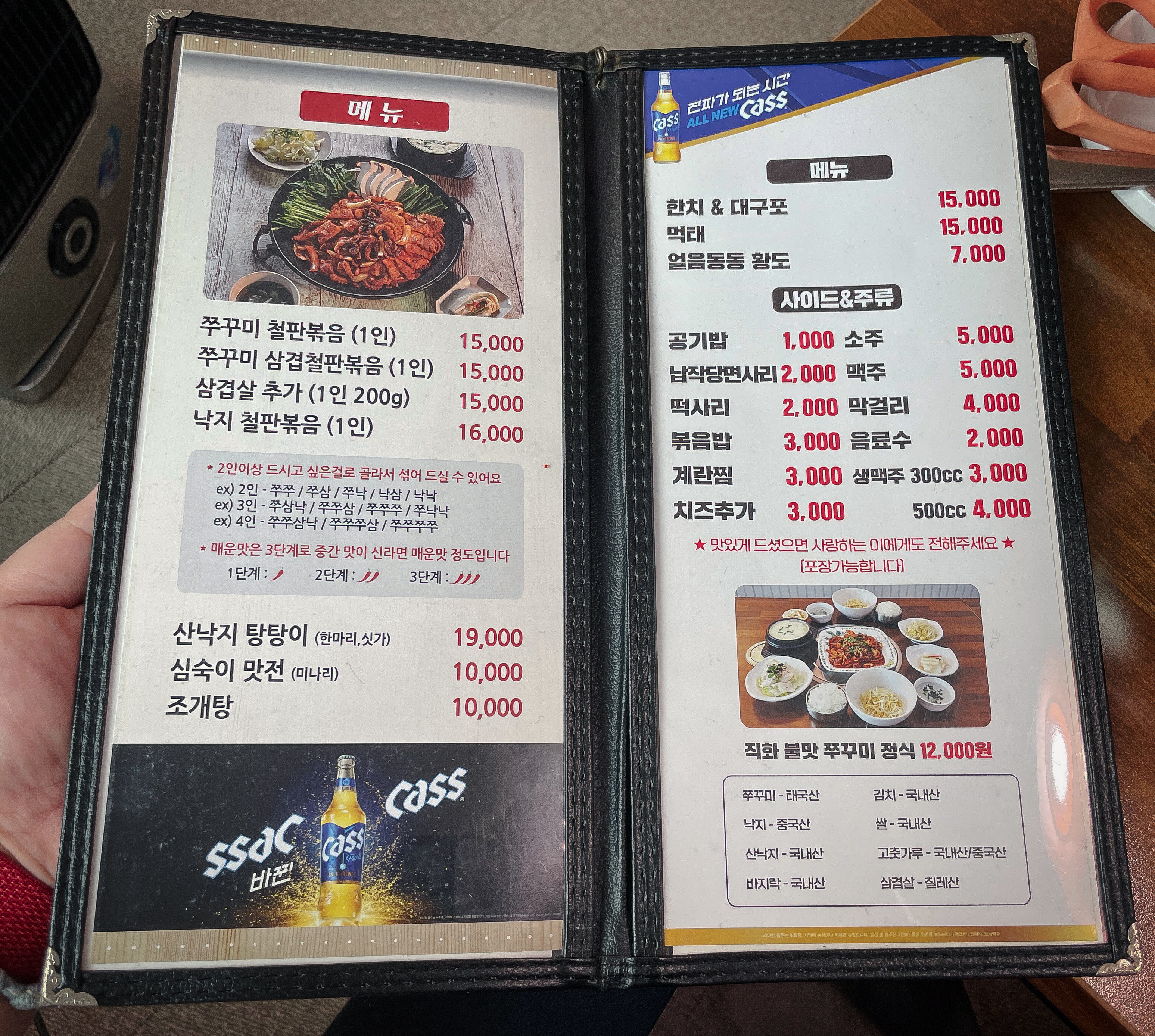 가락동 오심숙이쭈삼낙의 메뉴는 쭈꾸미철판볶음, 쭈꾸미삼겹철판볶음, 낙지철판볶음, 산낙지탕탕이, 심숙이맛전, 조개탕, 직화불맛쭈꾸미정식, 직화불맛쭈꾸미볶음 등이 있었습니다. 저희는 점심특선 직화불맛쭈꾸미볶음을 주문했습니다. 가격은 1인 10,000원에 주꾸미 볶음과 계란찜으로 구성된 메뉴였습니다.
