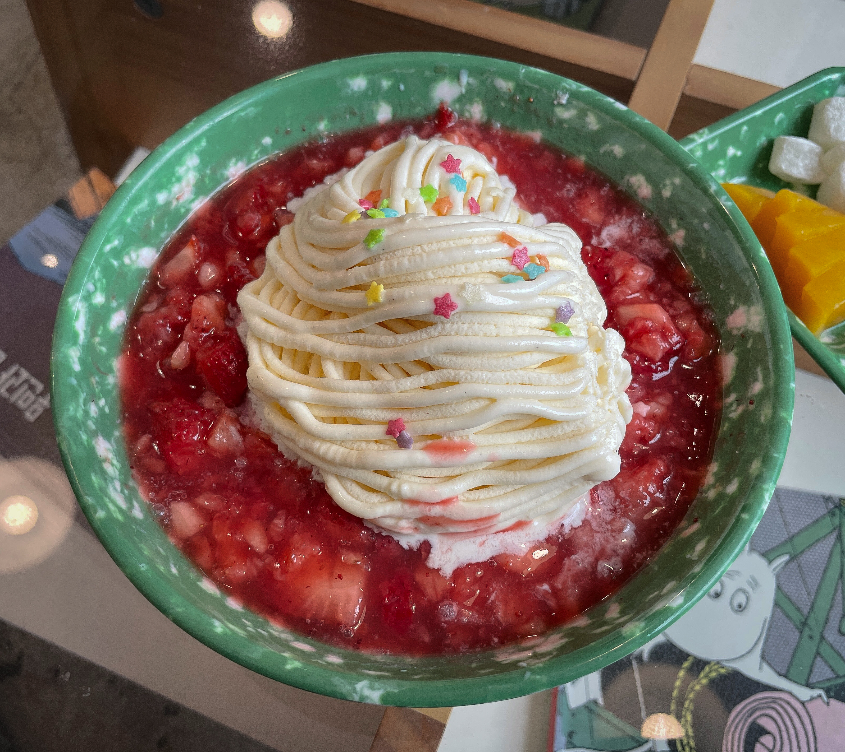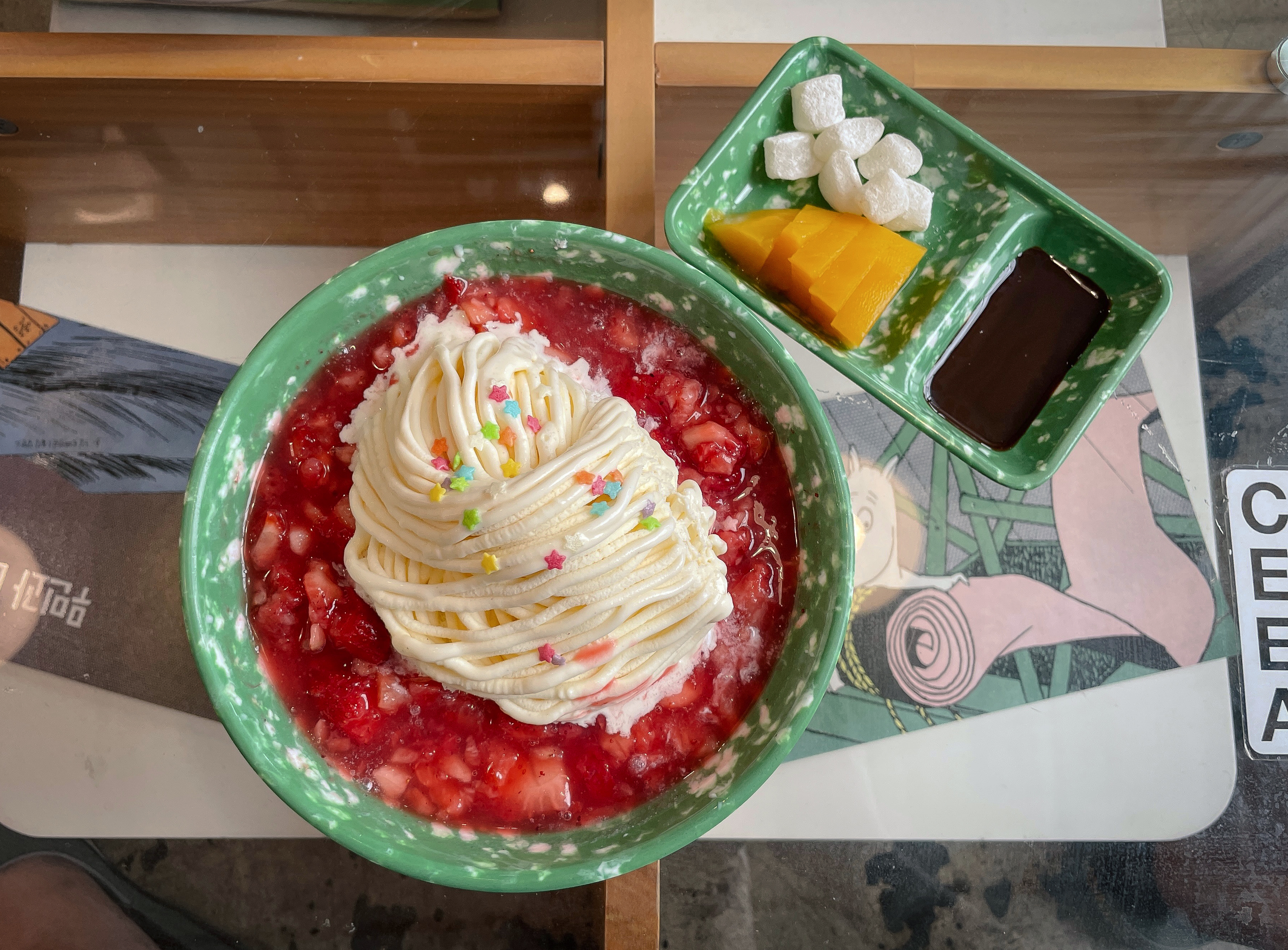 짬뽕 빙수는 딸기와 아이스크림이 부드럽게 잘 어울렸고, 특히 아이스크림을 면발처럼 뽑아낸 것은 이 가게만의 노하우 같았습니다. 짬뽕빙수 위에 시럽과 고명까지 얹어서 완성시켜주었습니다. 확실히 모양도 재미있고, 맛도 좋아서 그런지 유쾌한 시간이었고, 특히 사장님도 친절하셔서 먹는 내내 편안했습니다. 이색적인 빙수에 관심이 있으신 분은 한 번 이용해보셔도 좋을 것 같습니다.