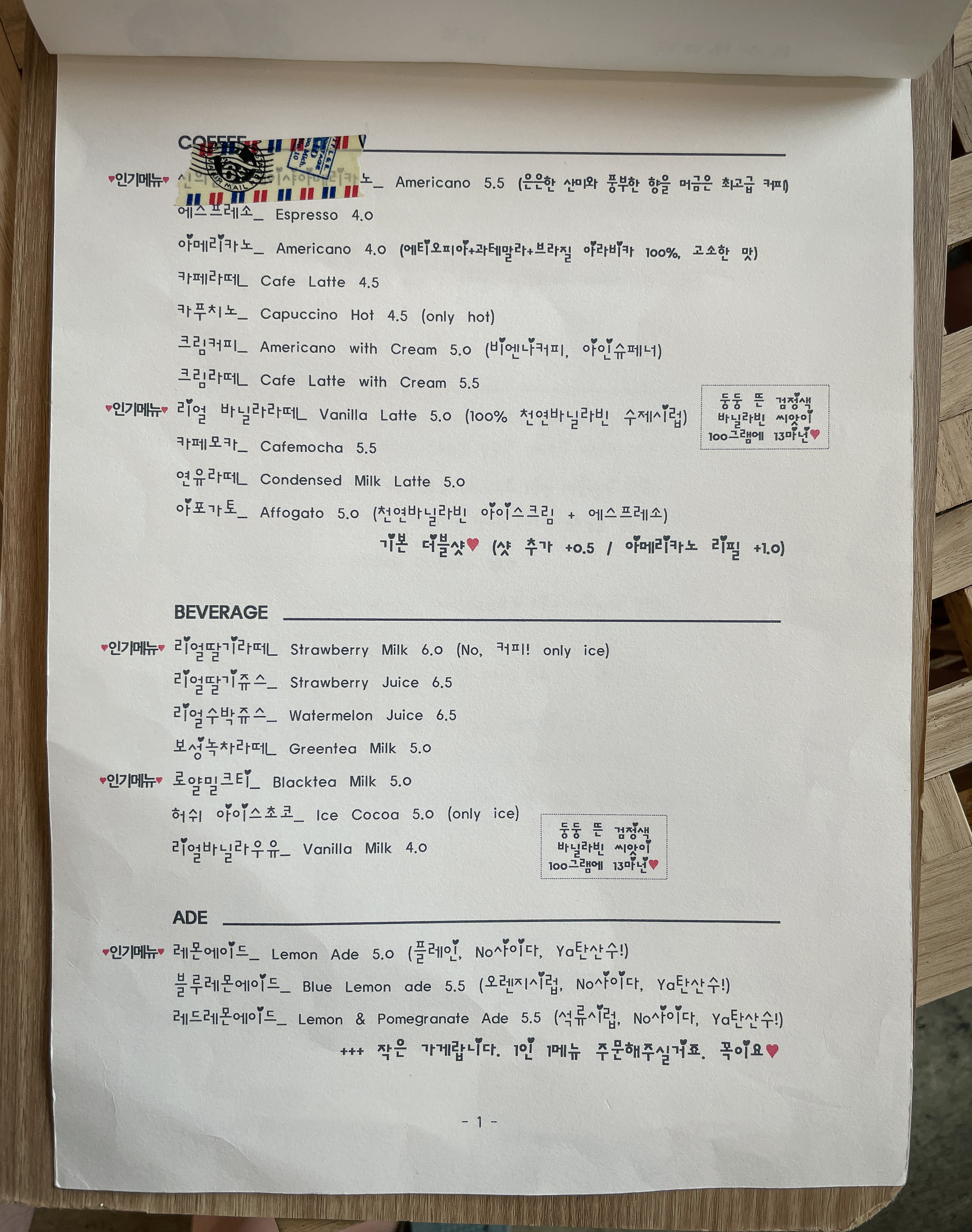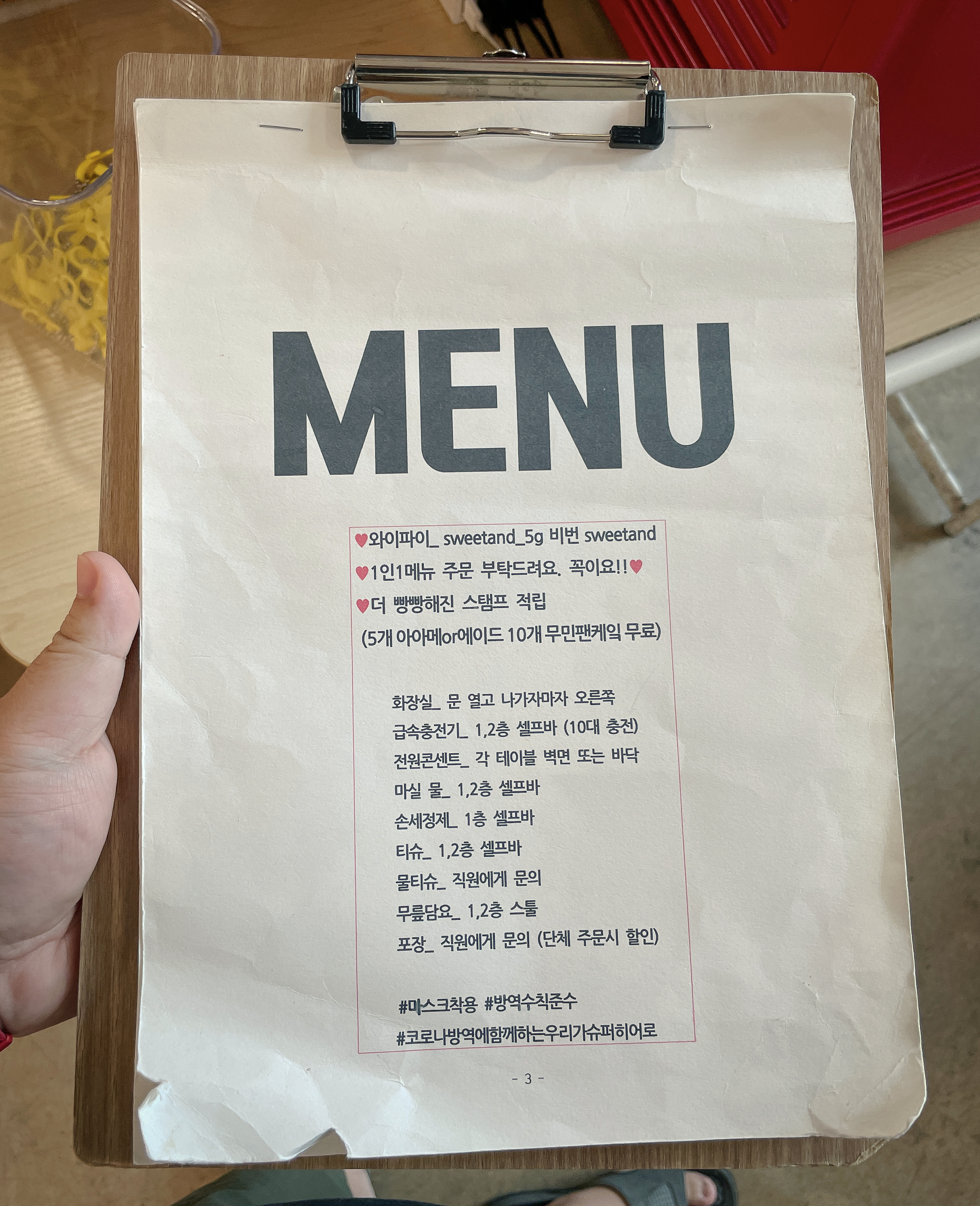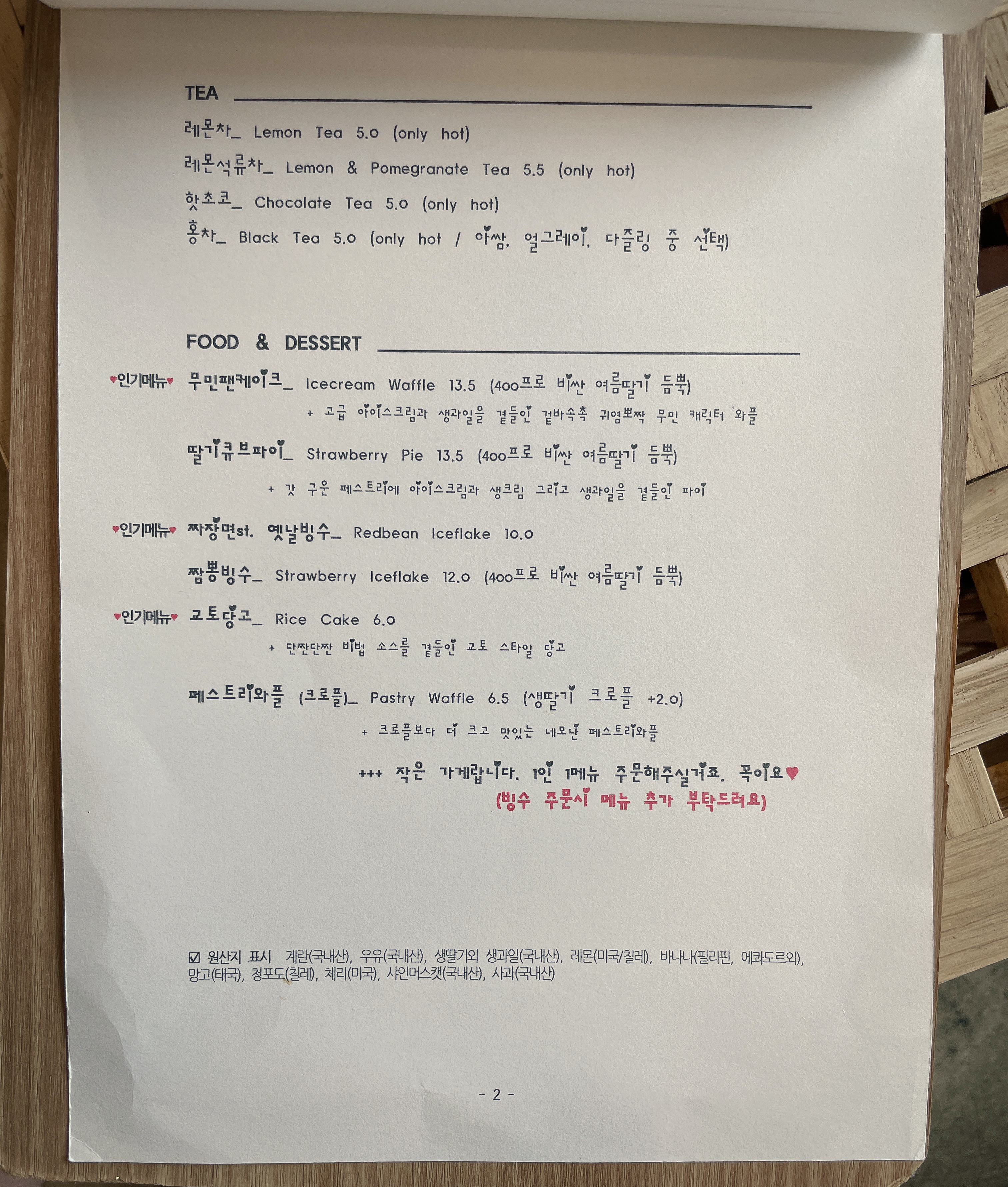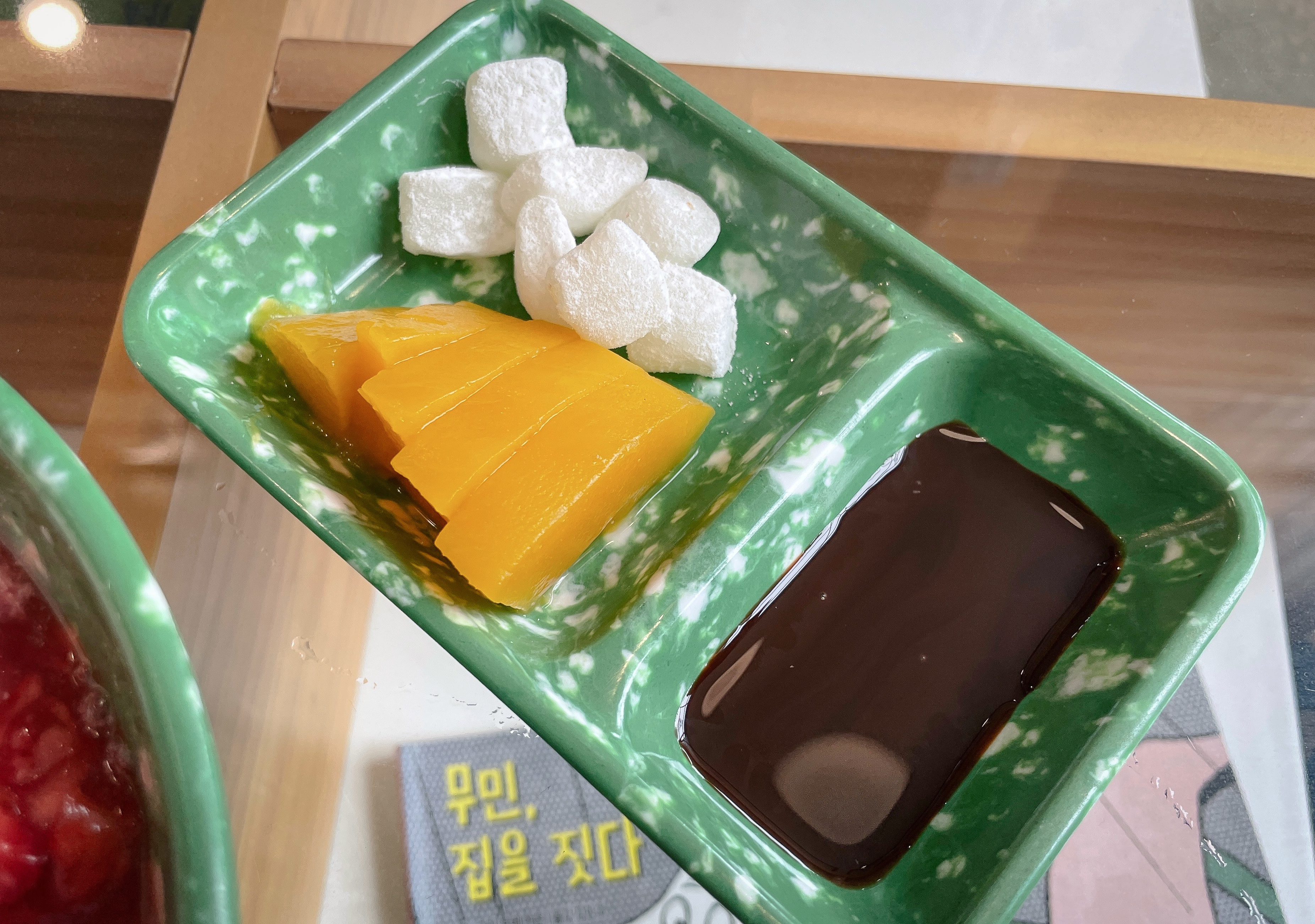 스위트앤드는 무민케이크, 페스트리와플, 교토당고, 큐브파이, 딸기라떼, 짜장면빙수, 짬뽕빙수 등이 있었습니다. 물론 카페이기 때문에 커피나 음료도 팔고 있었습니다. 저의 목적은 짜장면 빙수였기 때문에 짜장면 빙수를 확인하다가, 짬뽕 빙수도 판매하는 것을 보고 짬뽕 빙수로 주문을 했습니다. (짜장빙수는 10,000원, 짬뽕빙수는 12,000원 이었습니다.)