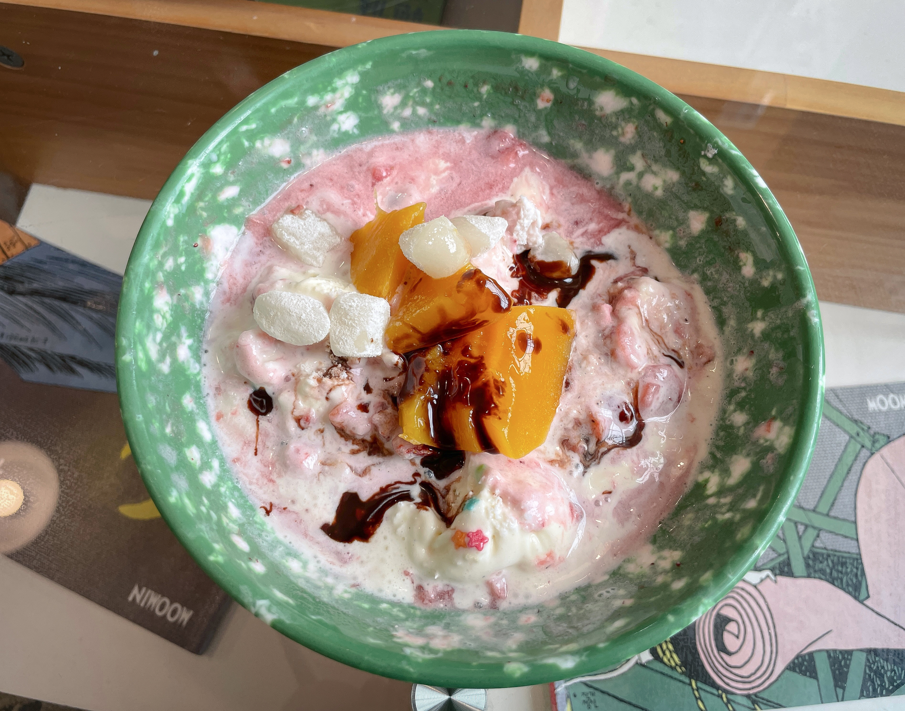 짬뽕 빙수는 딸기와 아이스크림이 부드럽게 잘 어울렸고, 특히 아이스크림을 면발처럼 뽑아낸 것은 이 가게만의 노하우 같았습니다. 짬뽕빙수 위에 시럽과 고명까지 얹어서 완성시켜주었습니다. 확실히 모양도 재미있고, 맛도 좋아서 그런지 유쾌한 시간이었고, 특히 사장님도 친절하셔서 먹는 내내 편안했습니다. 이색적인 빙수에 관심이 있으신 분은 한 번 이용해보셔도 좋을 것 같습니다.