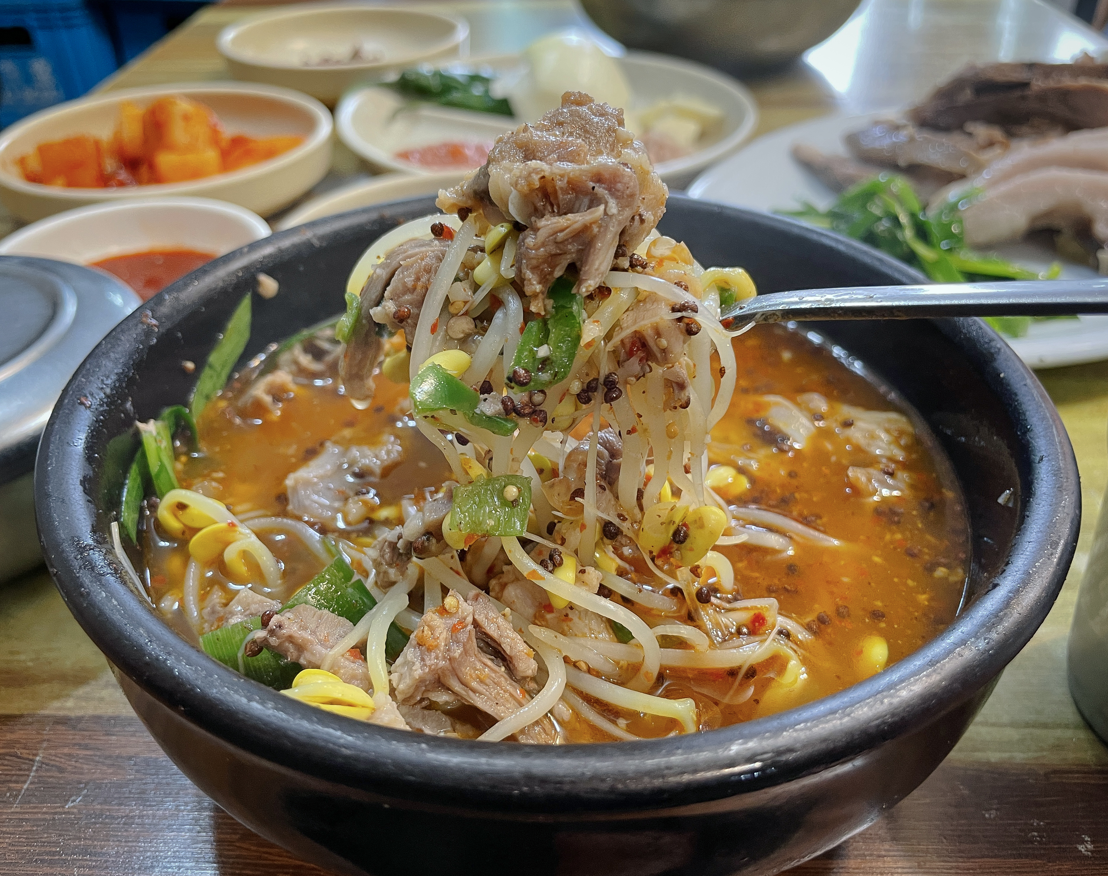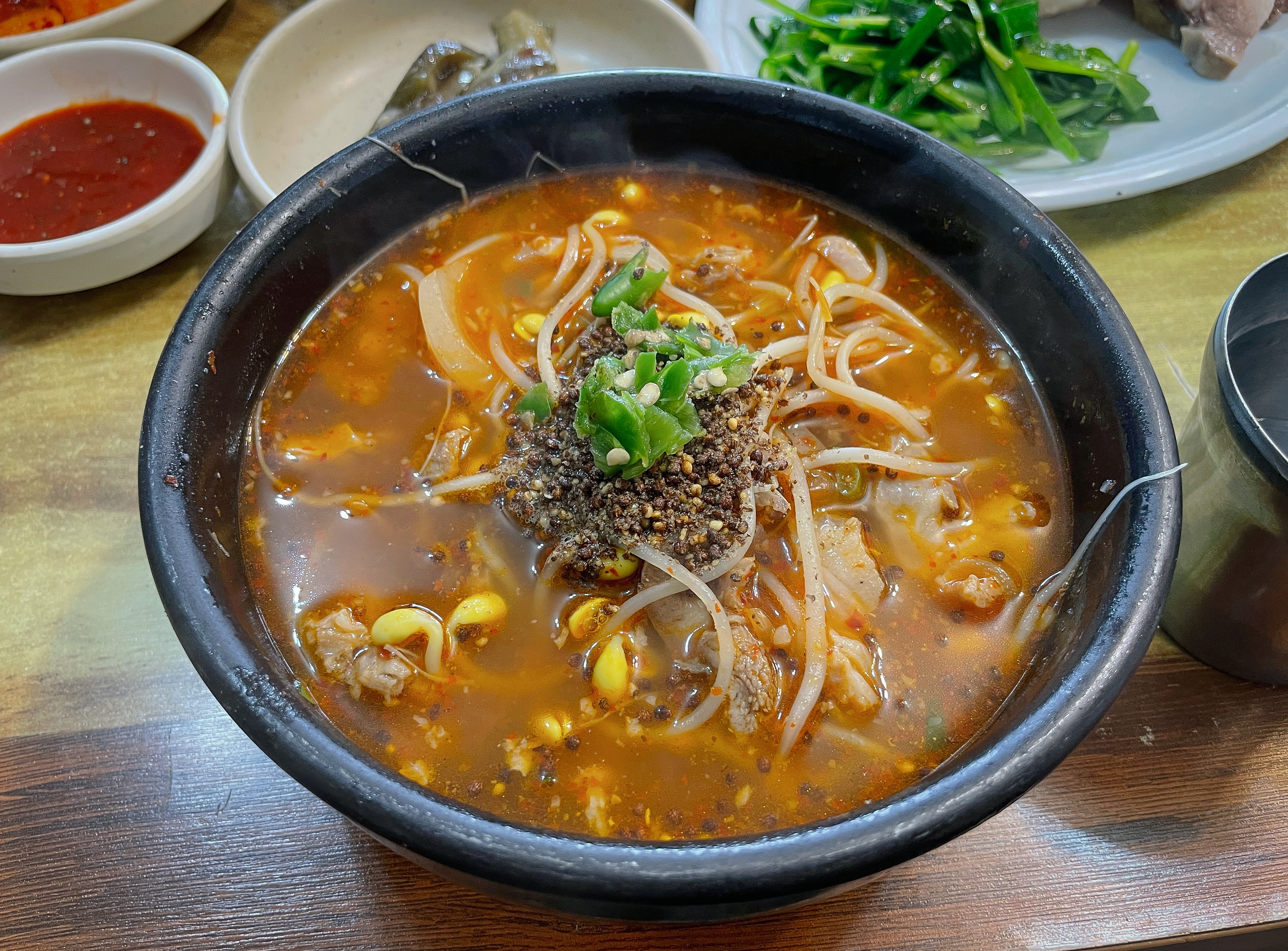 국밥에는 콩나물과 부추, 수육, 들깨, 고추가 들어갔는데, 보통 돼지국밥 하면 기름진 국물에 약간 느끼한 맛이 있는데 이 국밥은 콩나물도 들어가 깔끔하면서도 담백한 국물이 일품이었습니다. 청양고추도 들어가 칼칼한 느낌도 있었습니다. 이게 처음 먹어보는 맛이었는데, 무겁지 않으면서도 적당한 맛이 계속 당기더라고요.