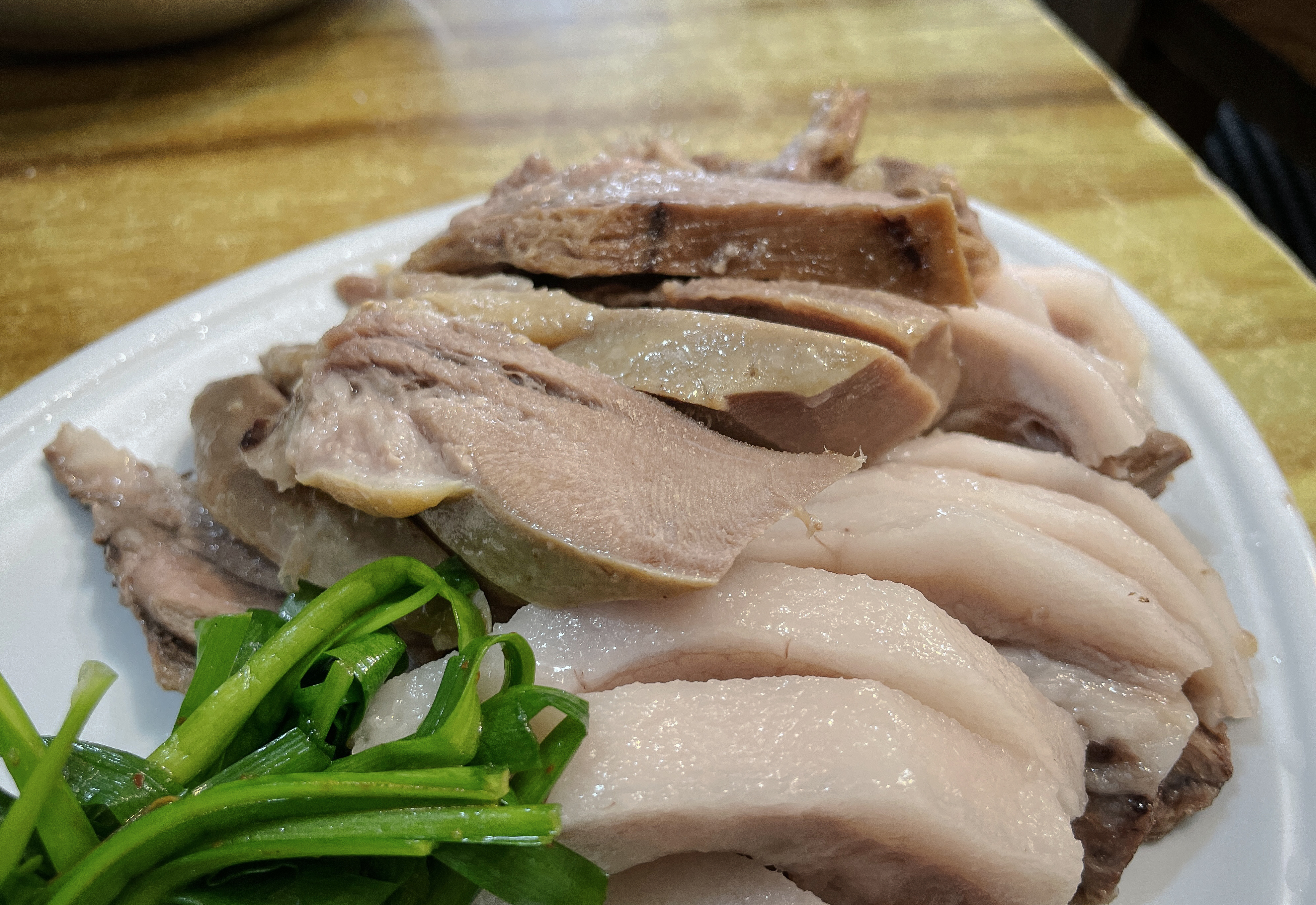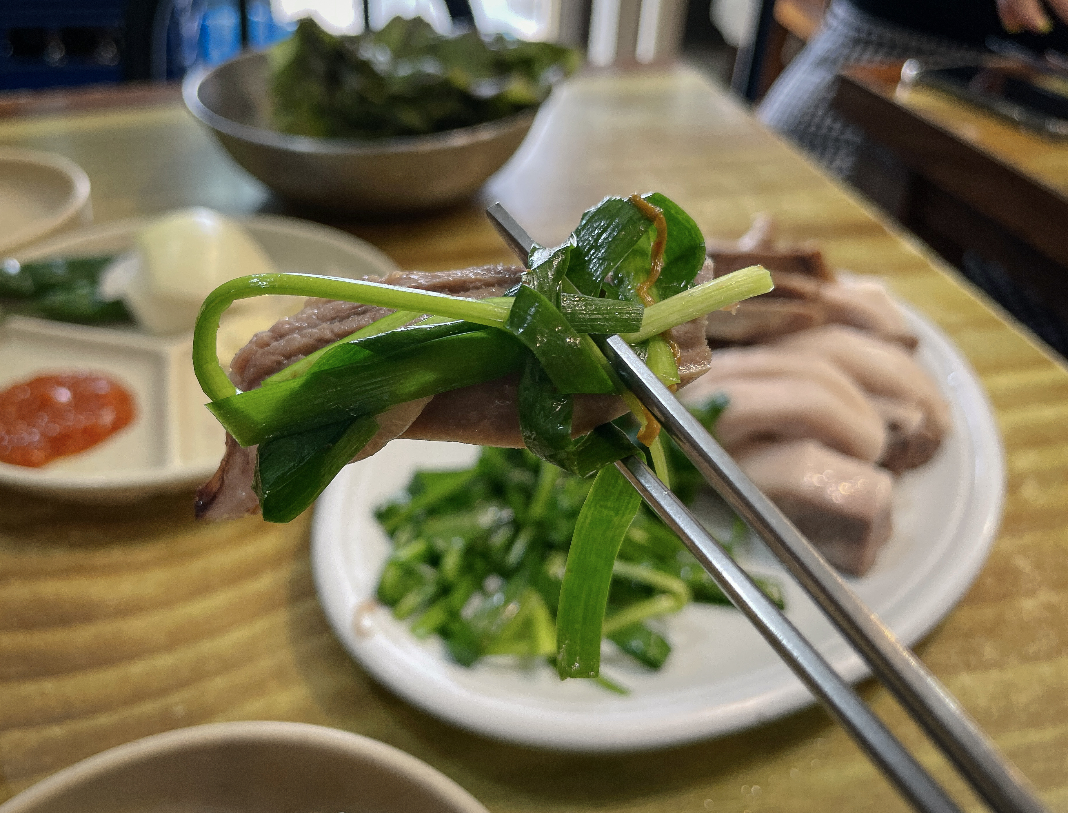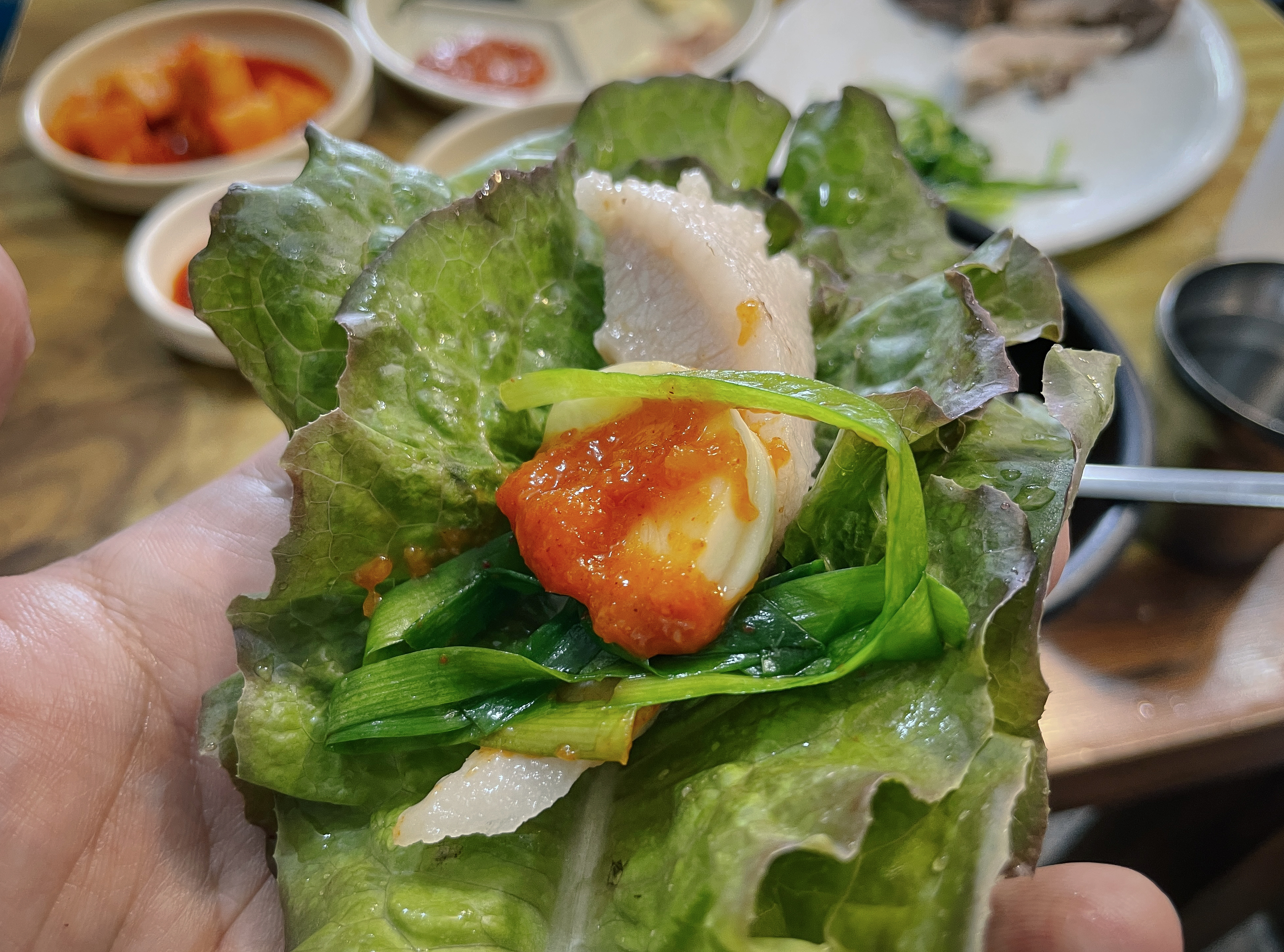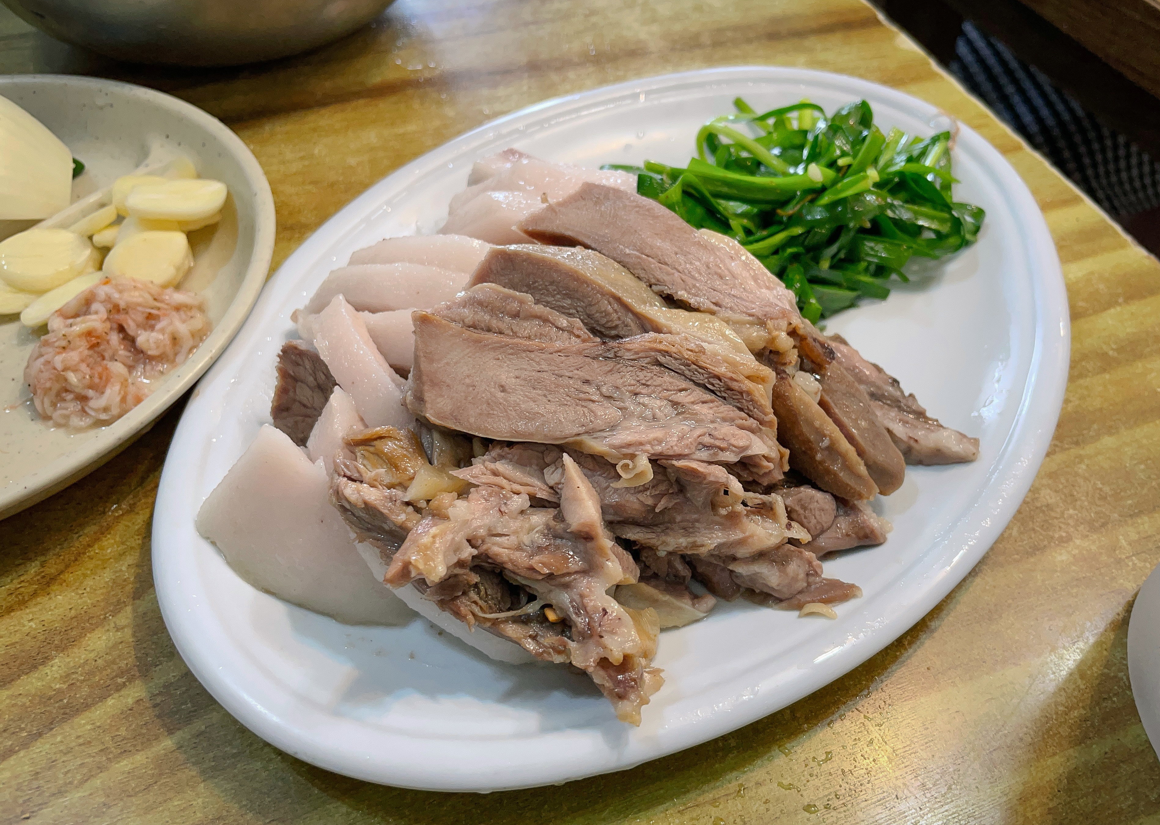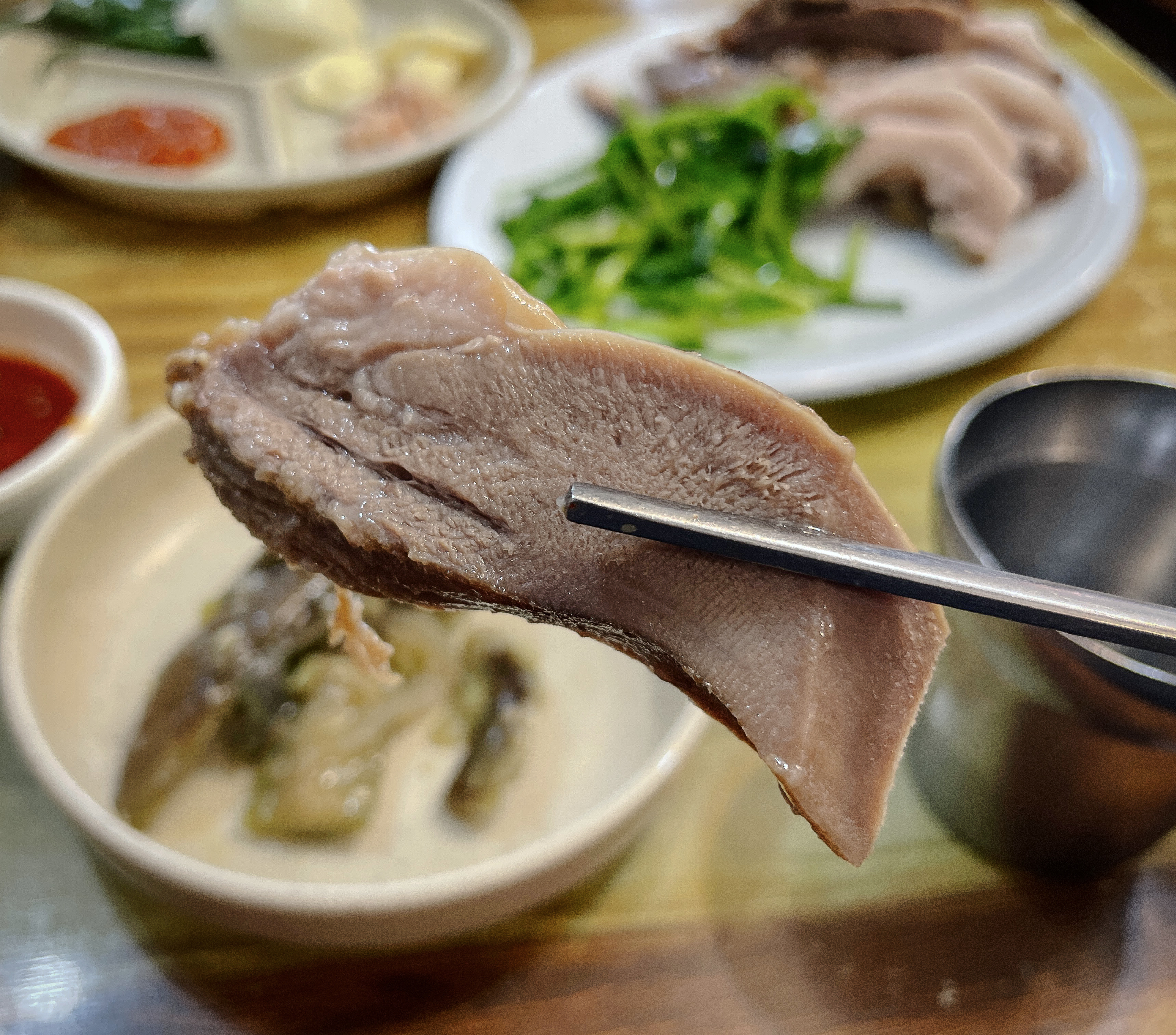 수육은 한 입 가득 찰 정도로 도톰하게 썰어져 나왔는데, 잡내도 안 나고 부드러우면서도 탄력 있게 잘 삶아져서 고기 씹는 질감도 좋았고, 육즙도 있었습니다. 그냥 먹어도 맛있지만, 초장이나 쌈장, 부추와 곁들이는 것도 좋았습니다.