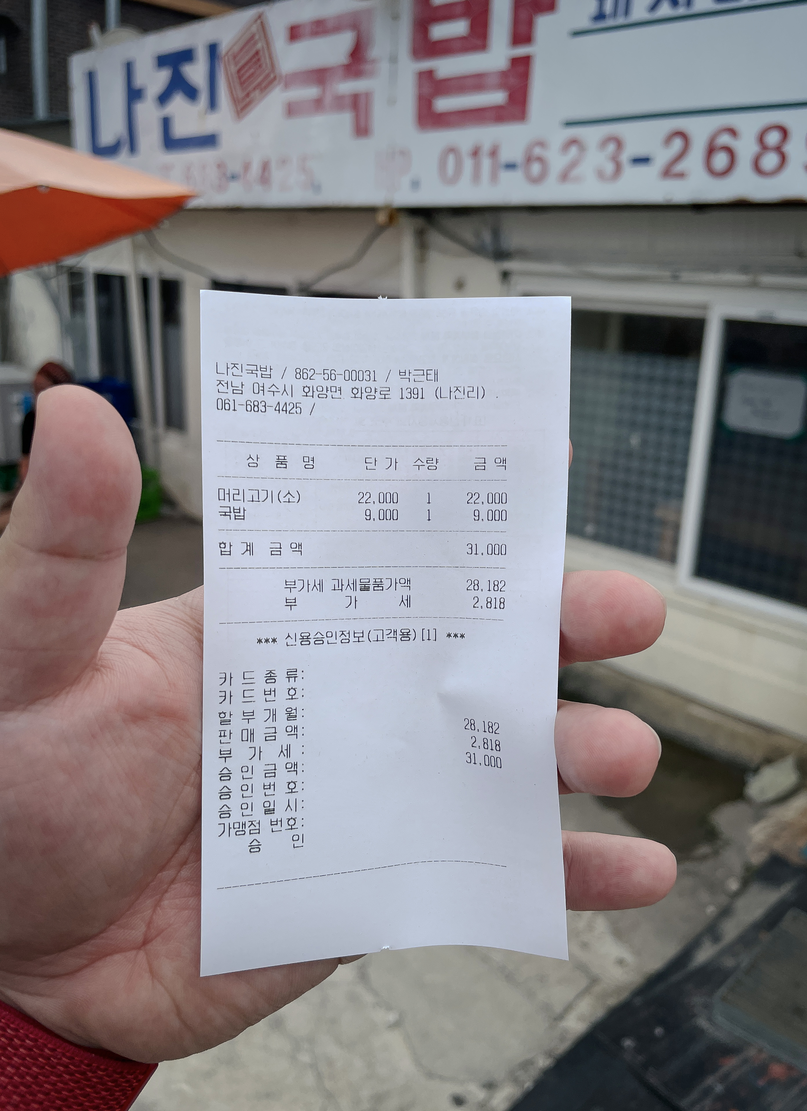 나진국밥은 전남 여수시 화양면 나진리 430-4 에 위치한 가게로, 가게 실내・외 모두 노포답게 오래된 모습을 볼 수 있었습니다. 가게는 TV조선 ⎡식객 허영만의 백반기행⎦KBS 2TV ⎡배틀트립⎦등에서도 소개된 유명 맛집으로 가게 벽면에는 유명인들의 사인이 붙어있는 것을 볼 수 있었습니다.