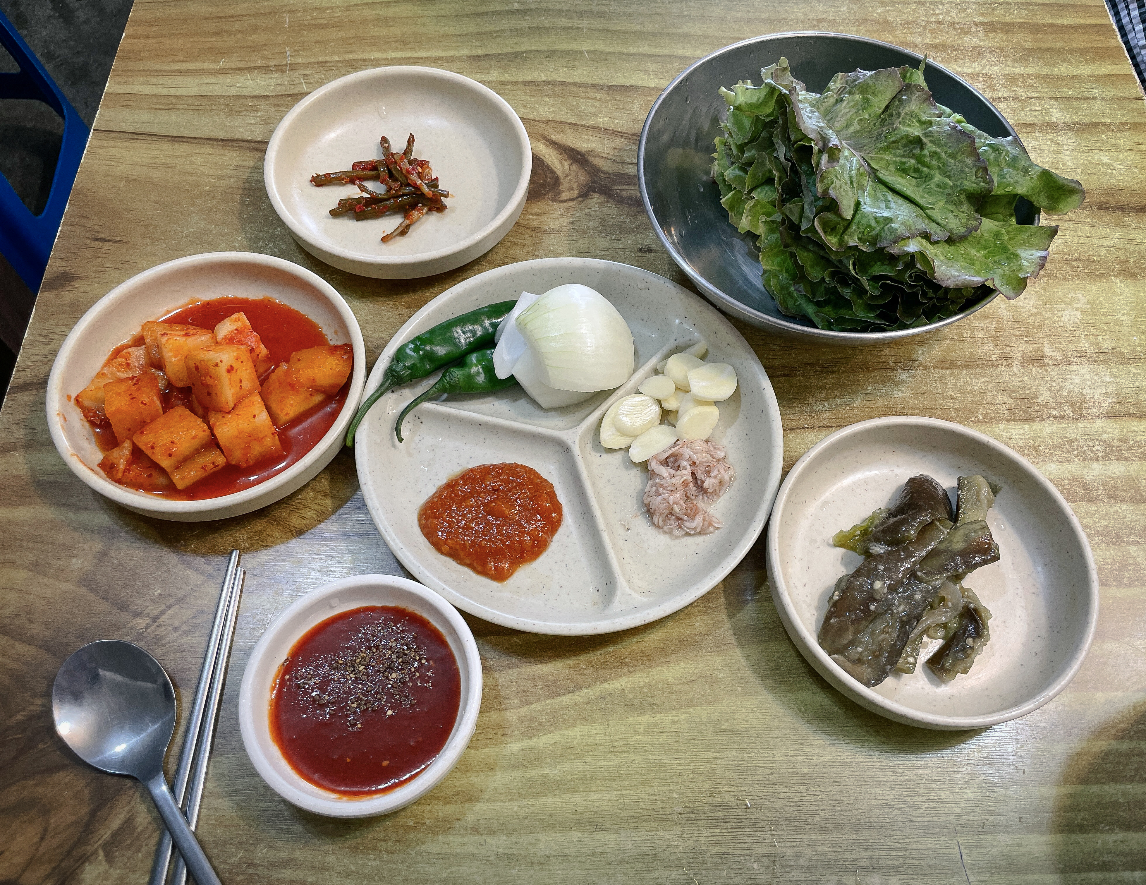 나진국밥의 반찬입니다. 상추, 가지무침, 마늘종 무침, 깍두기와 수육과 곁들일 소스류가 나왔습니다. 독특한 점은 초고추장을 함께 주시는데, 생각보다 수육과 잘 어울리더라고요.