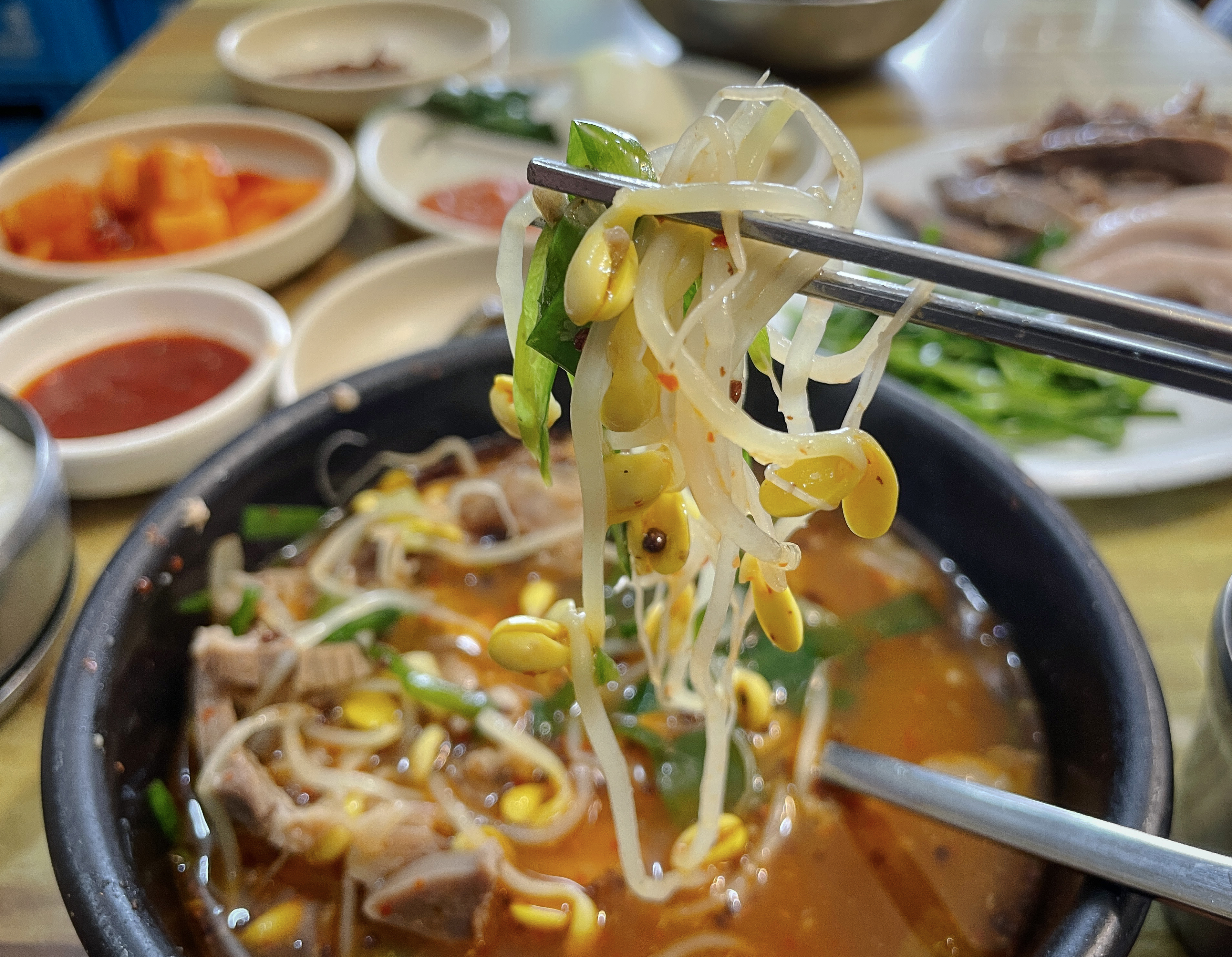 국밥에는 콩나물과 부추, 수육, 들깨, 고추가 들어갔는데, 보통 돼지국밥 하면 기름진 국물에 약간 느끼한 맛이 있는데 이 국밥은 콩나물도 들어가 깔끔하면서도 담백한 국물이 일품이었습니다. 청양고추도 들어가 칼칼한 느낌도 있었습니다. 이게 처음 먹어보는 맛이었는데, 무겁지 않으면서도 적당한 맛이 계속 당기더라고요.