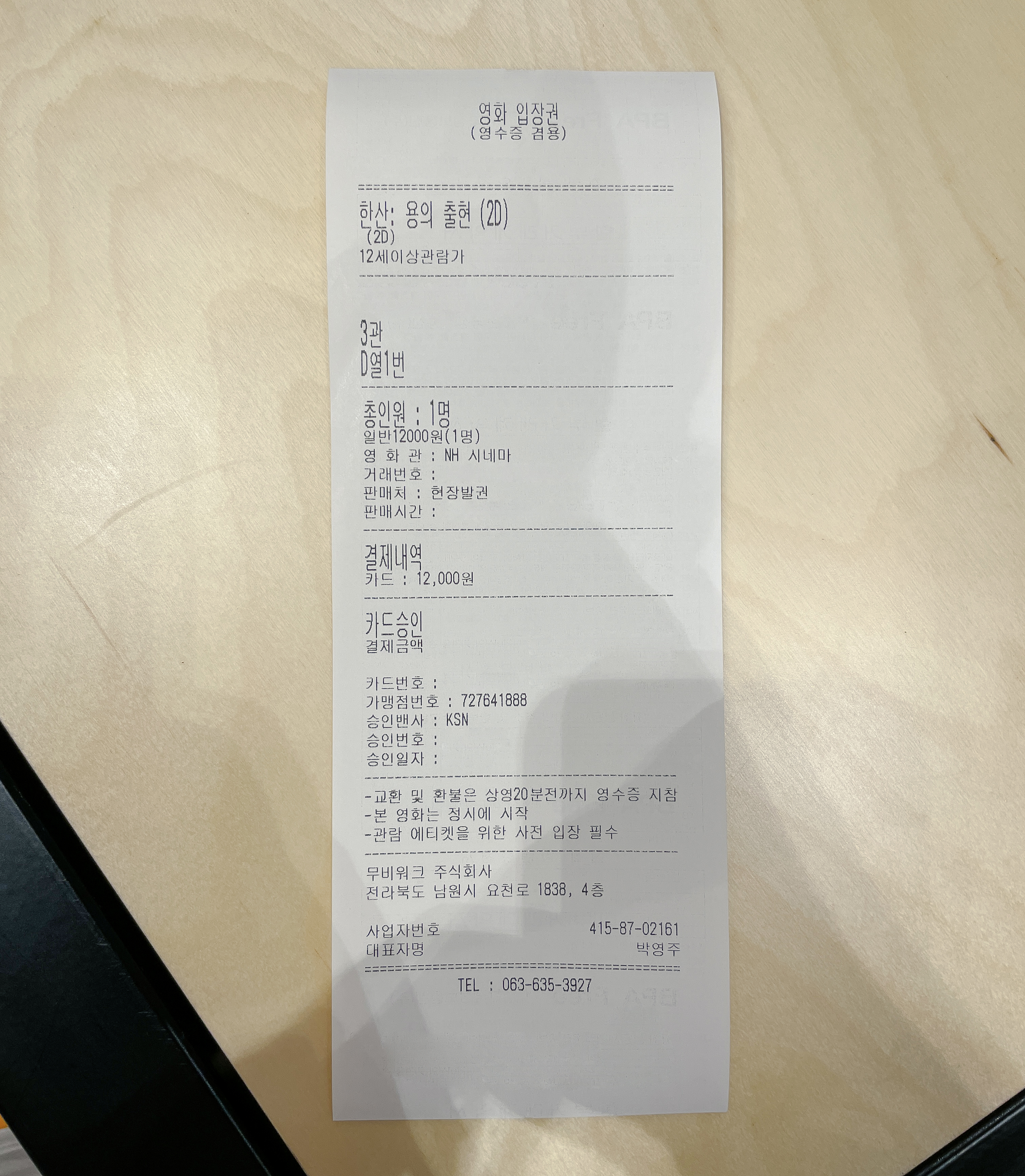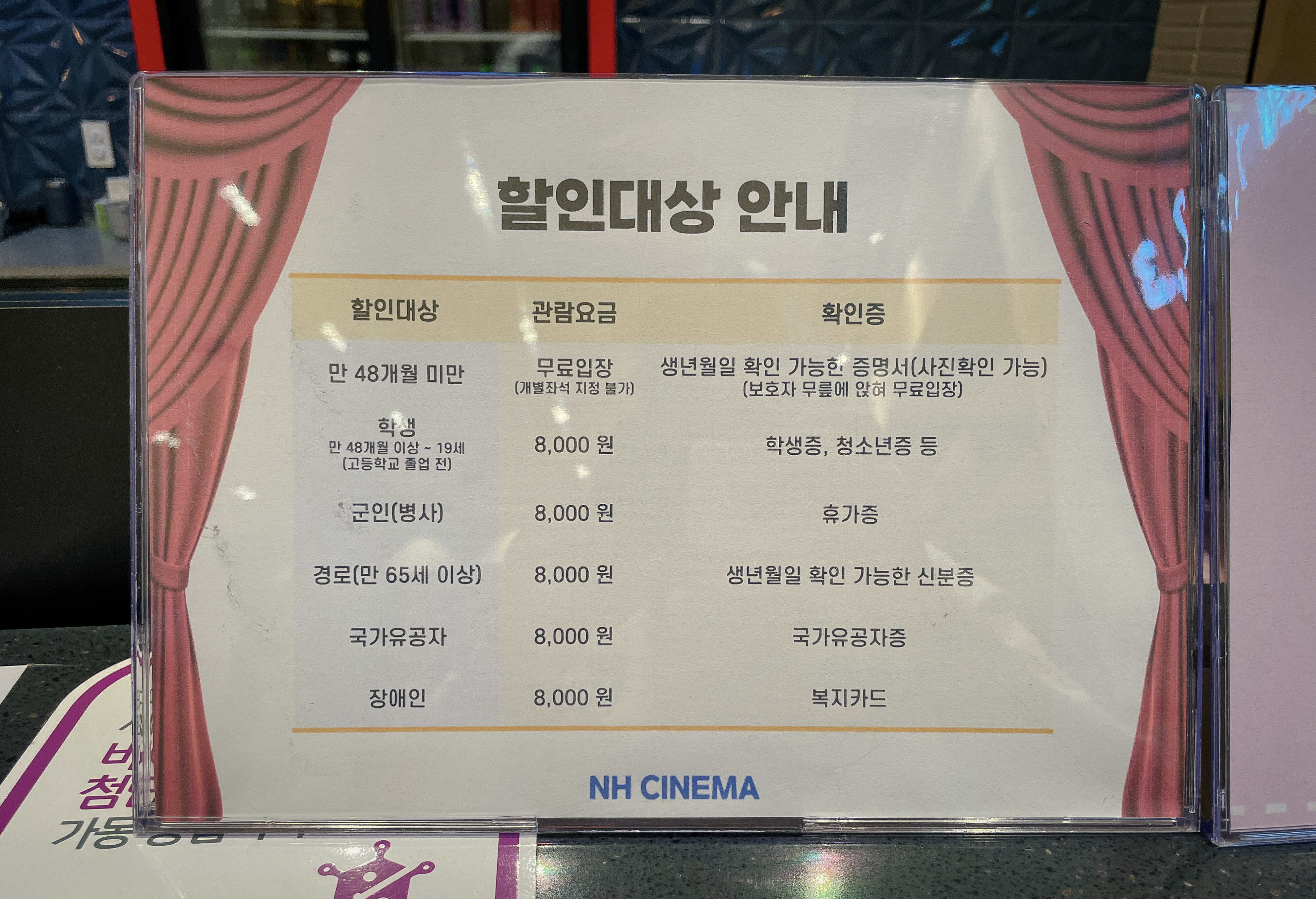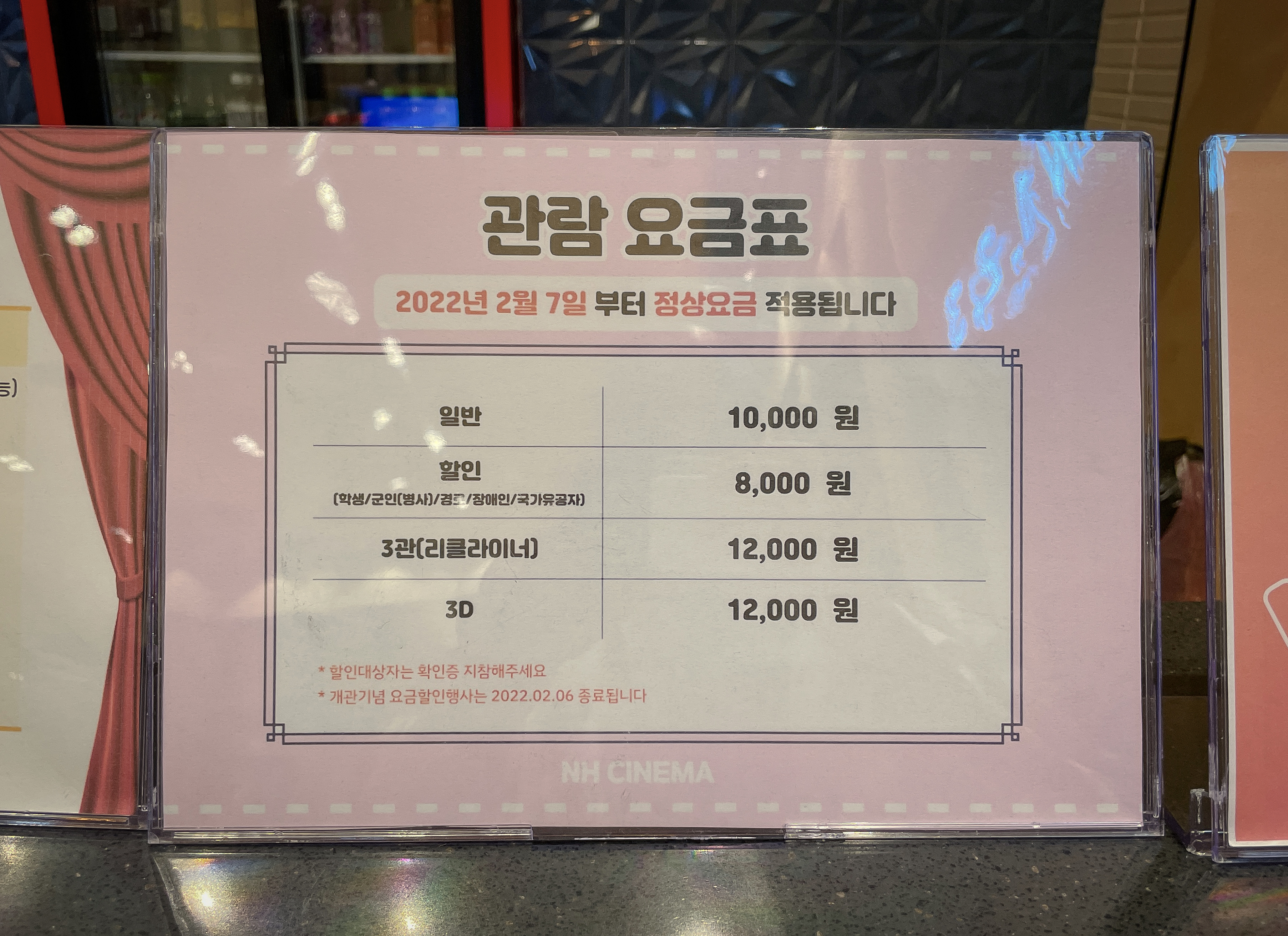 NH시네마의 영화 관람료도 나름 저렴한 편이었습니다. 성인 기준 10,000원이었고, 학생이나 군인 등 할인 대상자는 8,000원에 관람이 가능했습니다. 제가 본 영화 <한산>의 경우 리클라이너 의자가 있는 상영관이라 12,000원의 요금을 받고 있었습니다.