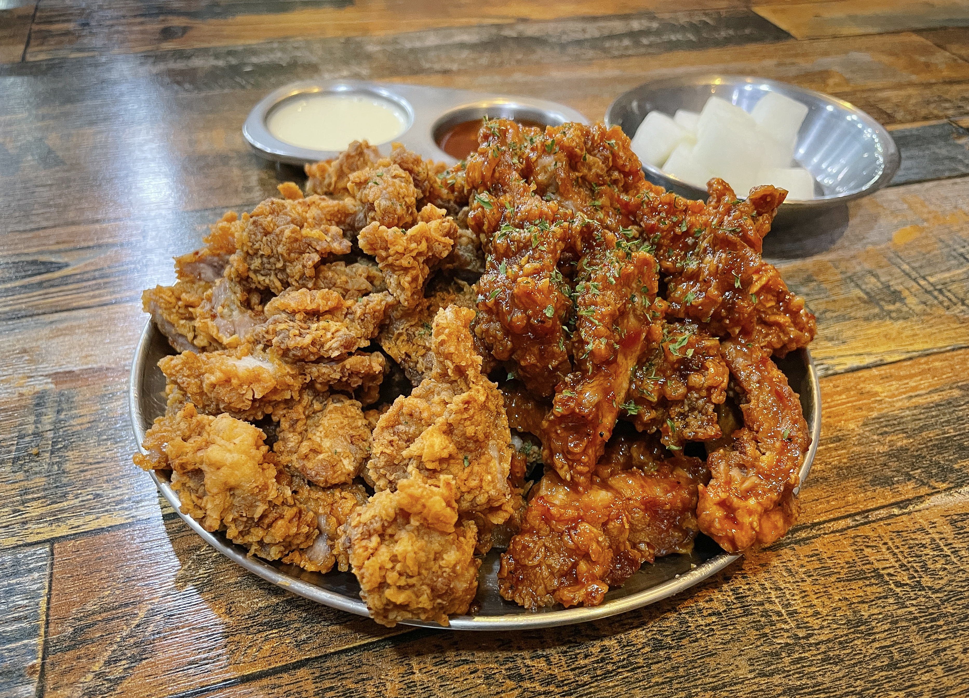 제가 주문한 메뉴는 돼갈반반 메뉴였는데, 돼지갈비 후라이드와 양념 돼지갈비 후라이드가 함께 나오는 메뉴였습니다. 살면서 돼지갈비 튀김은 처음 먹어보는데, 생소한 메뉴라 궁금하기도 하고 기대도 살짝 되더라고요.