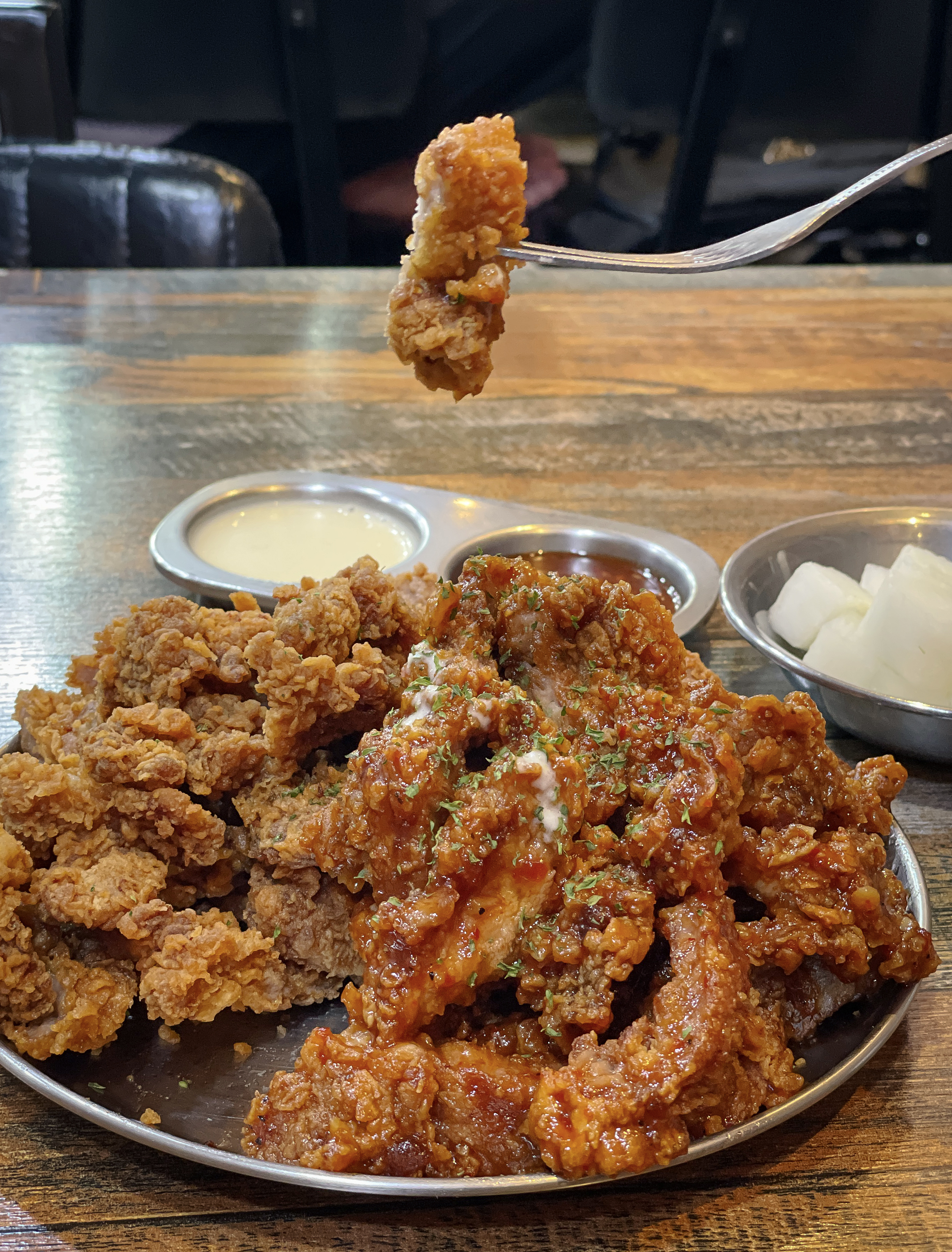 실제로 돼갈후를 집어서 먹어봤는데, 부드러운 돼지갈비 식감과 고기에 배어있는 양념이 적당히 짭조름해서 계속 당기는 맛이 있더라고요. 양념과 후라이드 중 하나만 추천해달라고 하신다면 저는 후라이드를 추천드릴 것 같습니다. 일반 후라이드에 비해 양념은 기존의 돼갈후가 양념되어 있기 때문에 더 짠맛이 강했고, 상대적으로 물리는 맛이 있었기 때문입니다.