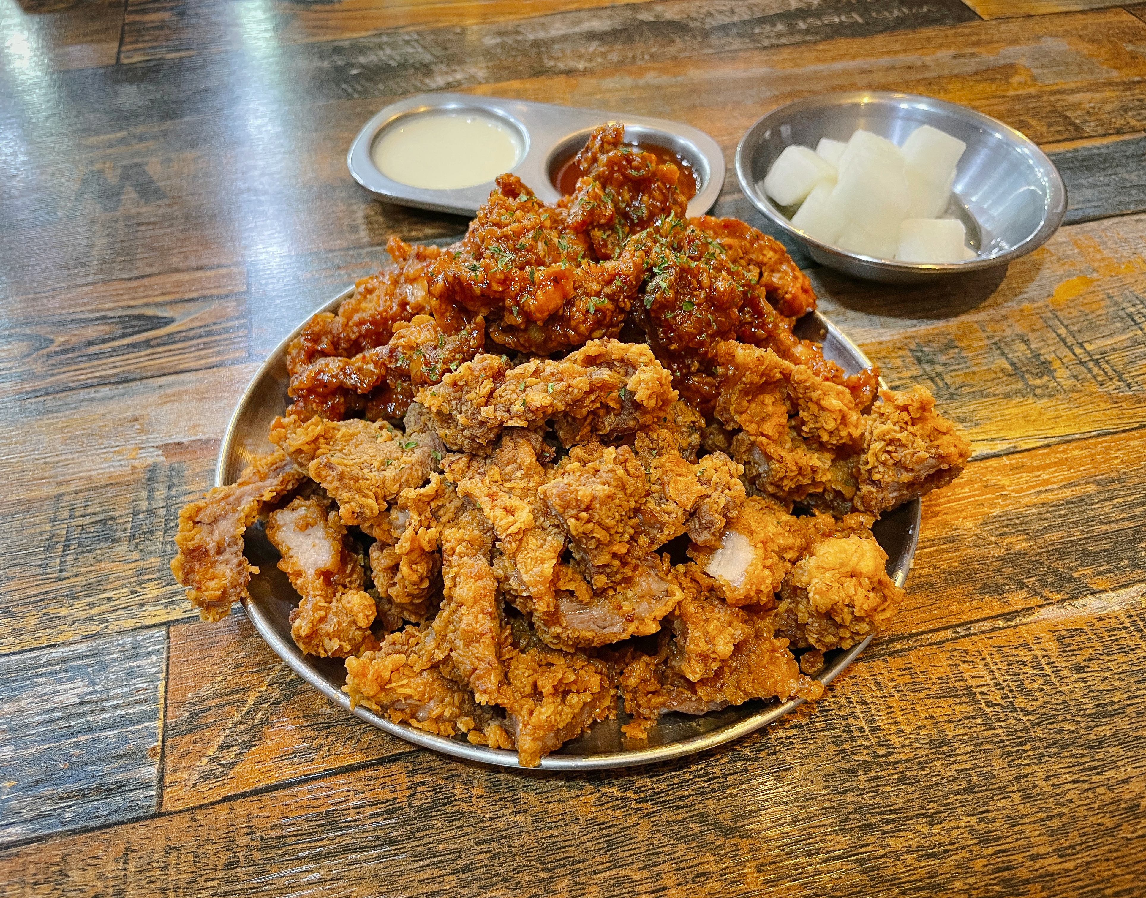 제가 주문한 메뉴는 돼갈반반 메뉴였는데, 돼지갈비 후라이드와 양념 돼지갈비 후라이드가 함께 나오는 메뉴였습니다. 살면서 돼지갈비 튀김은 처음 먹어보는데, 생소한 메뉴라 궁금하기도 하고 기대도 살짝 되더라고요.