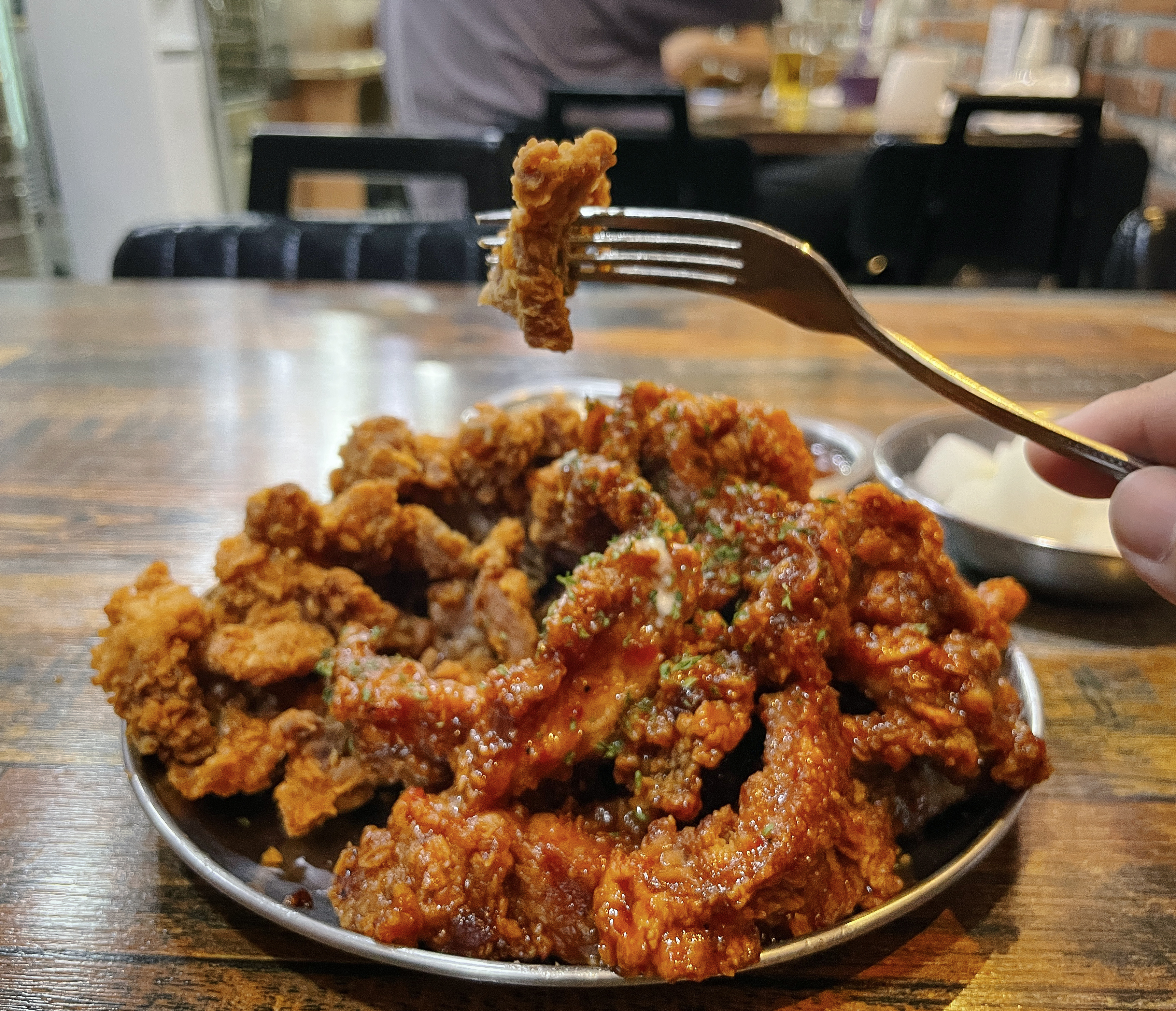 실제로 돼갈후를 집어서 먹어봤는데, 부드러운 돼지갈비 식감과 고기에 배어있는 양념이 적당히 짭조름해서 계속 당기는 맛이 있더라고요. 양념과 후라이드 중 하나만 추천해달라고 하신다면 저는 후라이드를 추천드릴 것 같습니다. 일반 후라이드에 비해 양념은 기존의 돼갈후가 양념되어 있기 때문에 더 짠맛이 강했고, 상대적으로 물리는 맛이 있었기 때문입니다.