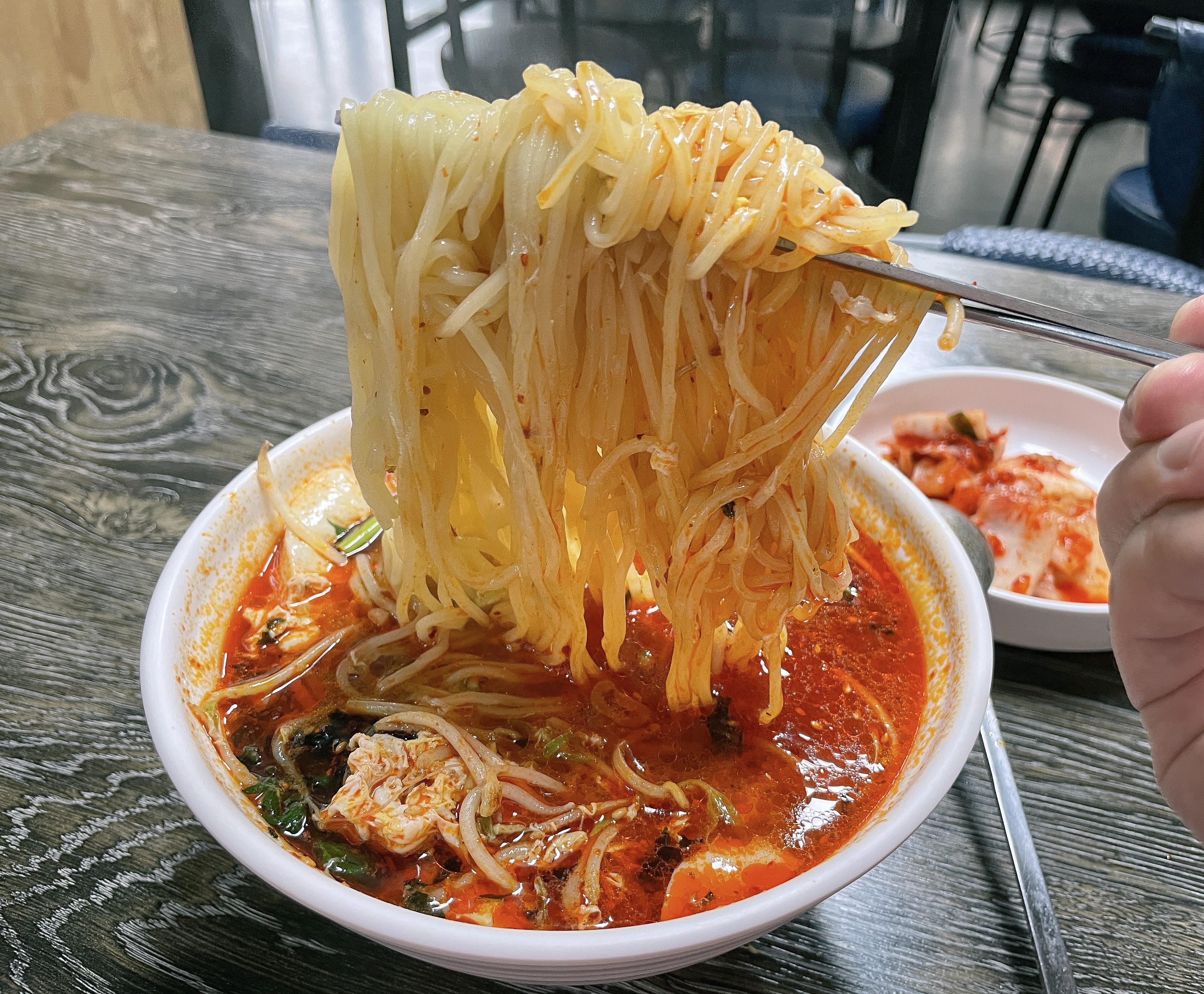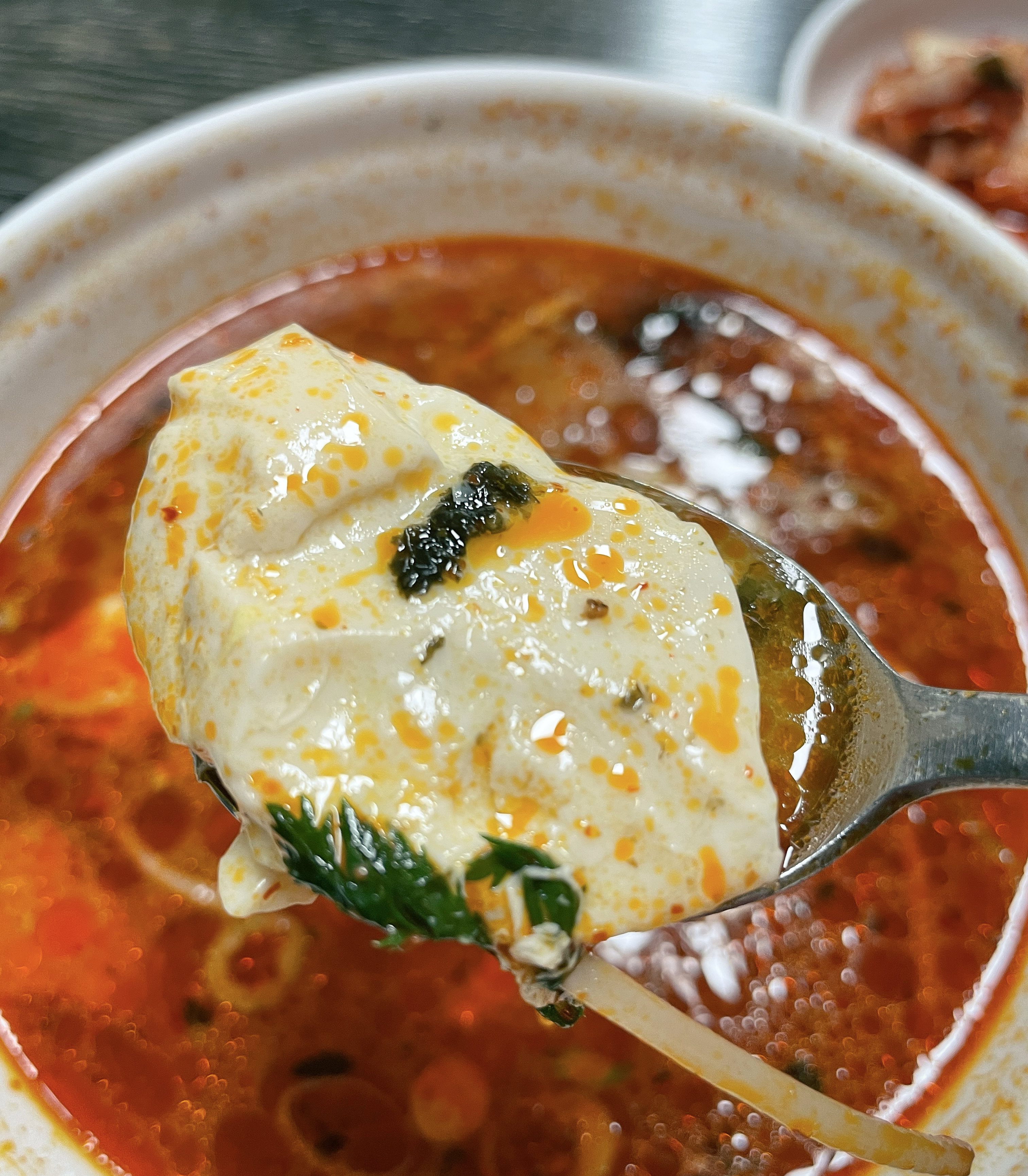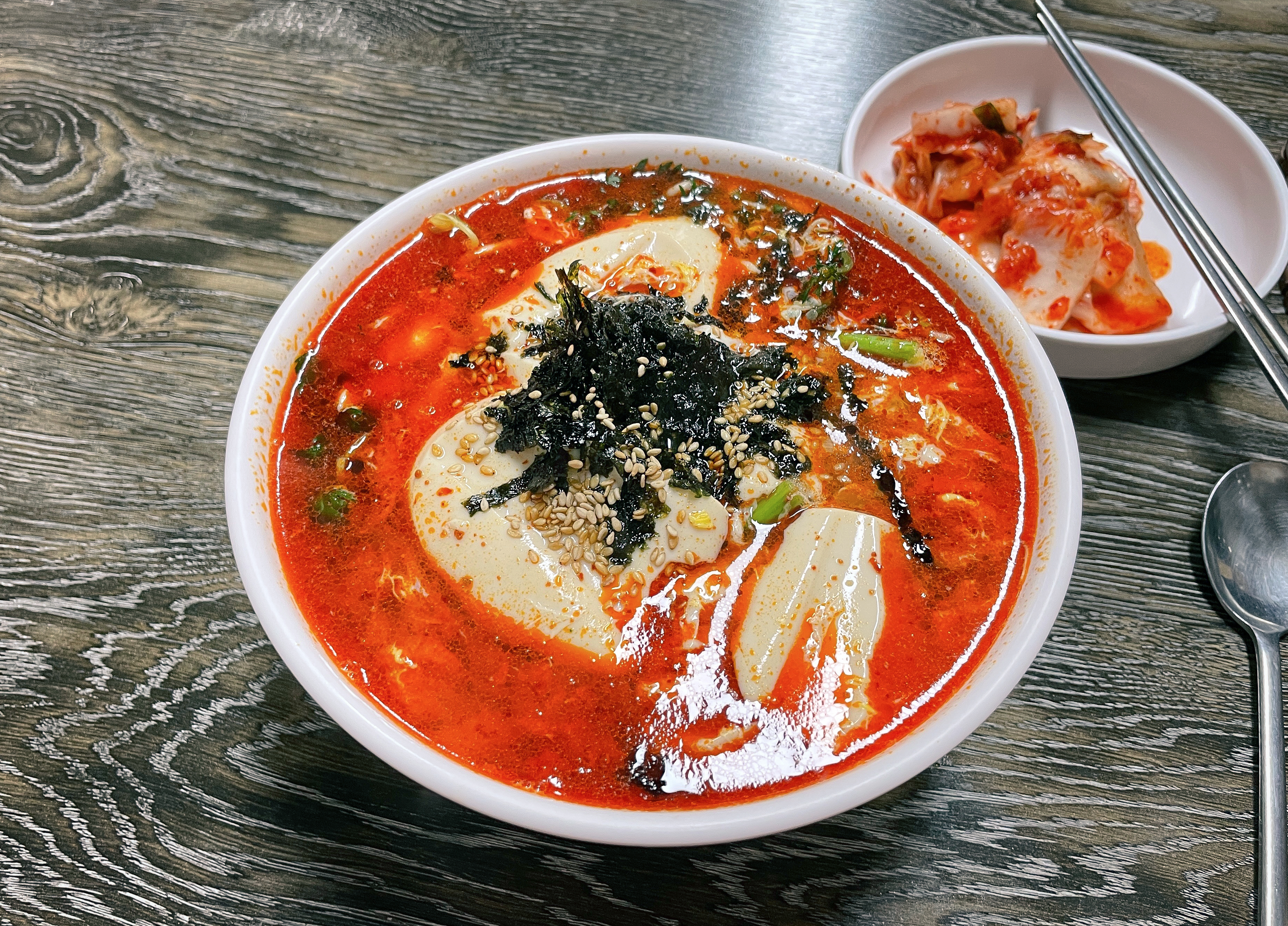 저는 순두부찌개에 국수면을 넣은 것 정도로 생각하고 방문했는데, 국물은 순두부찌개보다는 우동에 더 가까웠고, 콩나물, 쑥갓, 계란물 등이 들어가 칼칼하면서도 라이트 한 맛이 있었습니다. 면은 일본 라멘이나 짬뽕 정도 되는 굵기였습니다.