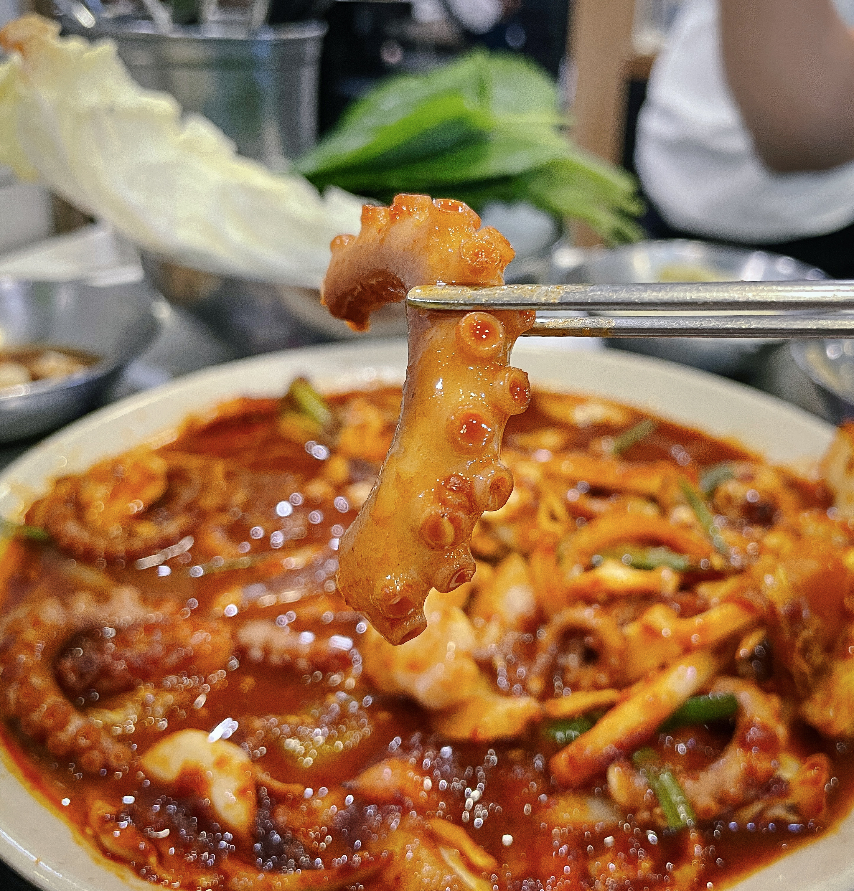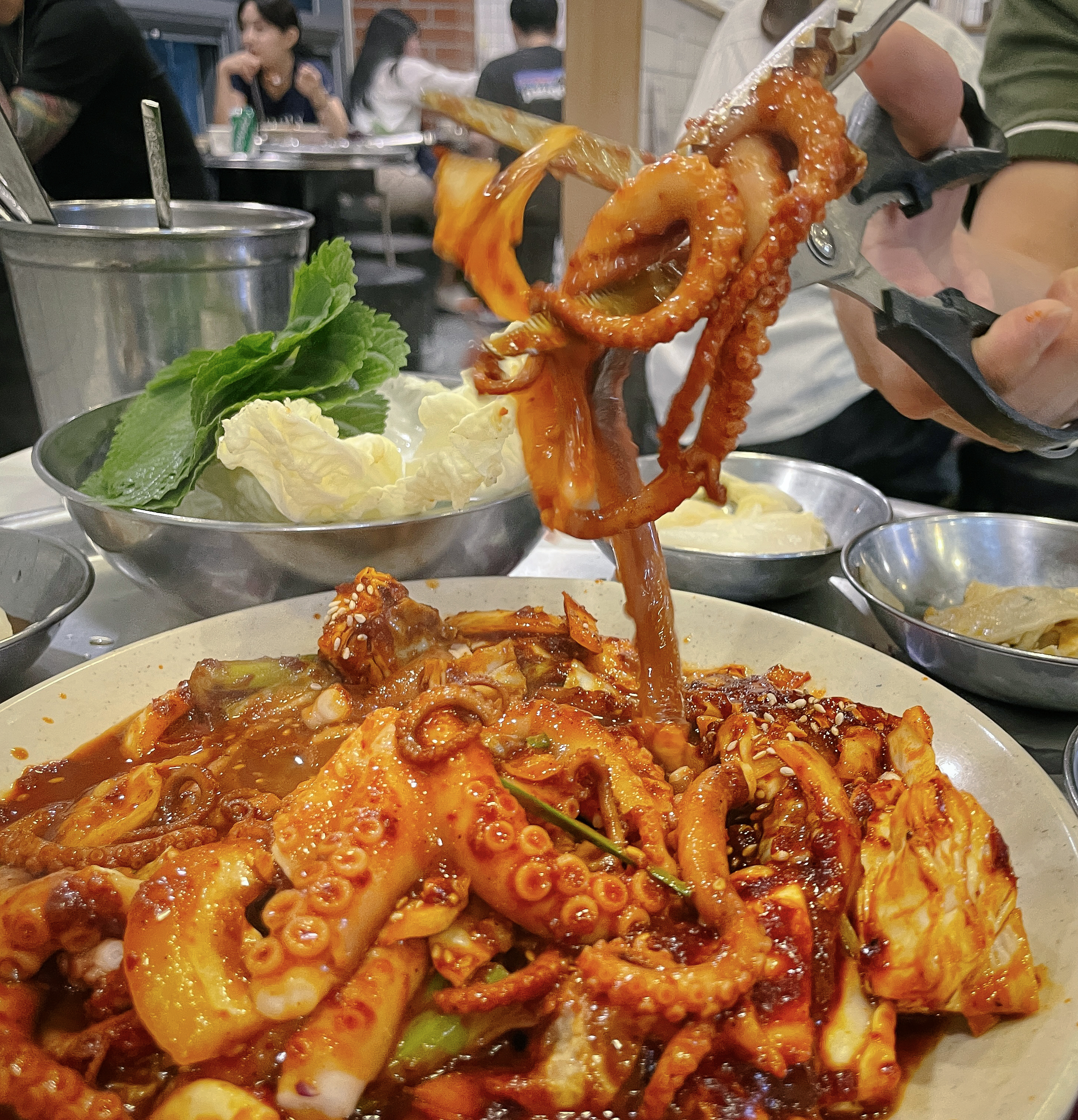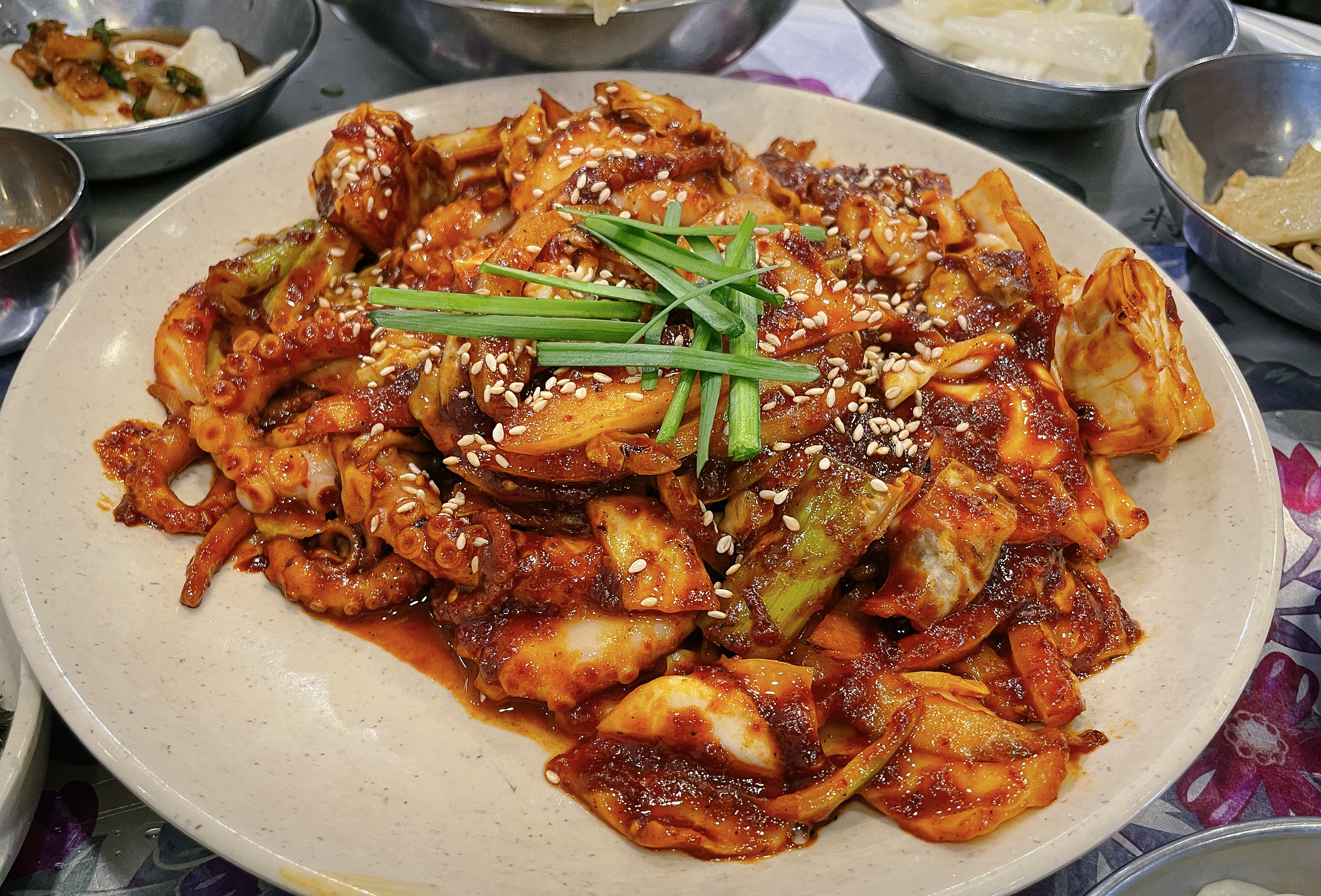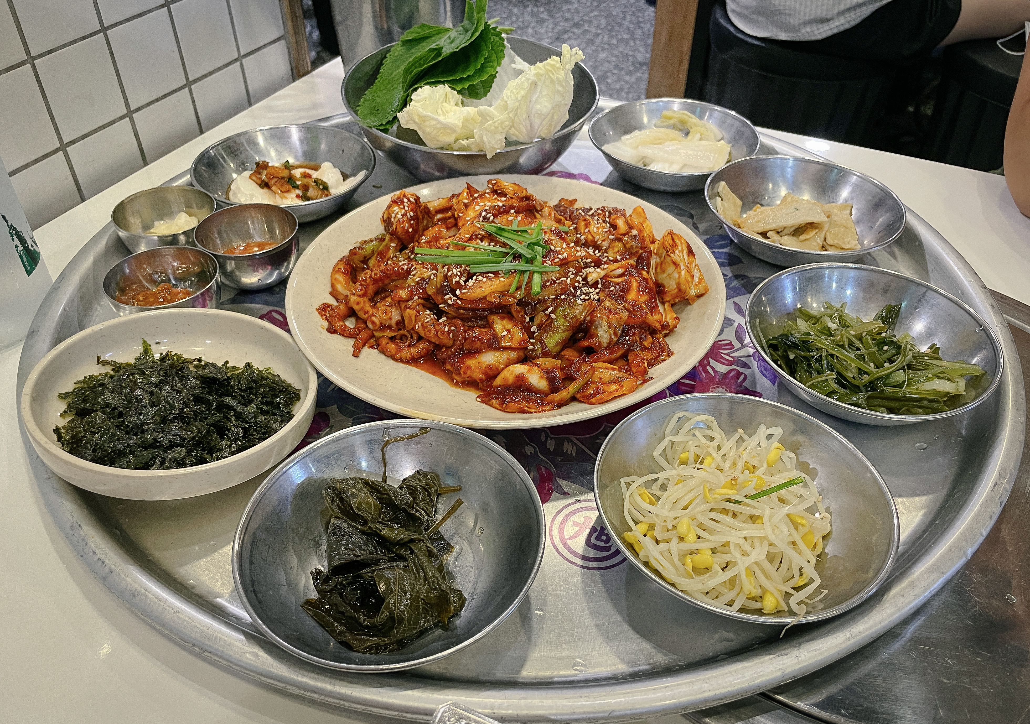 낙지볶음은 직화로 익혀서 불맛도 났고, 깔끔하게 매콤해 자꾸만 당기는 맛이 있었습니다. 낙지도 야들야들 부드러워서 식감도 괜찮았고요. 특히 낙지볶음과 보쌈, 막국수 같이 쌈을 싸 먹는 게 맛있었습니다.