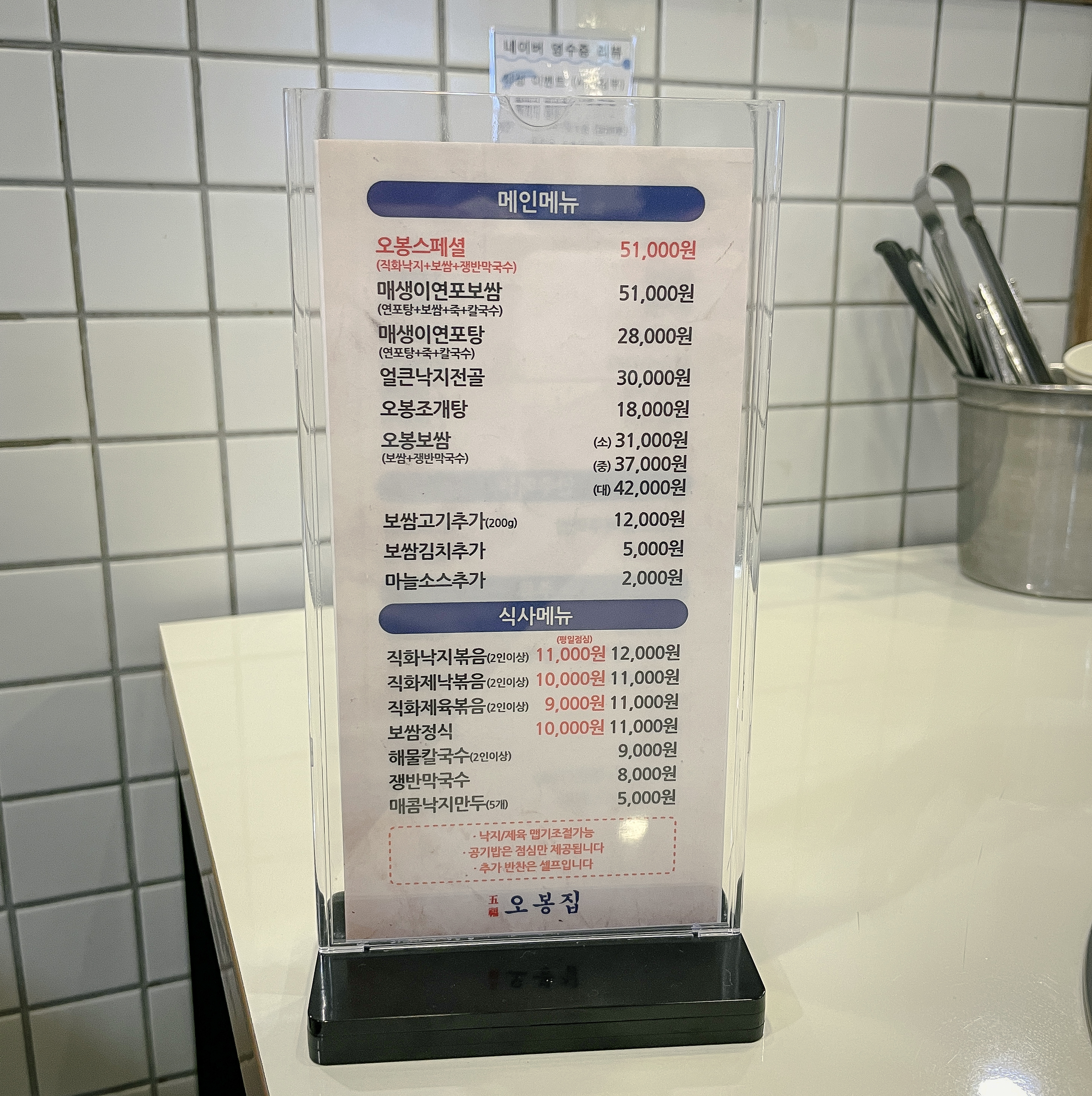 이 가게는 불맛 나는 직화 낙지볶음과 부드러운 오봉보쌈으로 유명한 가게였습니다. 제가 다녀온 곳은 오봉집 본점으로 38년 전통의 가게라고 합니다. 이곳은 원래 식사하려던 곳의 재료 소진으로 다른 곳을 찾다가 발견한 가게로, 유명한 가게라고 하더라고요.