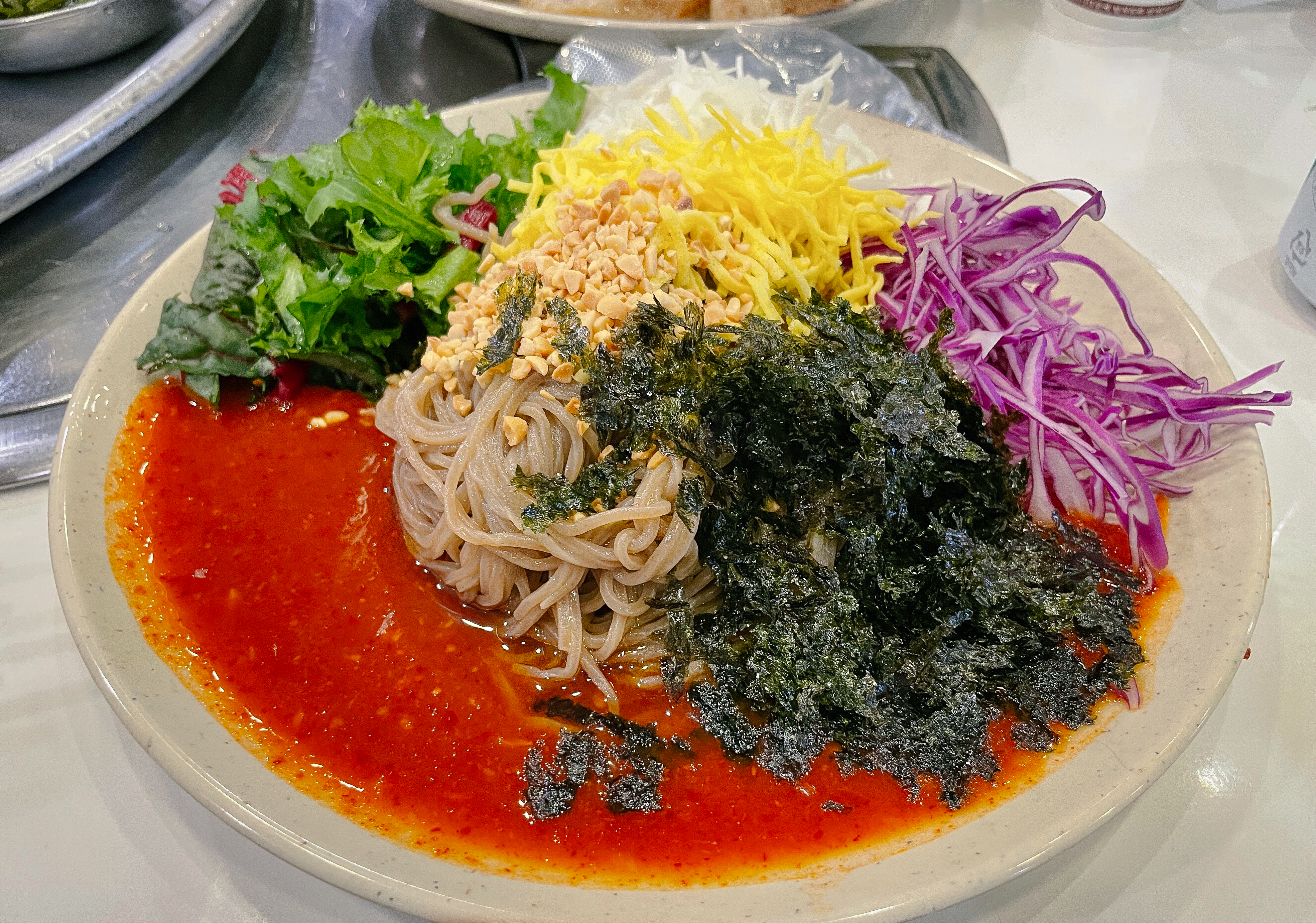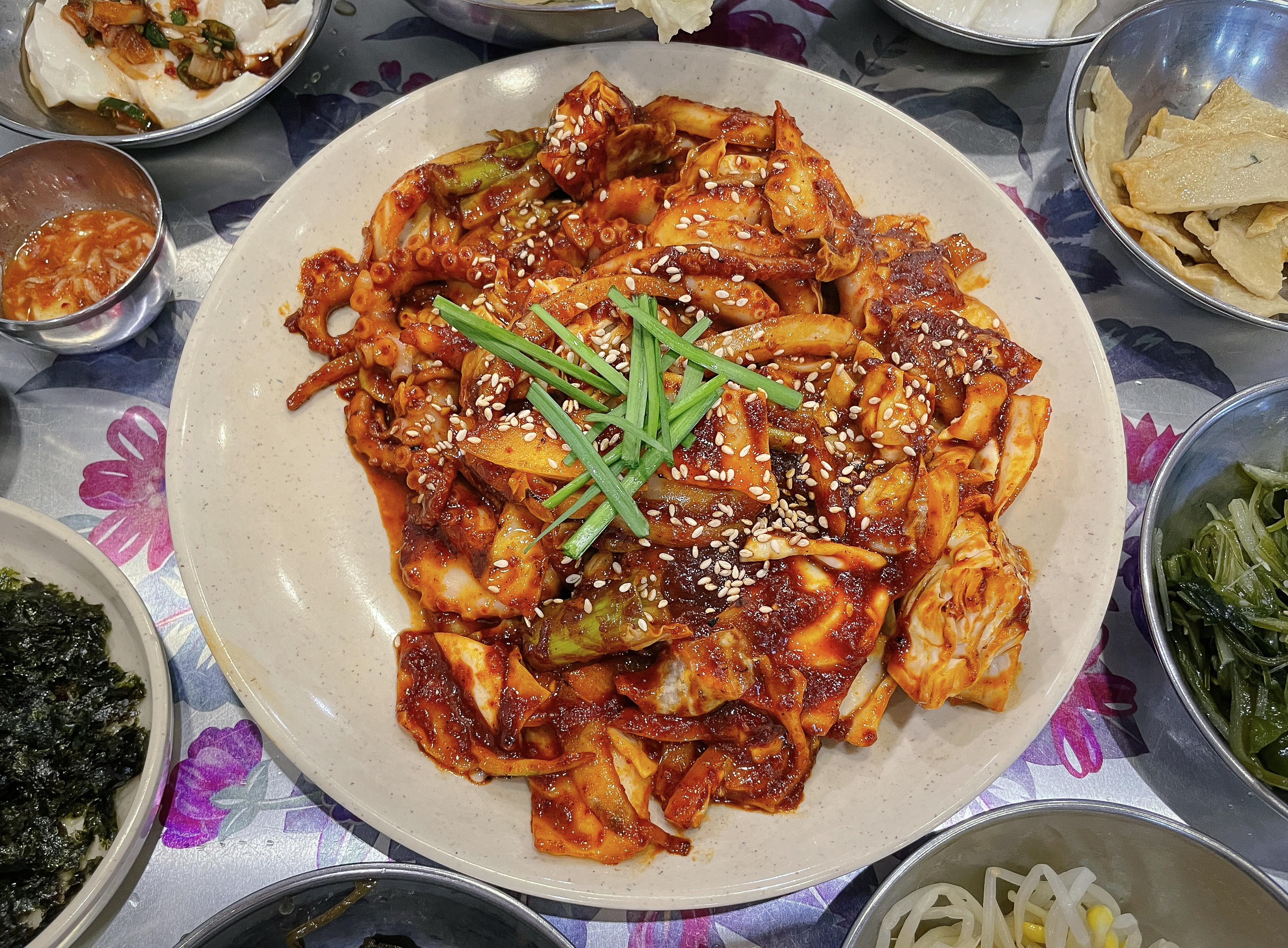 낙지볶음은 직화로 익혀서 불맛도 났고, 깔끔하게 매콤해 자꾸만 당기는 맛이 있었습니다. 낙지도 야들야들 부드러워서 식감도 괜찮았고요. 특히 낙지볶음과 보쌈, 막국수 같이 쌈을 싸 먹는 게 맛있었습니다.