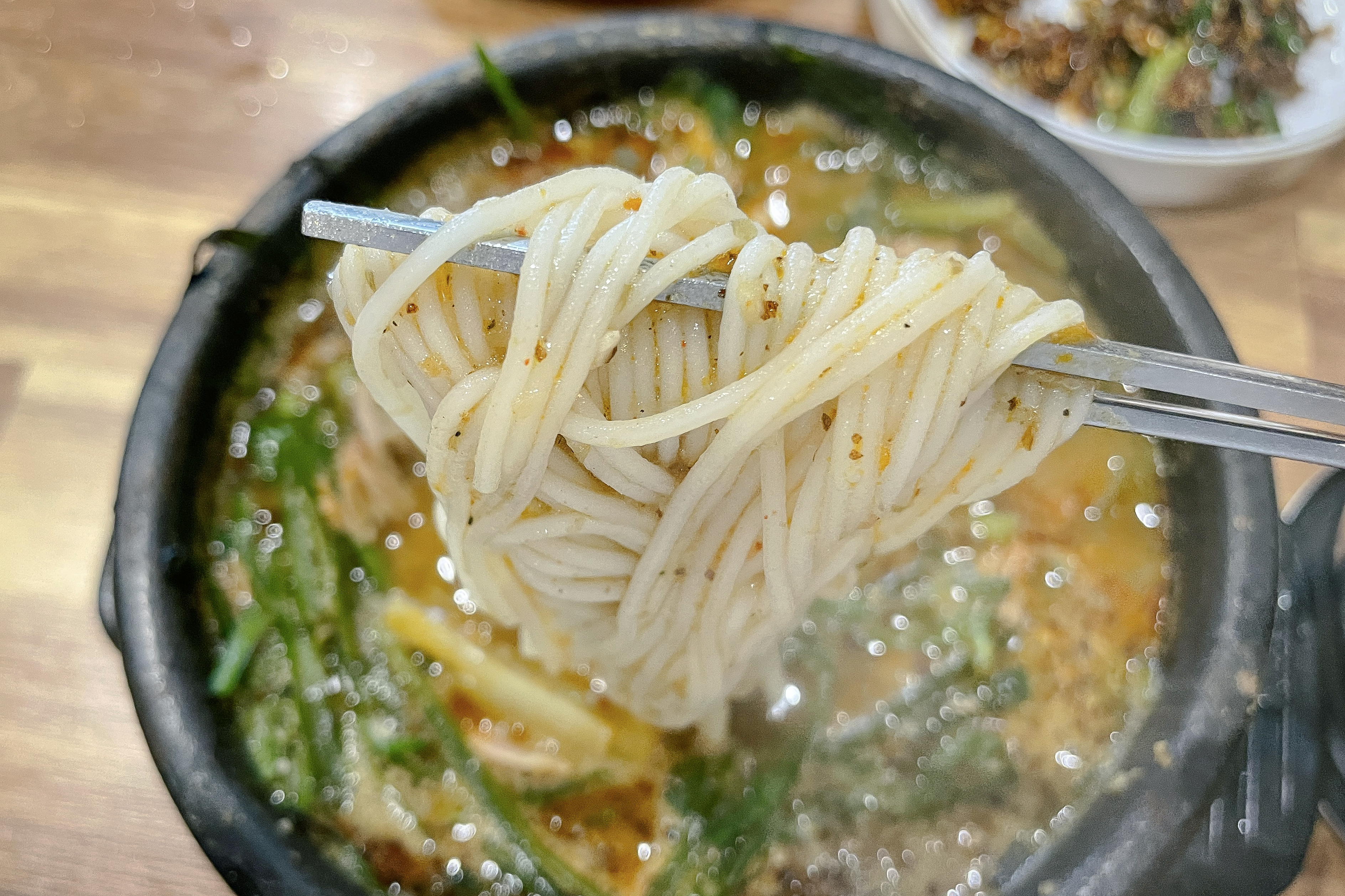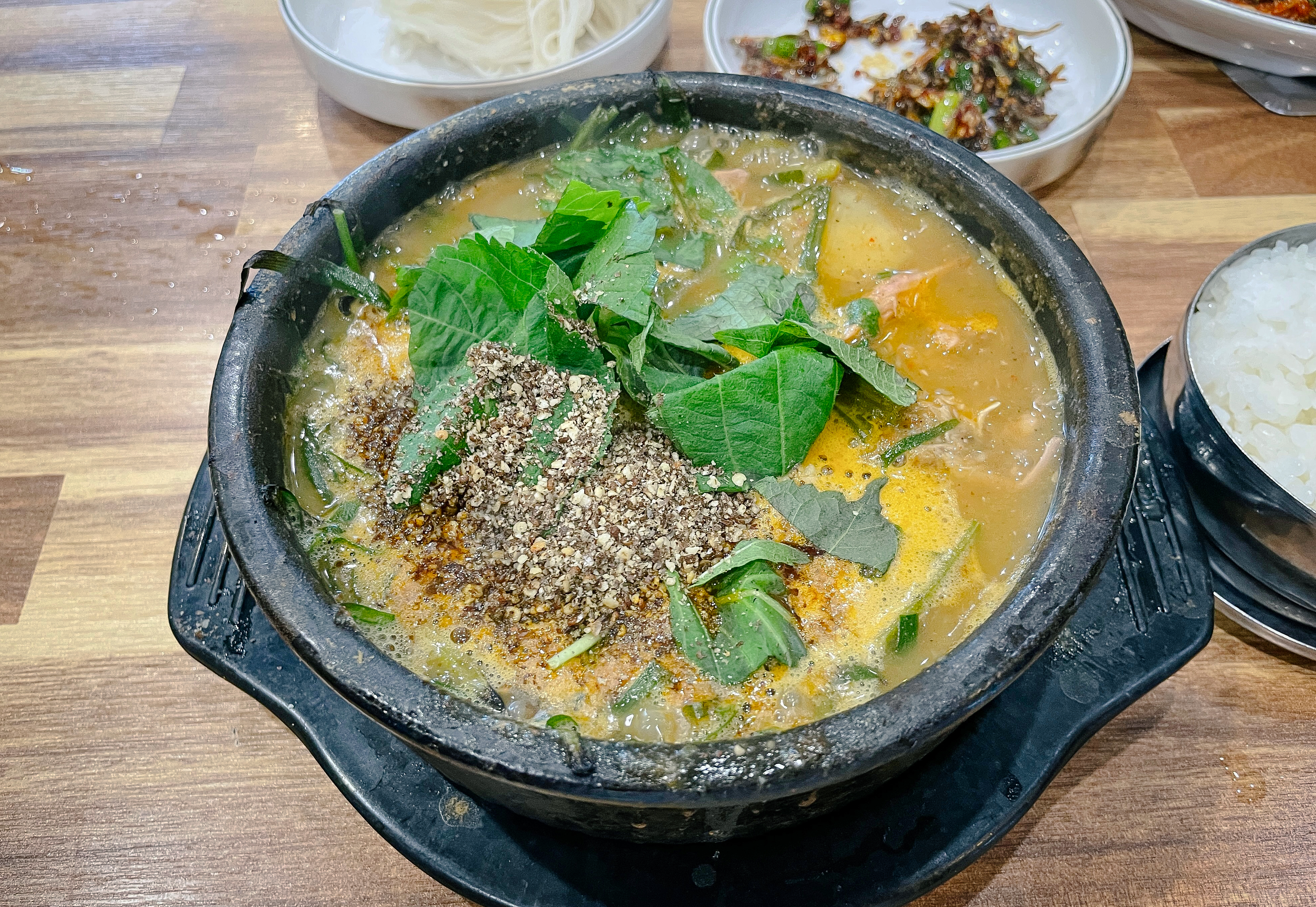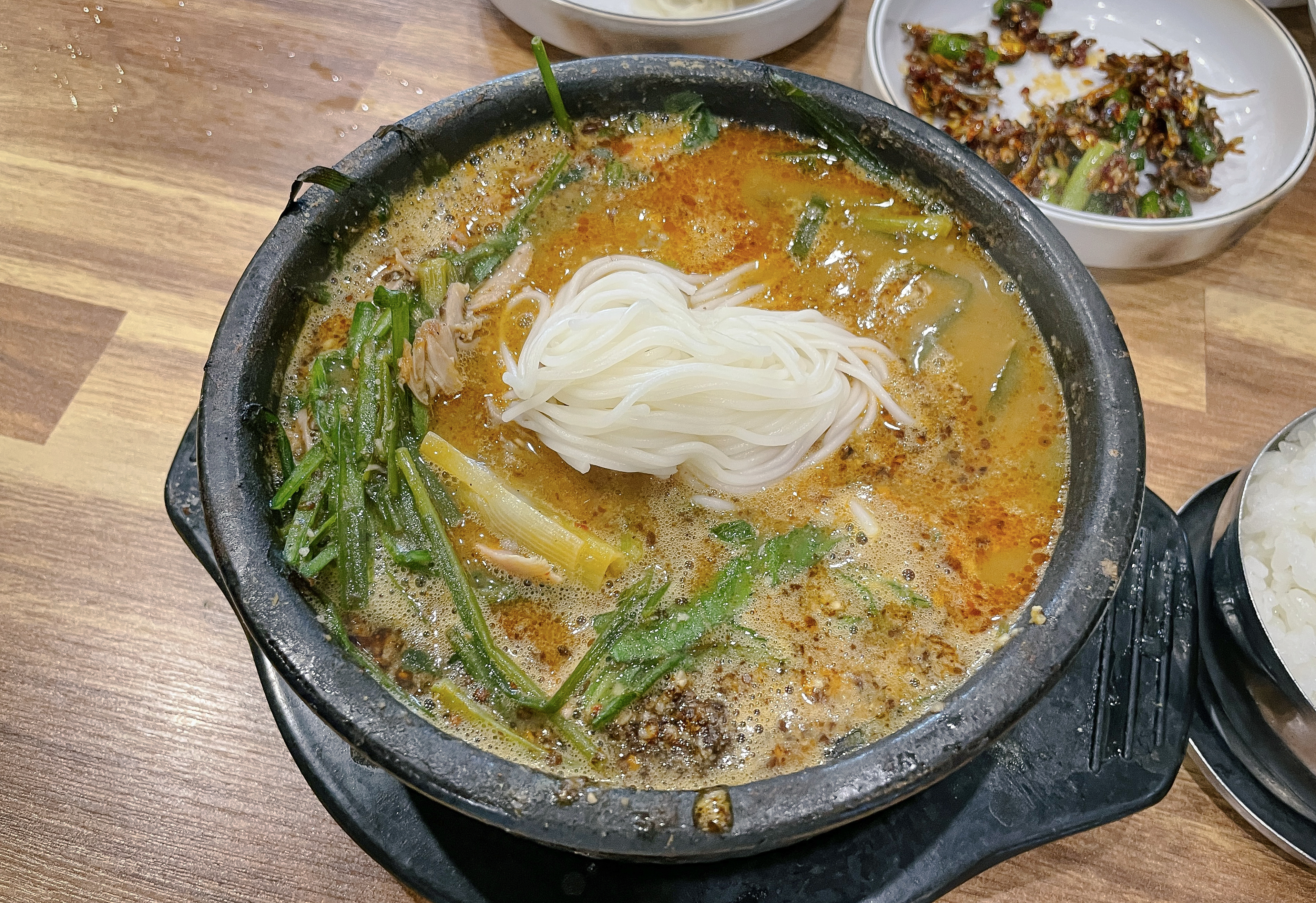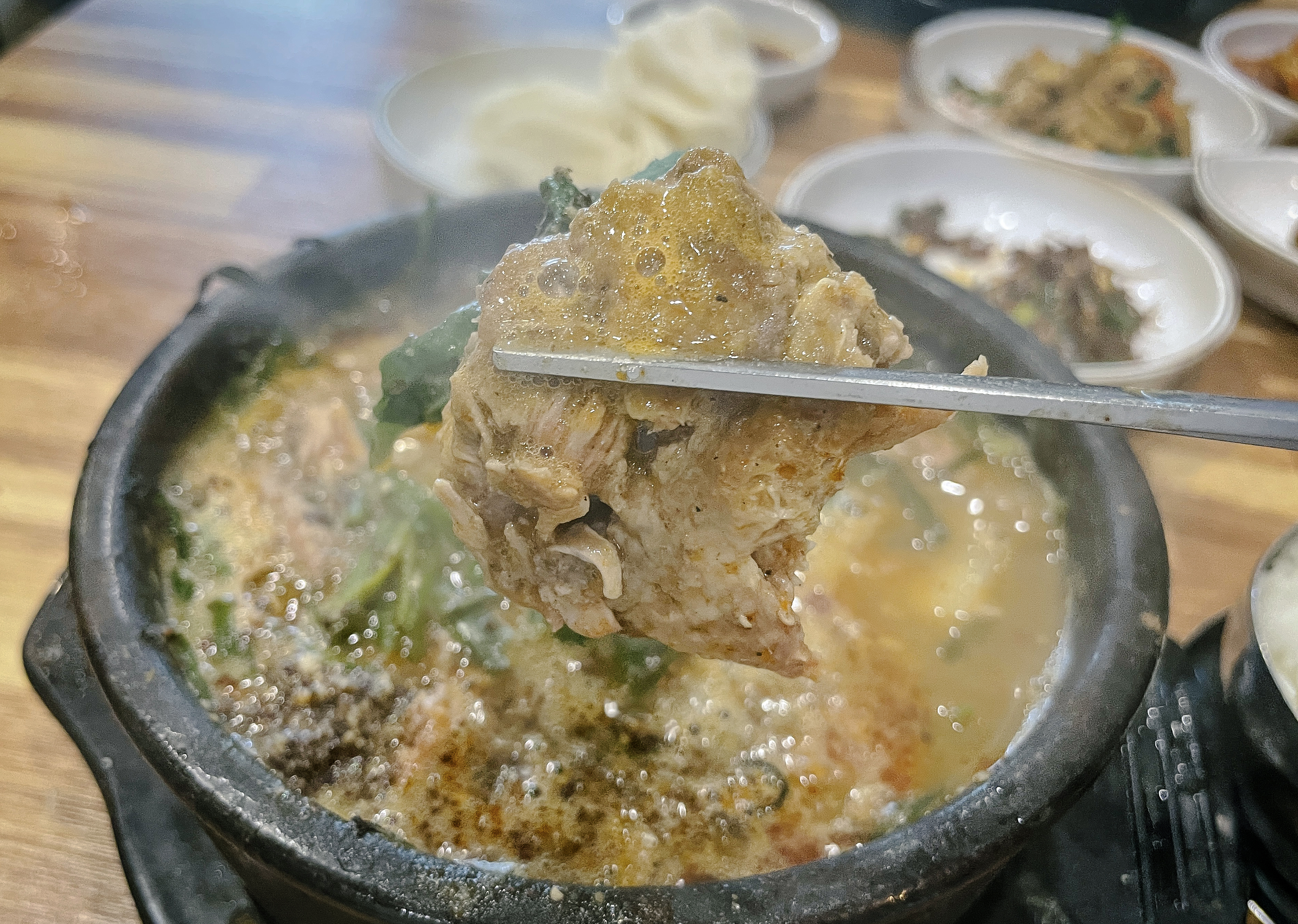 같이 나온 소면도 말아서 먹고, 국물 속의 오리고기도 건져먹고, 밥이랑 같이 말아서도 먹어보았는데 아무래도 국물이 걸쭉한 느낌이 있다 보니 밥이랑 같이 먹는 게 가장 맛있게 느껴졌던 것 같습니다. 일반 감자탕과는 다른 느낌이었지만, 오리 감자탕은 고기가 살짝 비릿한 느낌을 받을 수도 있는데 여러 가지 향신료로 잘 잡아서 크게 느껴지지는 않았습니다.