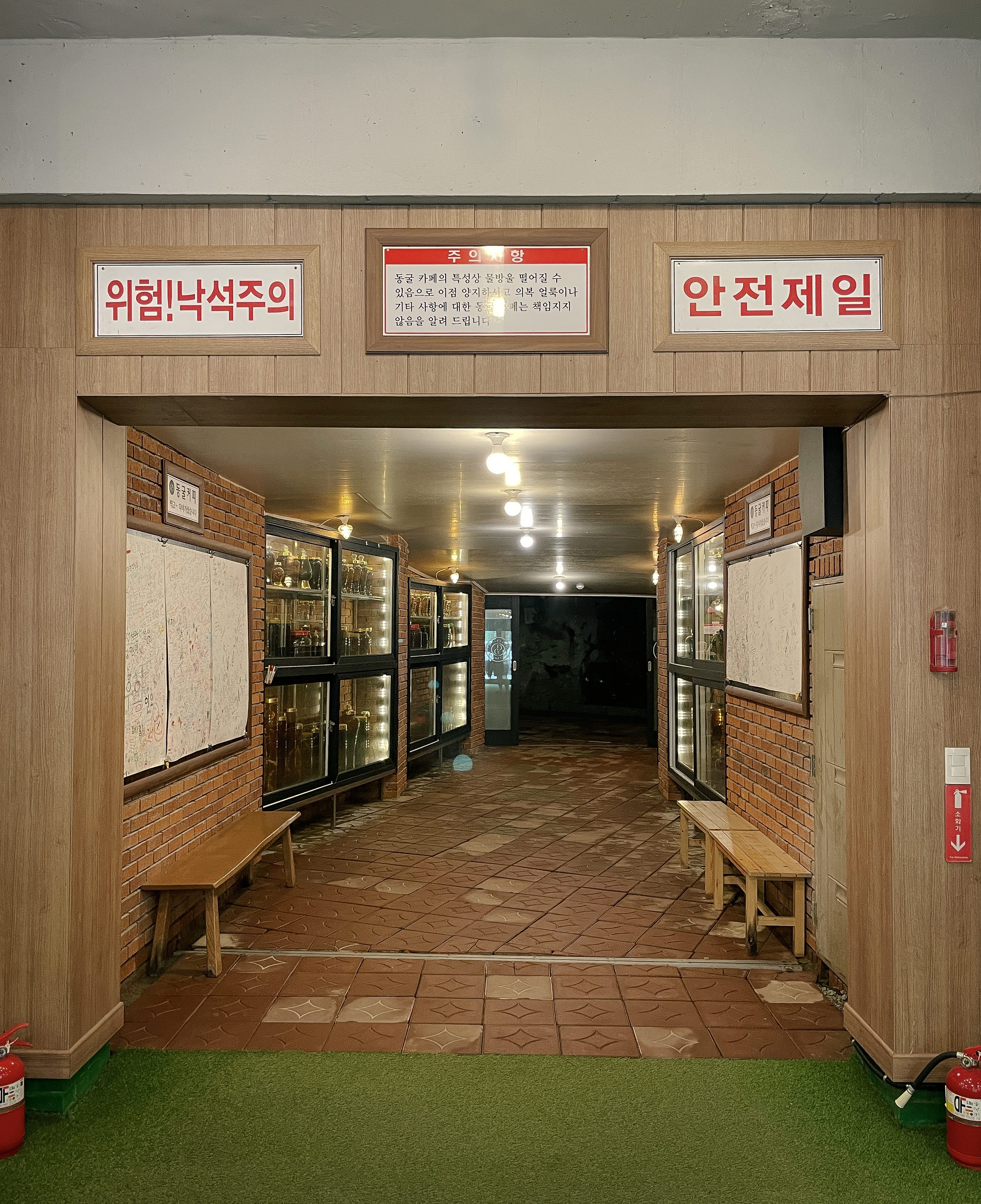 ※ 카페 곳곳에는 낙석주의라는 주의사항이 적혀있었고, 그 밖에 동굴에서 떨어지는 물방울로 인한 의복 얼룩이 생기는 경우 카페가 책임지지 않는다는 문구가 적혀있었습니다.