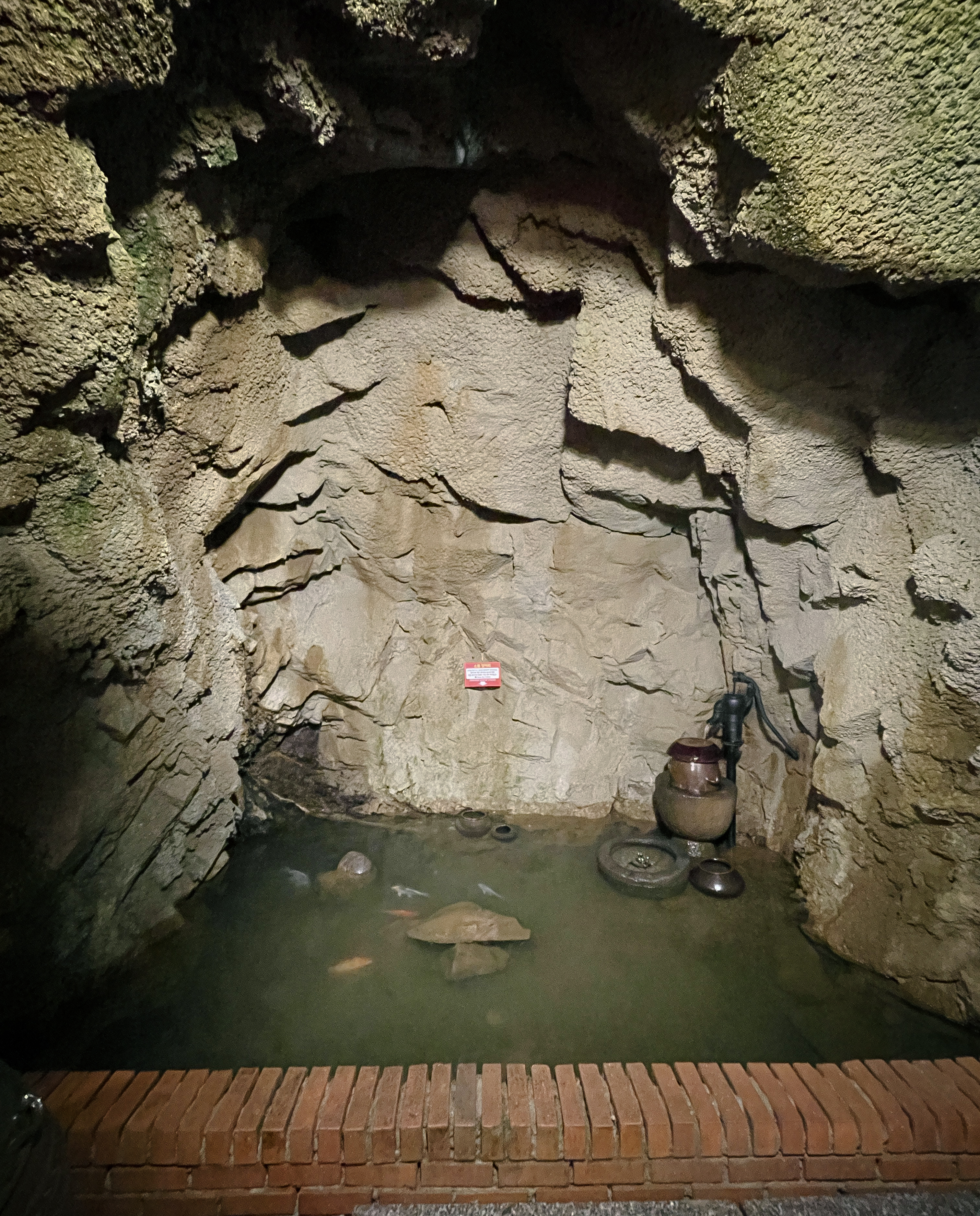 동굴 내부에 작은 연못도 있었는데, 물고기들이 헤엄치고 있었습니다. 제가 방문했을 때 기준으로 워낙 외진 곳에 있는 카페라 규모에 비해 손님수는 적었는데, 이색적인 분위기 때문에 일부러 이 가게를 찾는 손님들이 계시는 듯 보였습니다. 저 또한 동굴만이 주는 독특한 풍경을 보기 위해 이 카페에 방문했는데, 동굴안에서 부담 없는 가격에 커피를 마시며 체험할 수 있다는 점에 한 번 이용해보시라고 추천드리고 싶습니다.