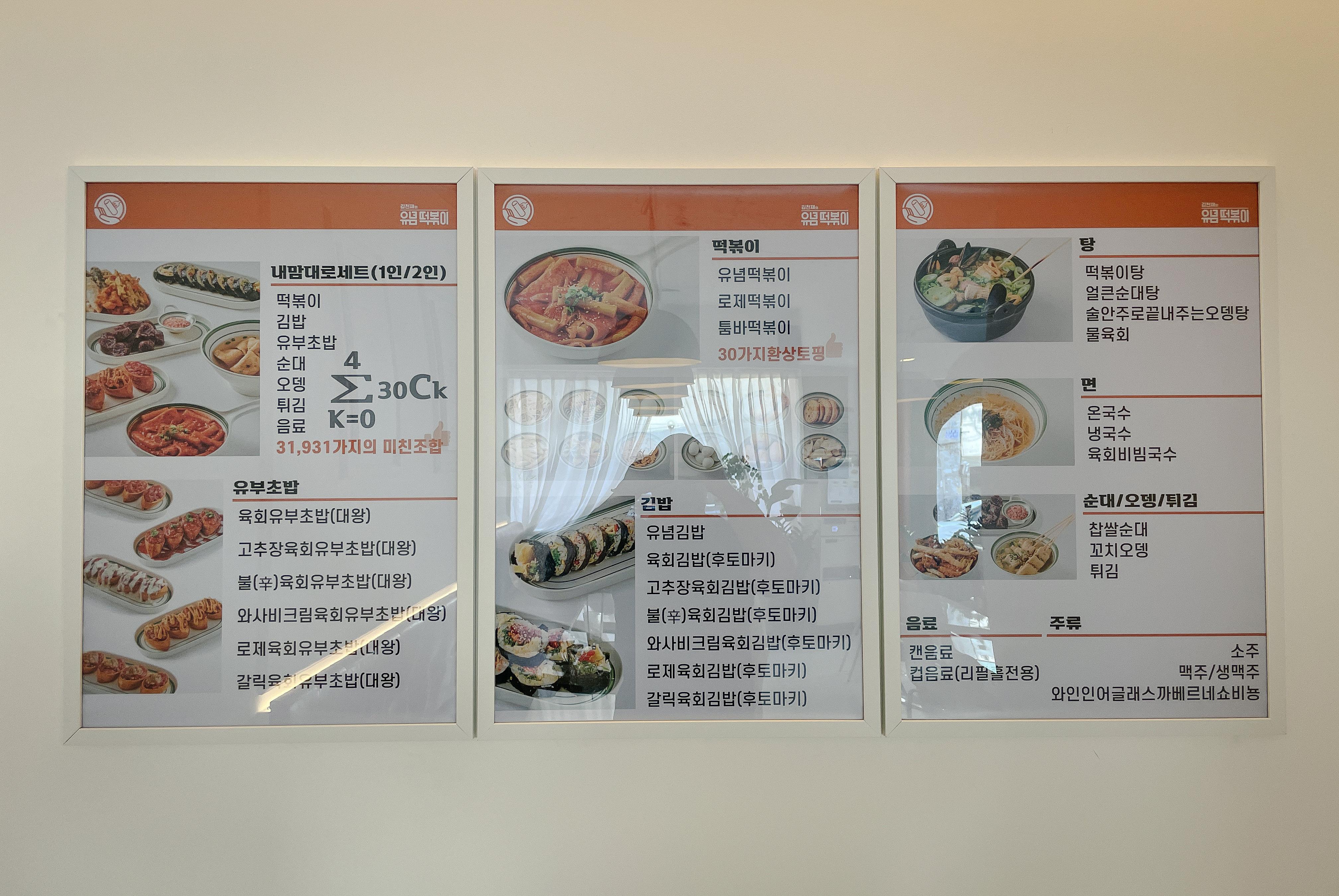김천재의 유념떡볶이 메뉴는 유념떡볶이, 로제떡볶이, 툼바떡볶이가 있었고, 육회유뷰초밥, 육회김밥, 떡볶이탕, 얼큰순대탕, 물육회, 온국수, 냉국수, 육회비빔국수, 찹쌀순대, 꼬치오뎅, 튀김,떡볶이피자 등이 있었습니다. (*육회가 들어간 메뉴는 띵버거, 유념떡볶이 모두 공유하는 모양이다.)