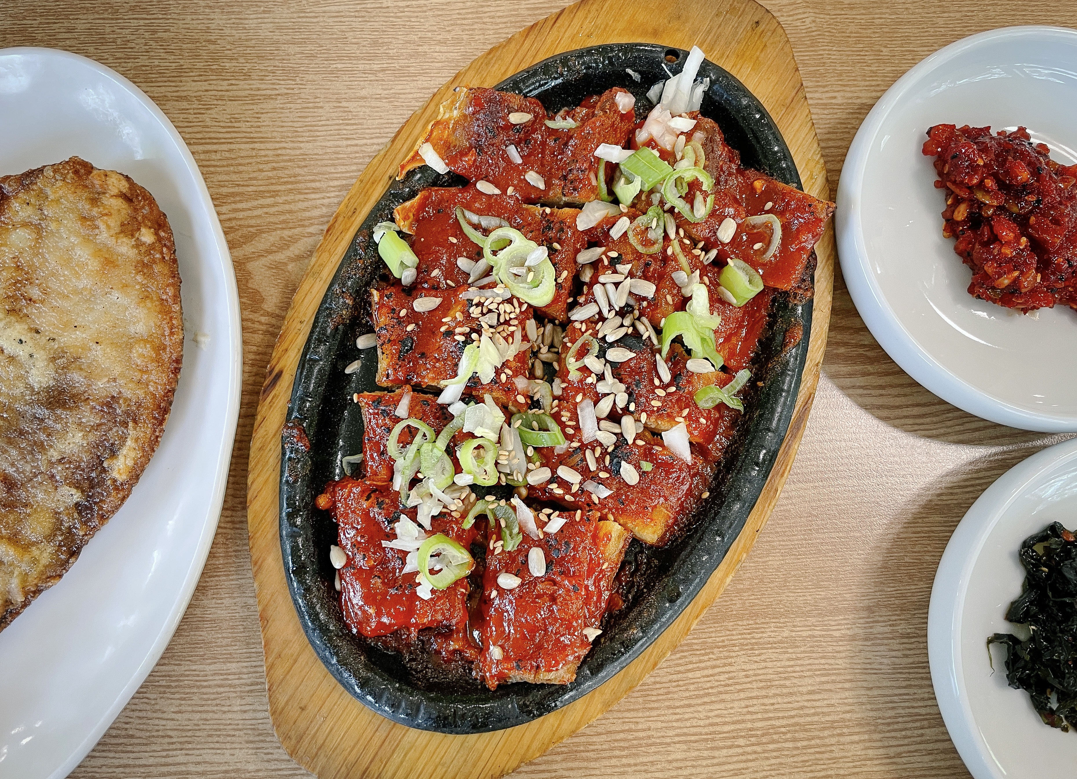 황태국밥은 제가 평소 먹던 북엇국과는 다른 느낌의 국밥이었는데, 누런 빛깔의 국물이 누룽지 비슷한 느낌을 주었습니다. 콩나물과 황태 조각이 조금씩 들어있었는데, 국물은 점도가 있는 게 진득하면서도 고소한 맛이었고, 특유의 감칠맛이 있어서 계속 당기는 맛이었습니다. 북어구이는 고추장 양념이었는데, 특별히 맛있다고 추천할 정도는 아니었지만, 밥반찬으로 곁들이기에는 괜찮았습니다.