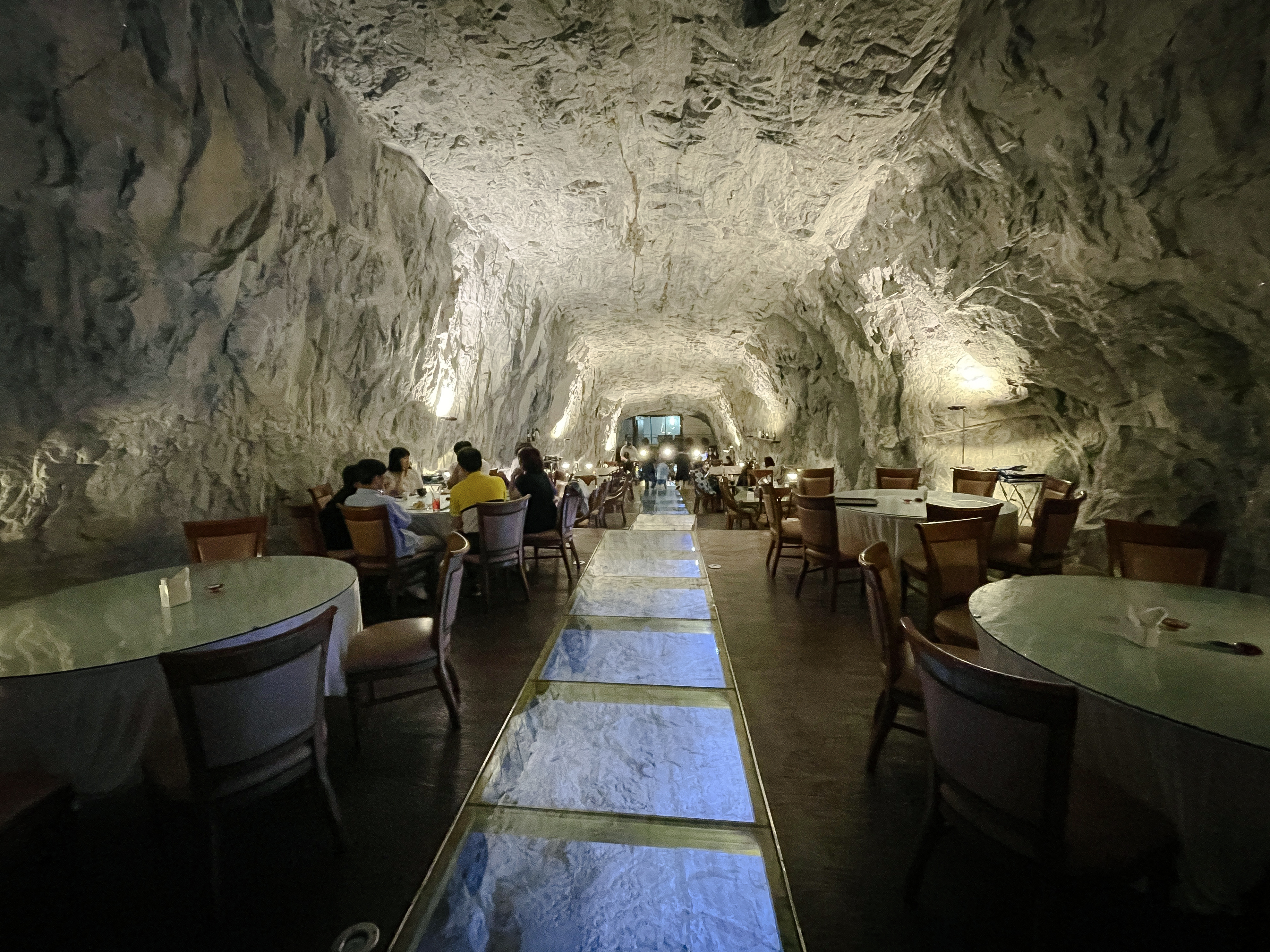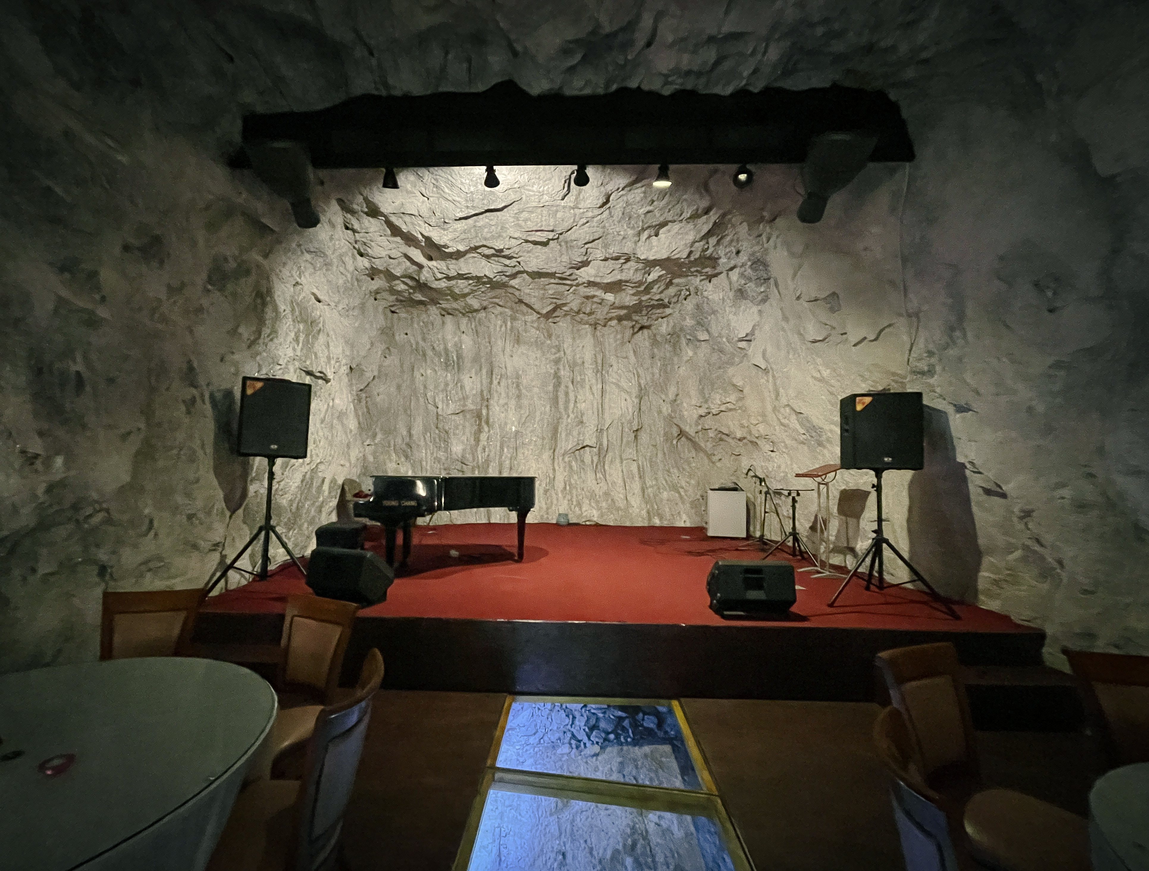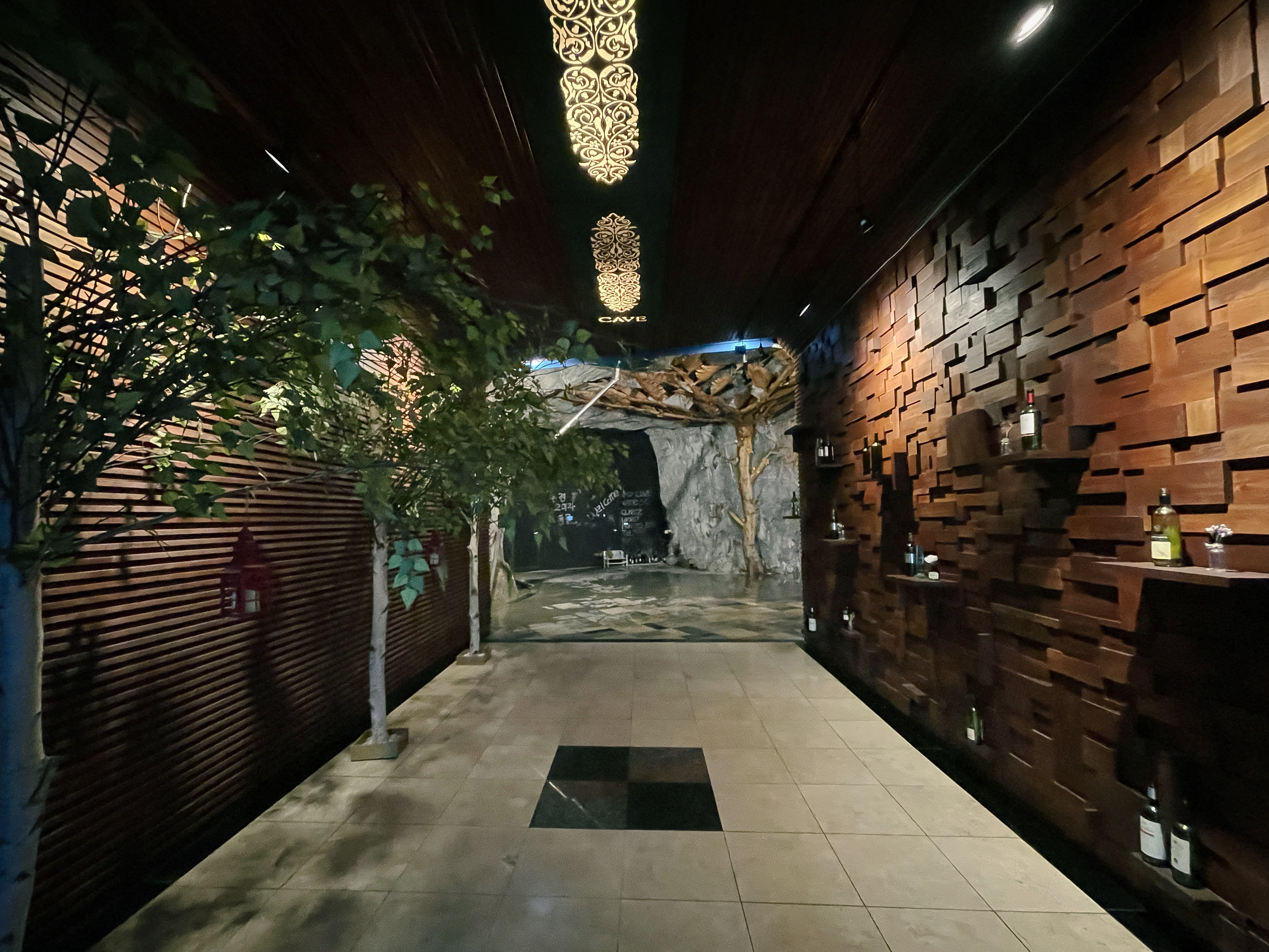 이 공간은 동굴 속에 은은한 조명들과 크고 널찍한 테이블에 나무로 층계를 만들어두어 고급스러운 레스토랑 느낌이 났습니다. 가장 높은 곳에는 간단한 공연을 할 수 있는 무대도 마련되어 있었는데, 이곳 스피커를 통해 나오는 음악은 동굴의 특이한 구조에 의해 공간을 울리고 있었습니다.