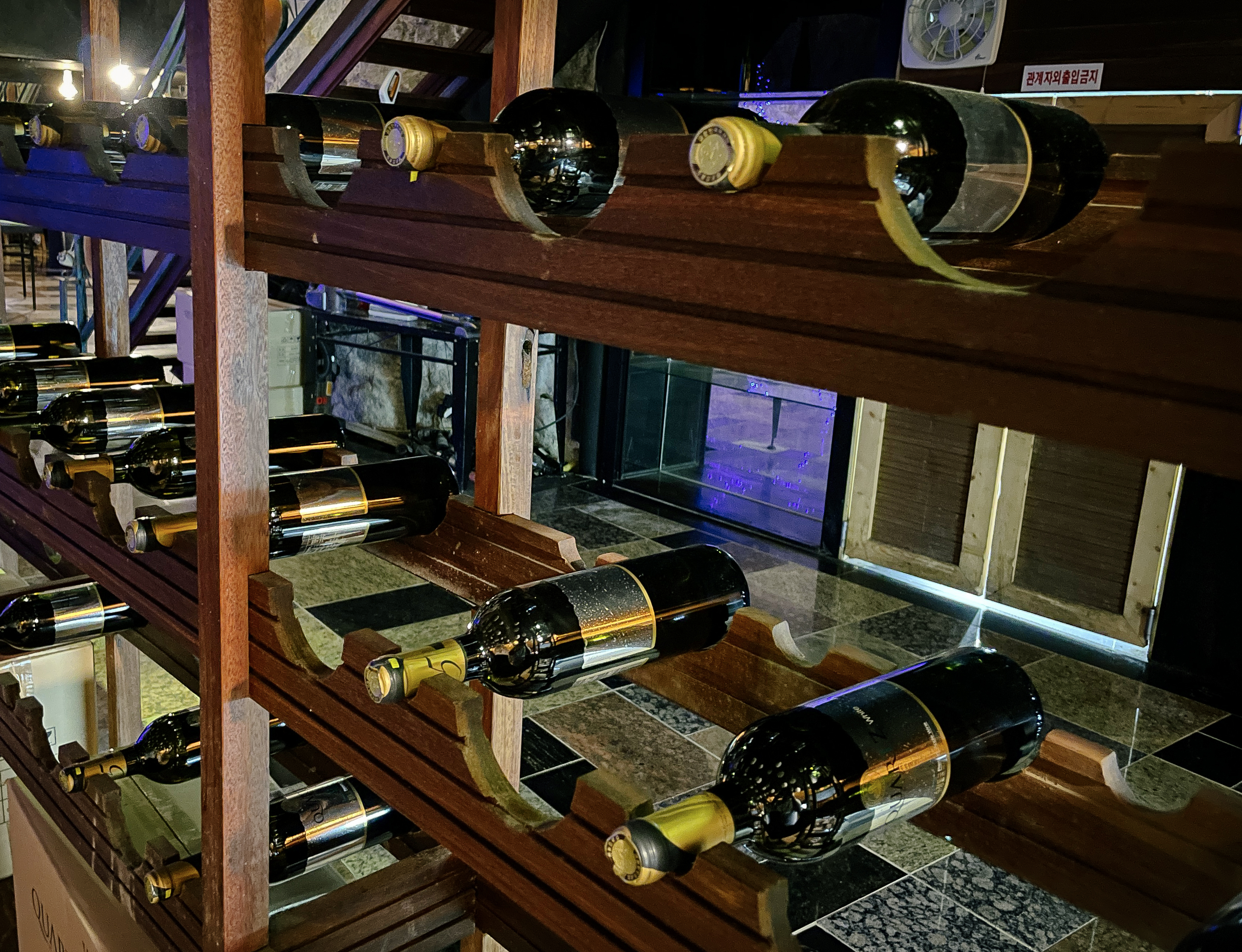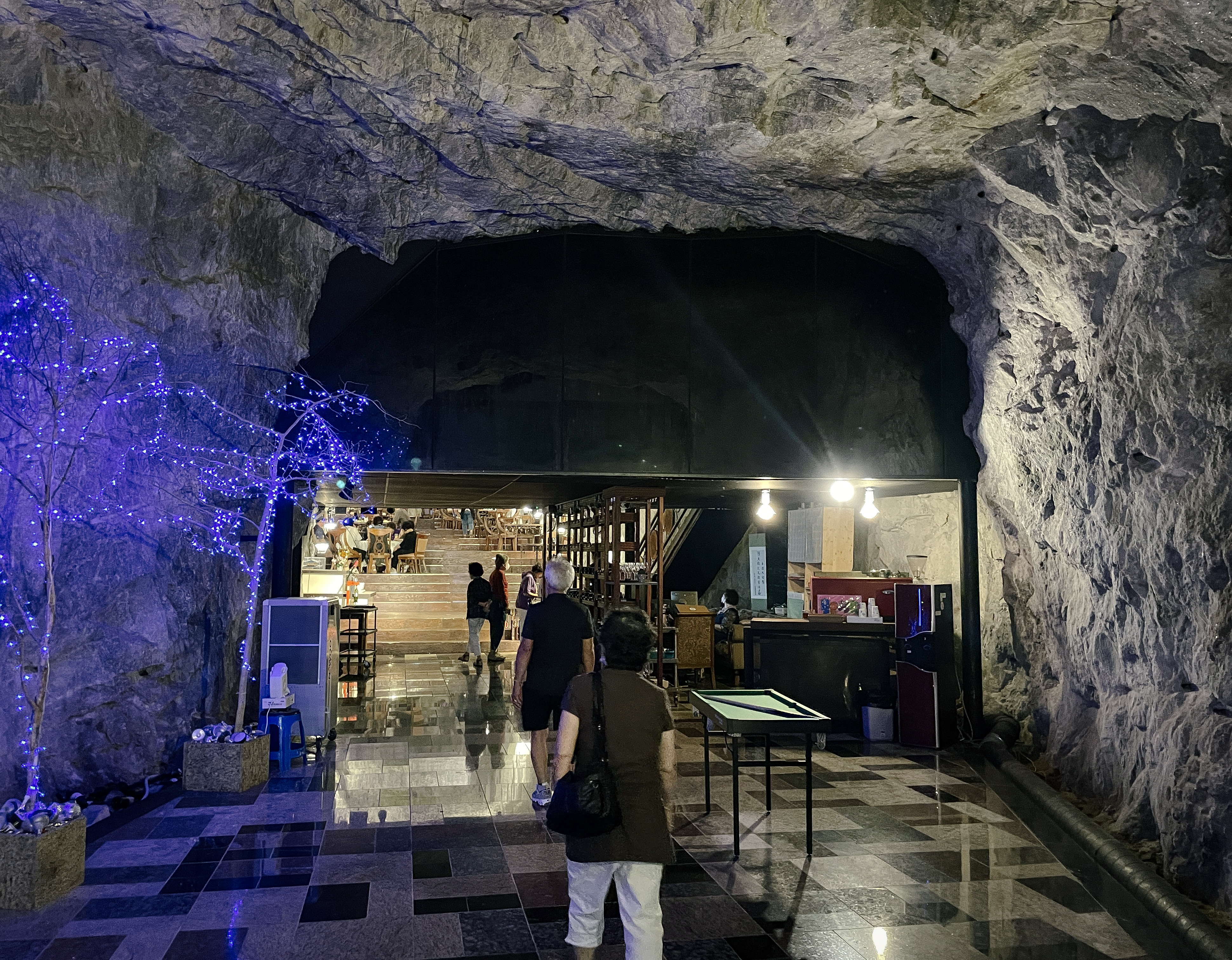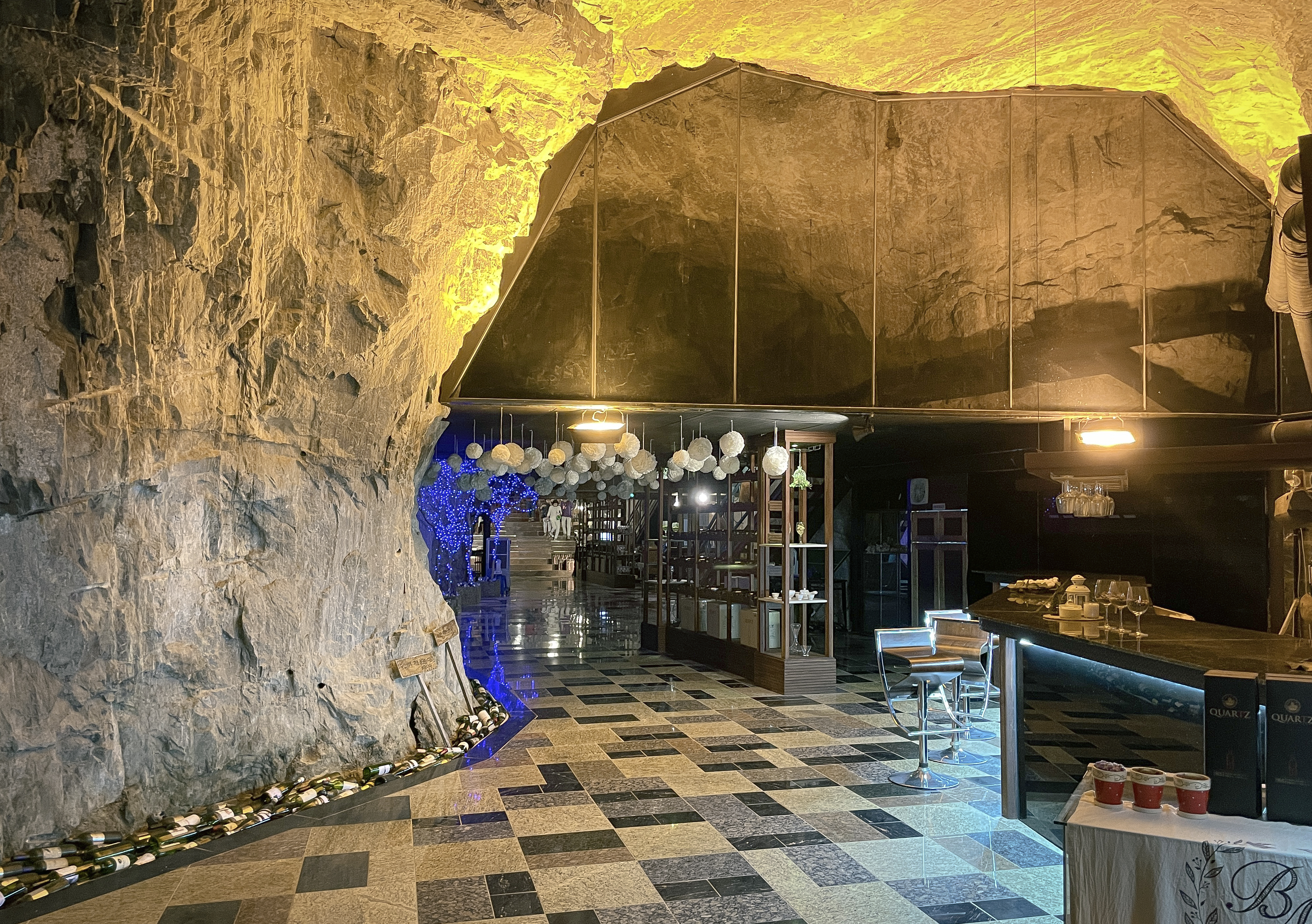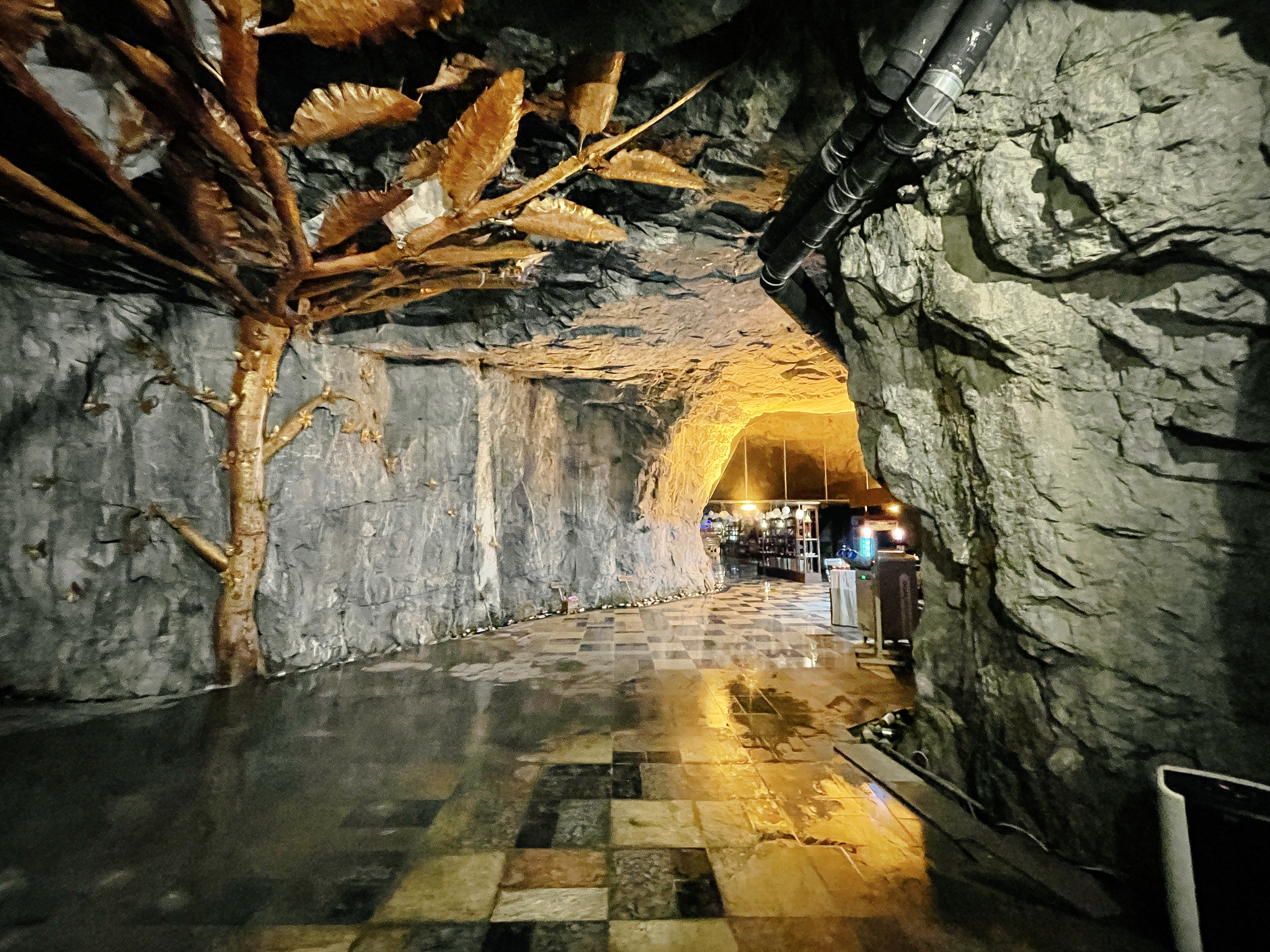 이 공간은 동굴 속에 은은한 조명들과 크고 널찍한 테이블에 나무로 층계를 만들어두어 고급스러운 레스토랑 느낌이 났습니다. 가장 높은 곳에는 간단한 공연을 할 수 있는 무대도 마련되어 있었는데, 이곳 스피커를 통해 나오는 음악은 동굴의 특이한 구조에 의해 공간을 울리고 있었습니다.