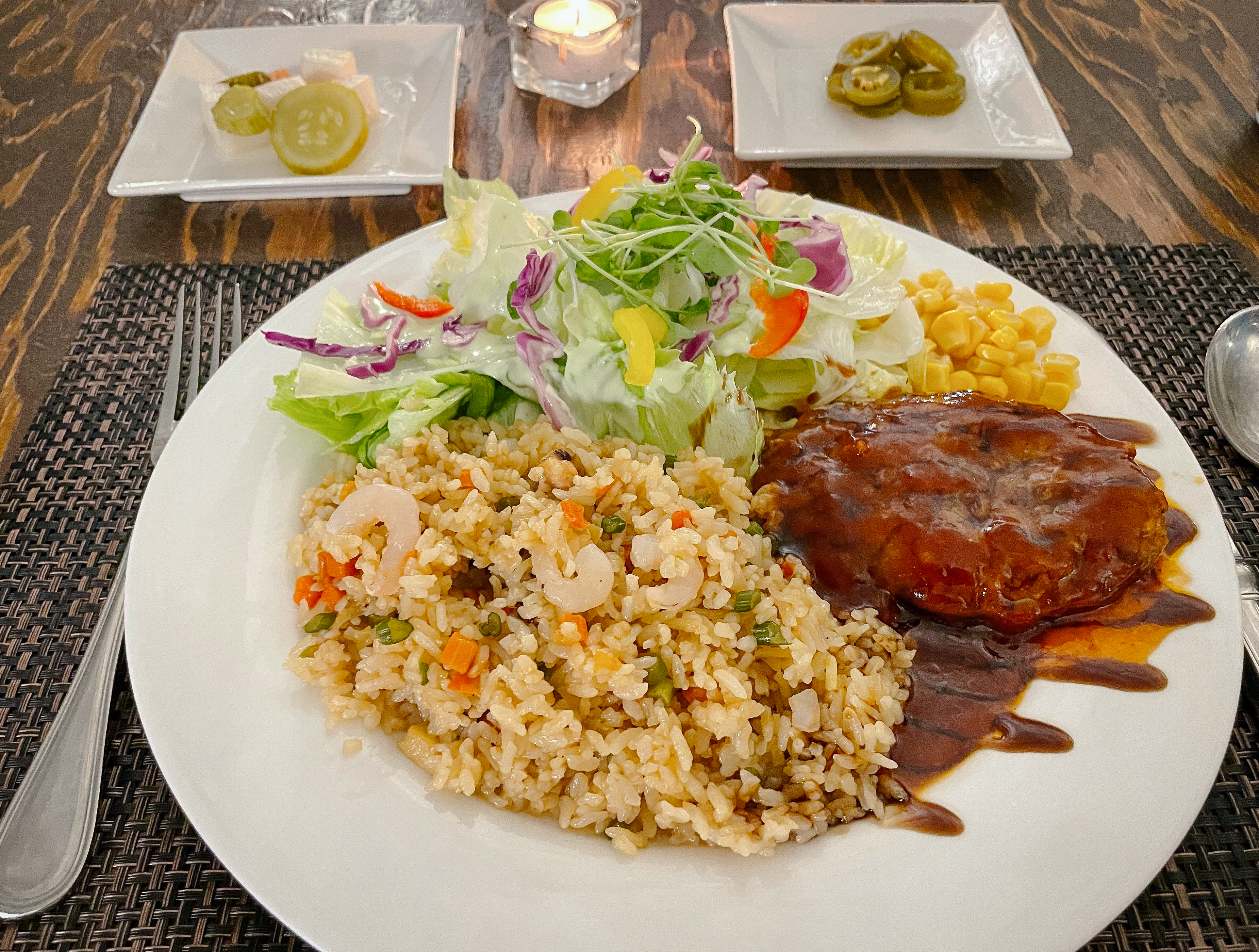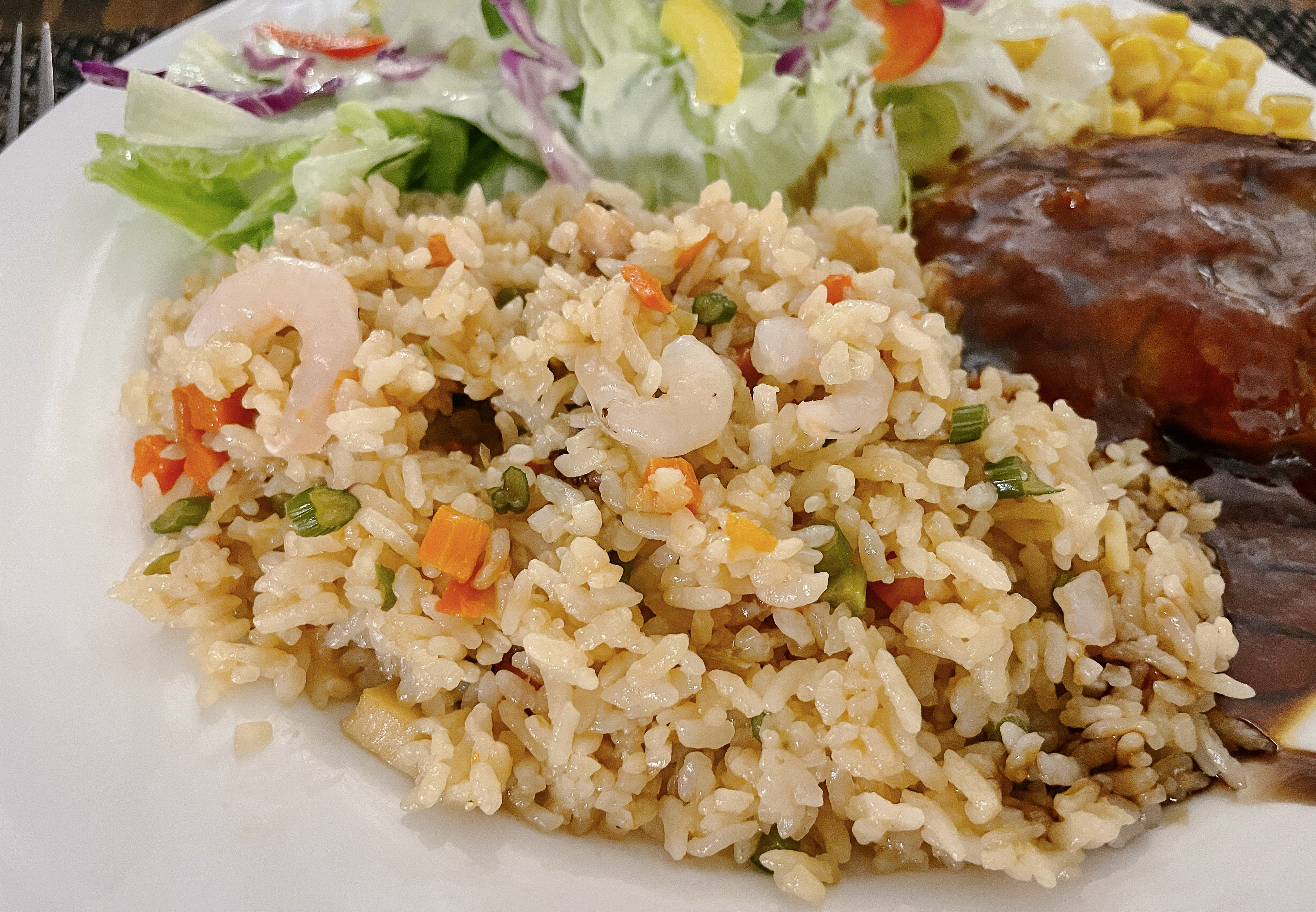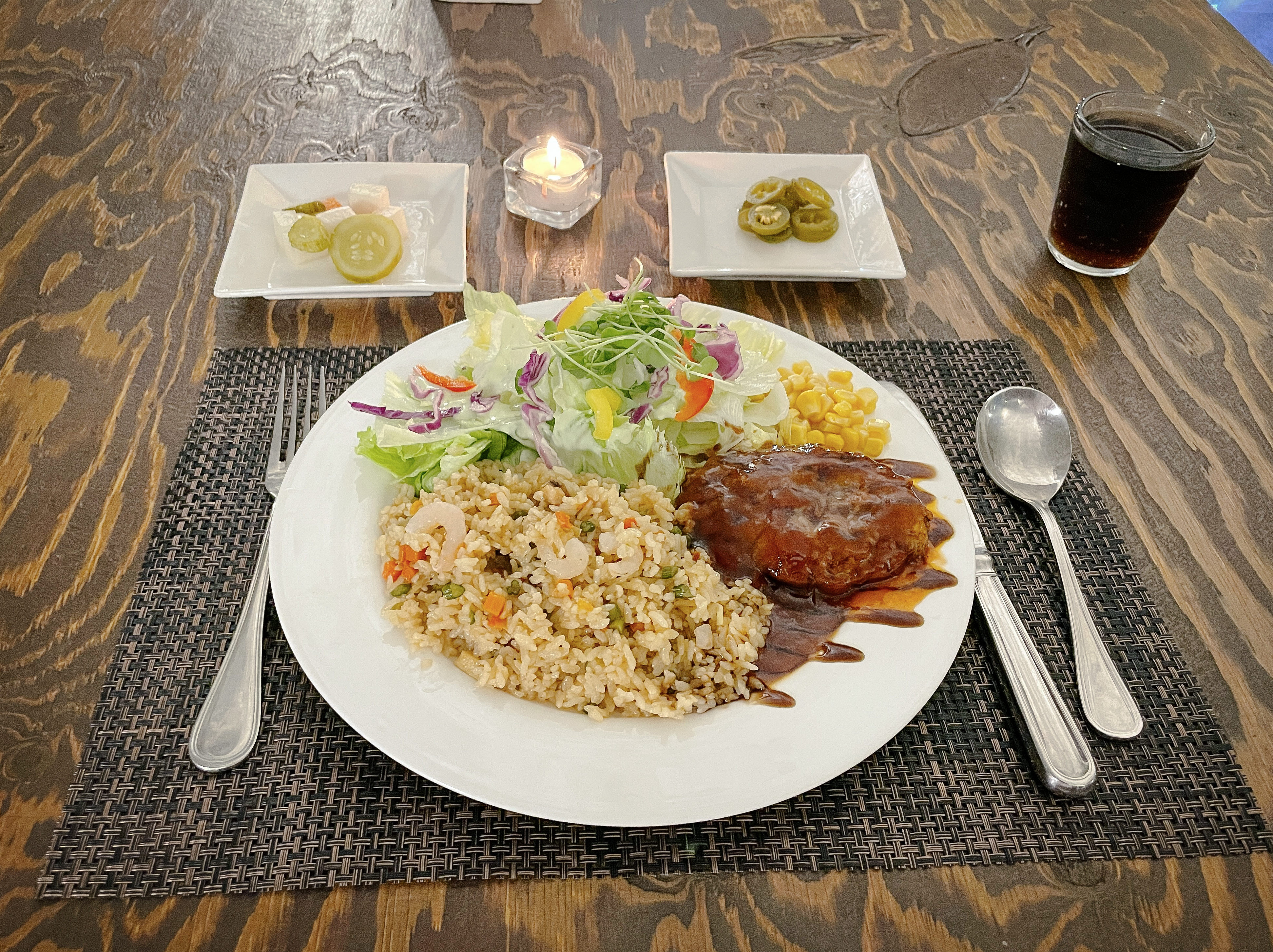 제가 주문한 메뉴인 비프스테이크해물볶음밥은 탄산음료를 함께 제공하고 있는 메뉴였는데, 잔으로 나오는 콜라는 김이 좀 빠졌는지 탄산의 톡 쏘는 맛은 없더라고요. 메뉴의 구성은 해물볶음밥, 함박스테이크, 콘샐러드, 양배추샐러드, 피클 등으로 되어있었습니다.